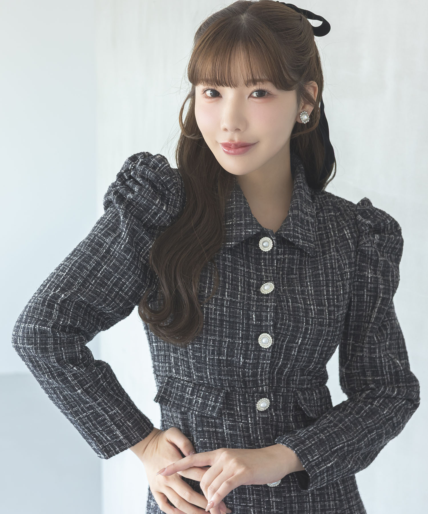 リボン付きパフスリーブラメシャギーニットプルオーバー