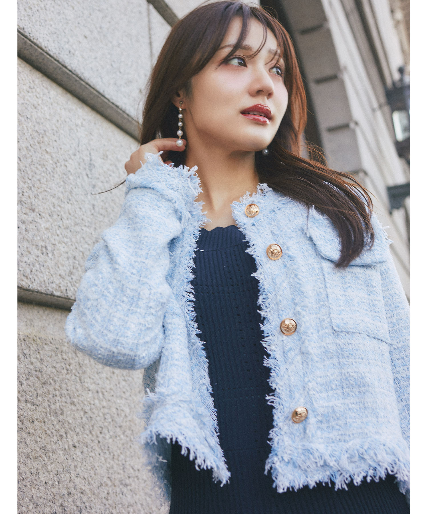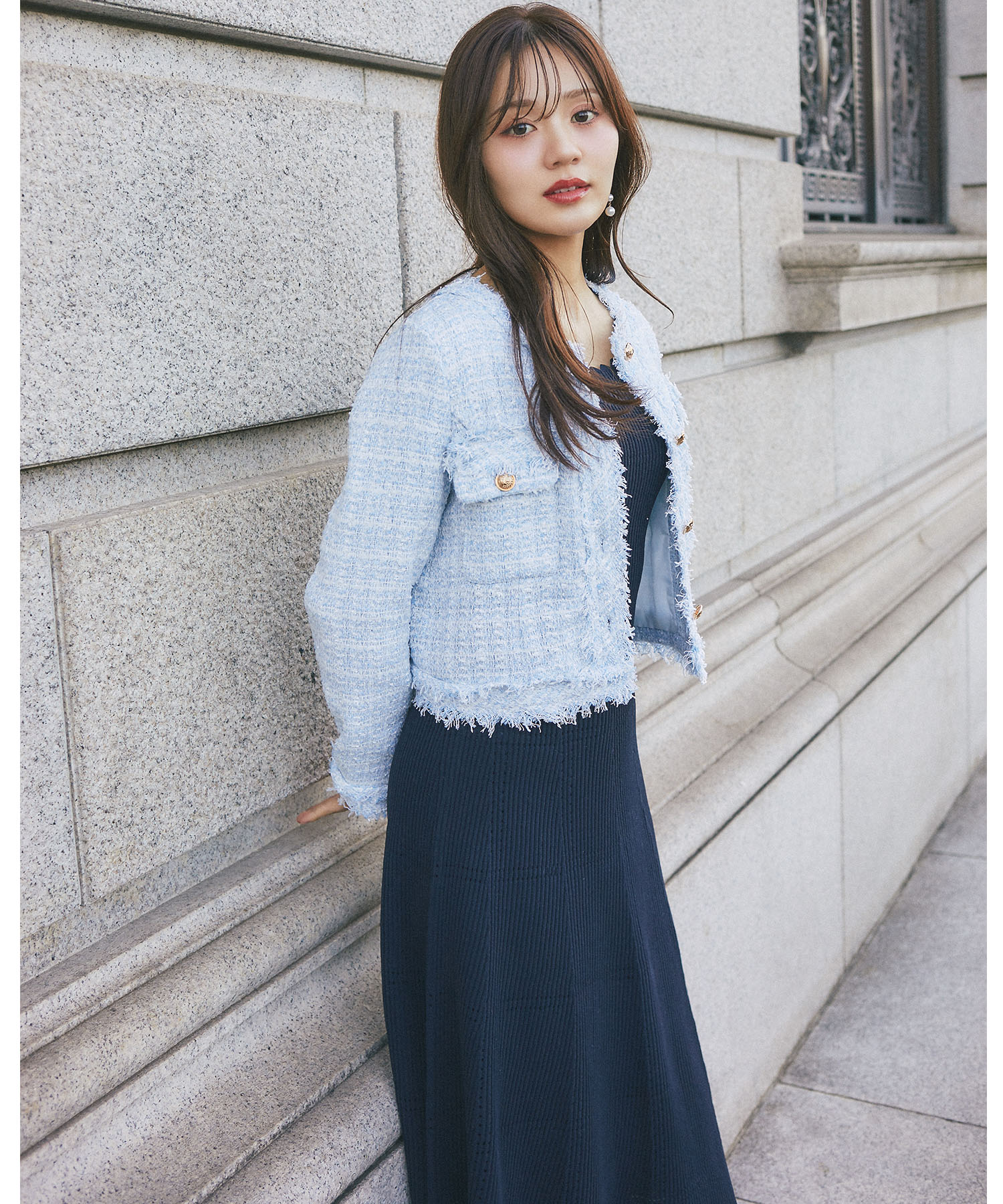 高級感のあるミックスツイード生地のジャケット。 細部にフリンジを施し、立体感と華やかさを添えました◎ 上品な色味のゴールド釦がクラシカルなアクセントに♪ シンプルなアイテムと合わせるだけで上品に着映えます。 お呼ばれシーンでも大活躍するからマルチに使える! 必ず持っておきたい万能なきちんと感のある1着です。 |