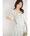 ウエストりぼん付きラッフルフリルフラワープリントティアードワンピース