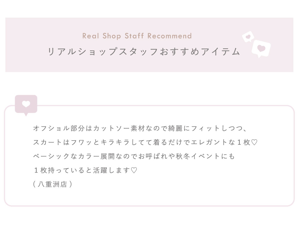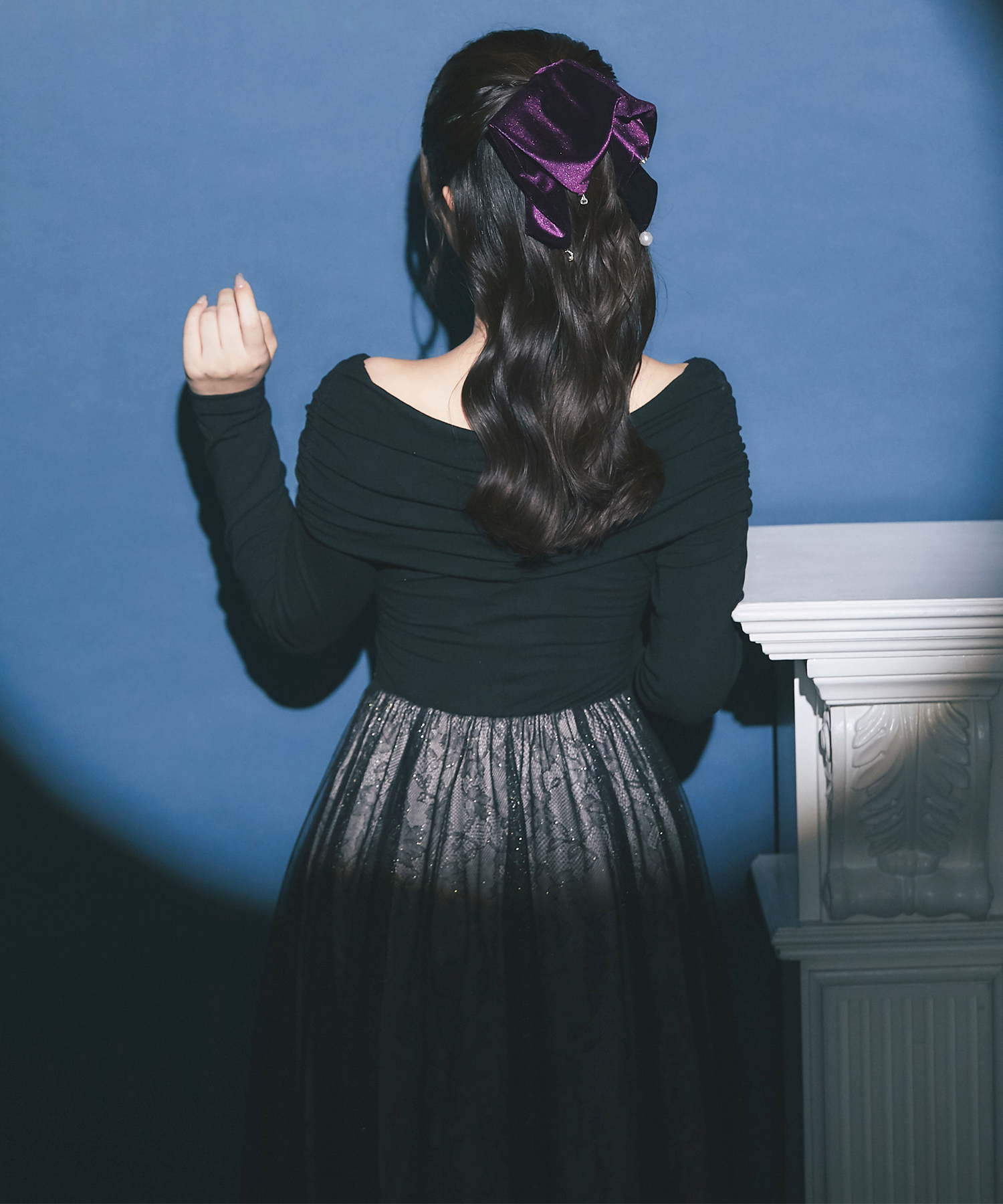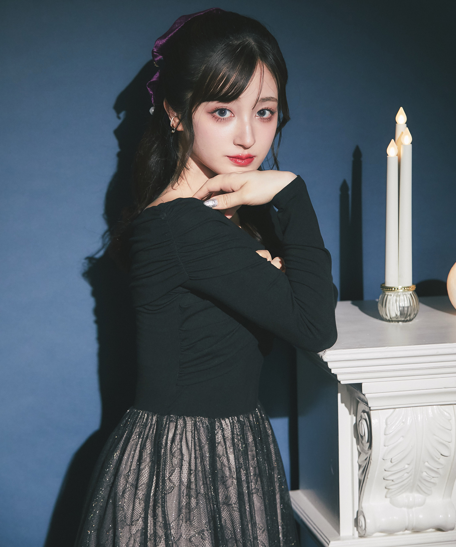柔らかな着心地のオフショルカットソーと 上品に煌めくラメレース生地をドッキング♪ お顔周りをスッキリ見せつつヘルシーな肌見せが叶い、 女性らしい色香が薫るワンピースです◎ 全体をシックなワントーンで仕上げているので 大人っぽい華やかさを演出してくれる1着。 |