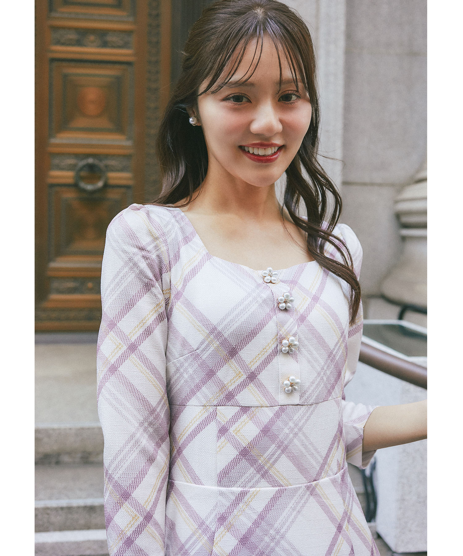 しっかりとしたツイードライクチェック柄生地で 高級感のある装いが叶う、上品ワンピース。 お顔周りをスッキリ見せるスクエアネックでデコルテ美人に♪ フロントにはパールとクリアビジューを用いた 立体的なフラワーモチーフの飾り釦を装飾。 BACKにはレースアップデザインをあしらい、 サイズ調節を可能にしつつ 後ろ姿まで可愛く仕上げました◎ ウエストの切り替えディティールと相まって キュッとメリハリのあるシルエットをメイク! ナチュラルにスタイルUP見えしてくれる1着です。 |