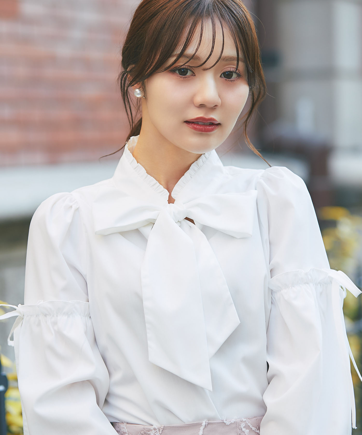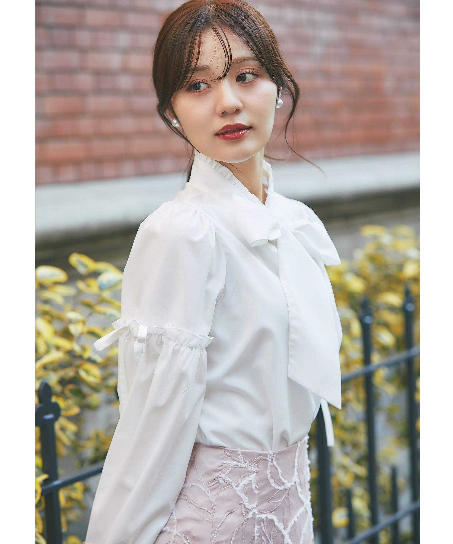 お顔周りを華やかに彩るクラシカルな甘さのブラウス。 プチフリル付きのスタンドカラーに 存在感のあるボウタイリボンをあしらい、 品格のあるレディな装いを叶えました◎ ふんわりと少しボリュームを持たせたスリーブにも プチフリル&リボンを施し、甘さをプラス♪ 程よいハリ感としなやかさのある素材を使用し、 デイリーからオフィスまで幅広く活躍する1着です。 |