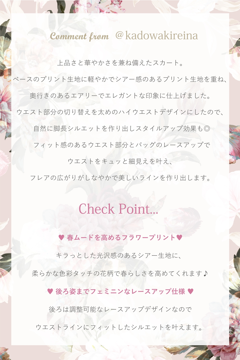 門脇伶奈さん(@kadowakireina)とのコラボアイテム。 360度どこから見ても映える大人の透明感スカートです♪ 歩くたびにふんわりと光をはらむシアー素材を使用。 水彩画のように繊細で深みのあるフラワープリントが 上品な華やかさを演出します。 バックにレースアップデザインをあしらい、 可愛くキュッとメリハリシルエットをメイク。 後ろ姿まで抜かりなく女性らしさを引き立てる1着です。 |