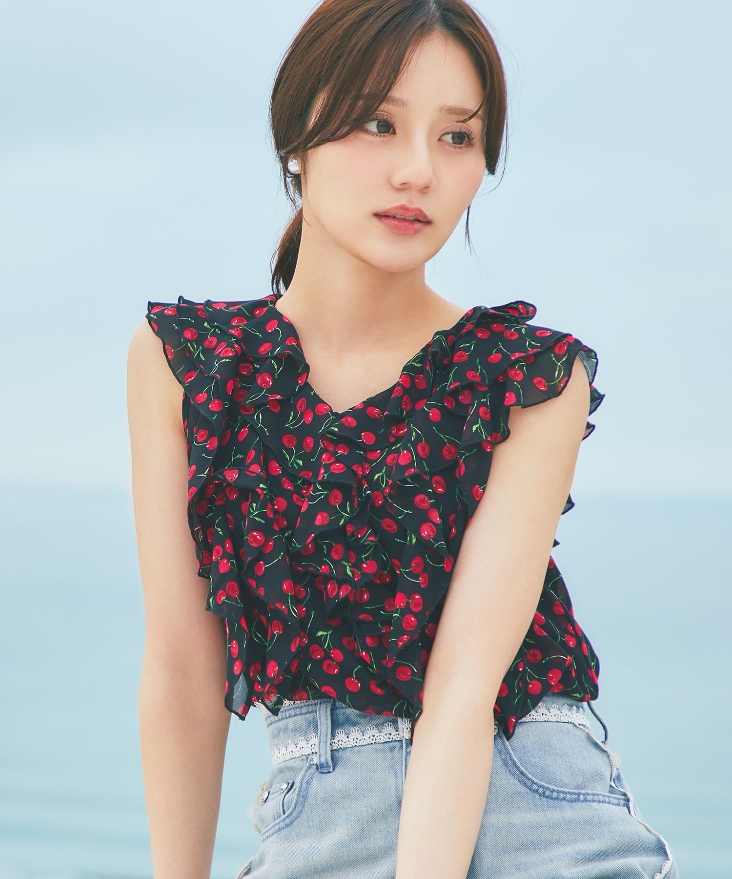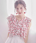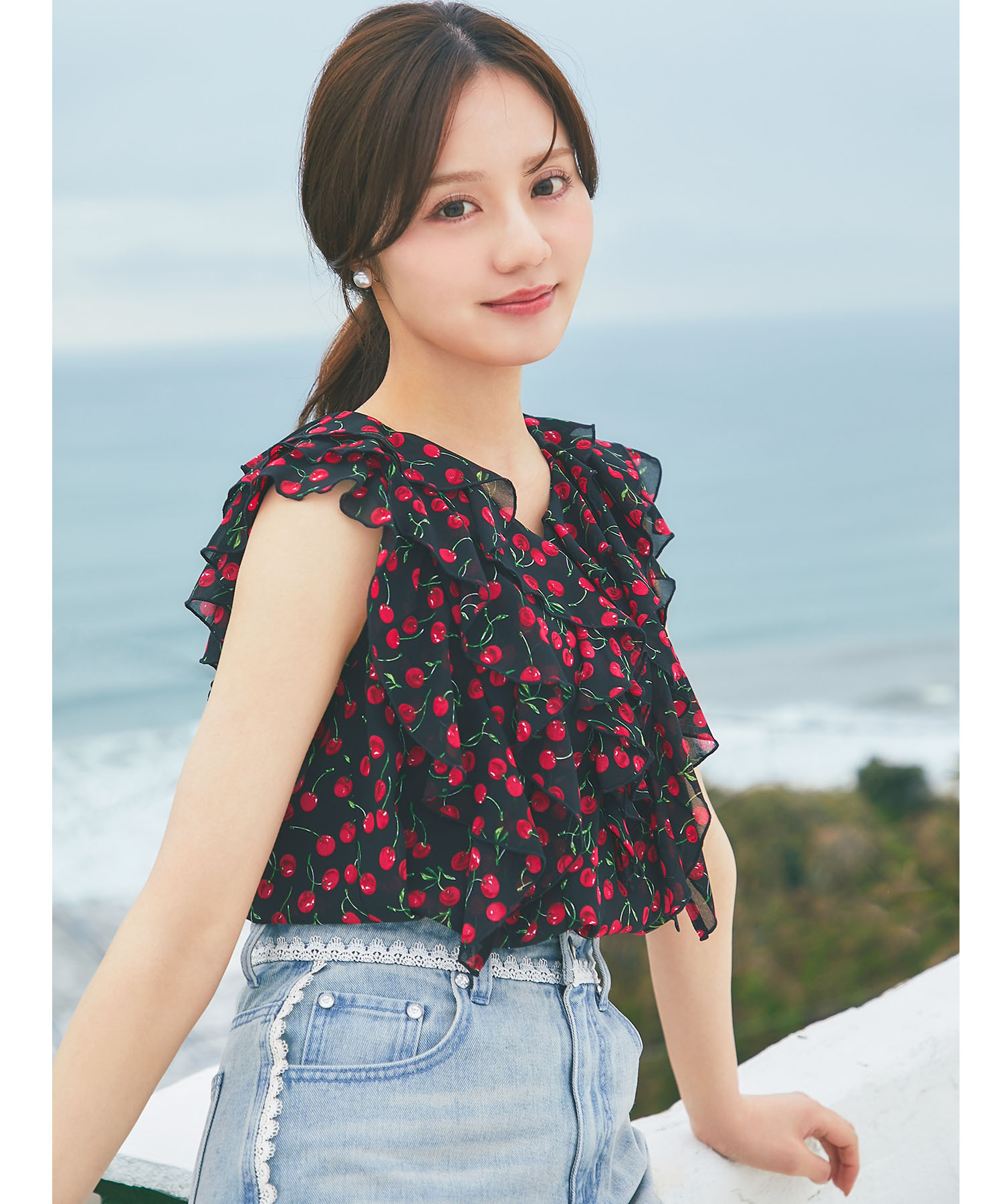 存在感バツグンのチェリープリント生地で パッと華やいで目を惹くガーリーブラウス。 お顔周りをスッキリ見せるVネックを採用。 ラッフルフリルをたっぷりとあしらい、 優雅に揺れる可憐な甘さを添えました♪ 後ろにはリボンを施し、愛らしいアクセントに◎ インナーのキャミソール付きなのも嬉しいポイント。 シンプルなボトムスと合わせるだけで着映える1着です。 |