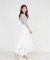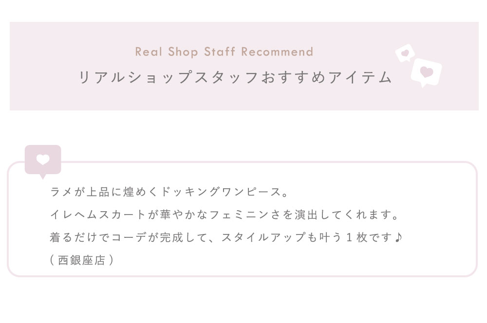 1枚でコーディネートが完成する華やかなワンピース。 ラメリブカットソー生地のトップスと ラメシフォン生地のイレヘムレイヤードスカートをドッキング♪ どちらのテキスタイルも上品に煌めいて 異素材の組み合わせがお洒落なコントラストを生み出します。 歩くたびに揺れるアシンメトリーな裾のラインが 足元を軽やかに演出し、ドラマチックな印象に。 スリット入りの袖口には上品なパール、 ウエスト後ろには愛らしいリボンをあしらいました◎ レディライクなフィット&フレアシルエットで 自然なスタイルアップ見えが期待できる1着です。 |