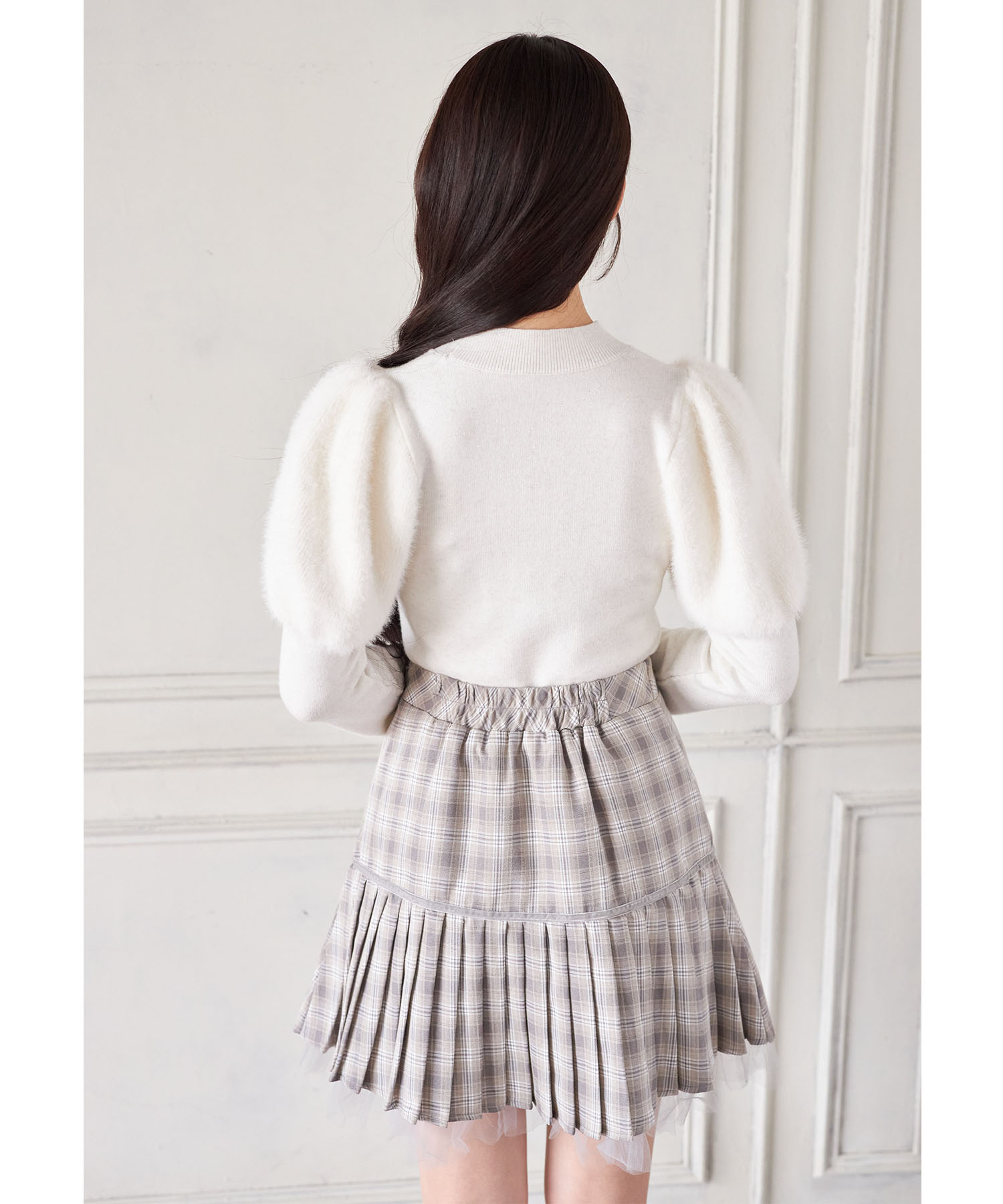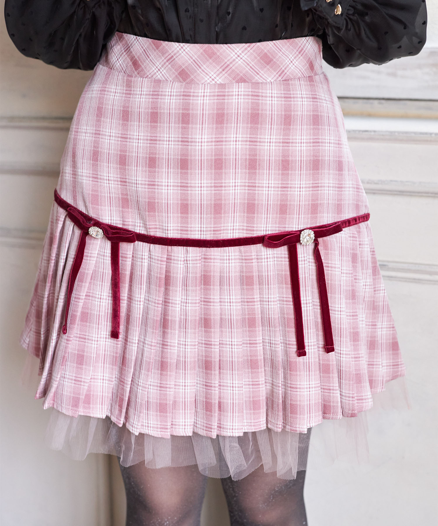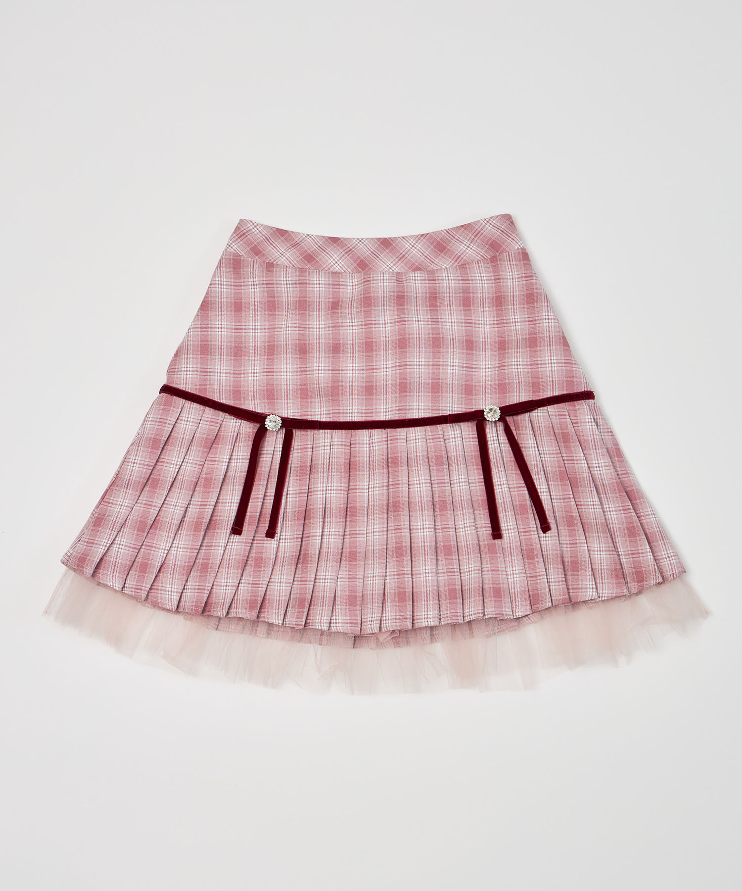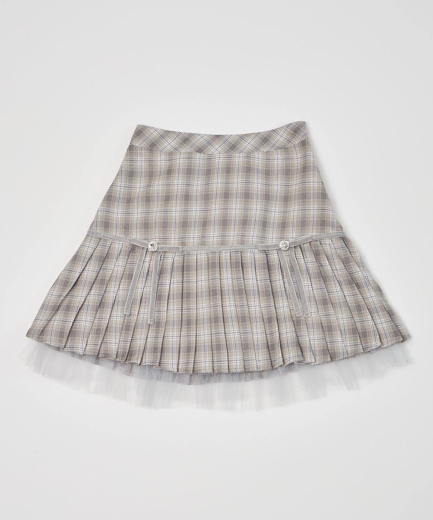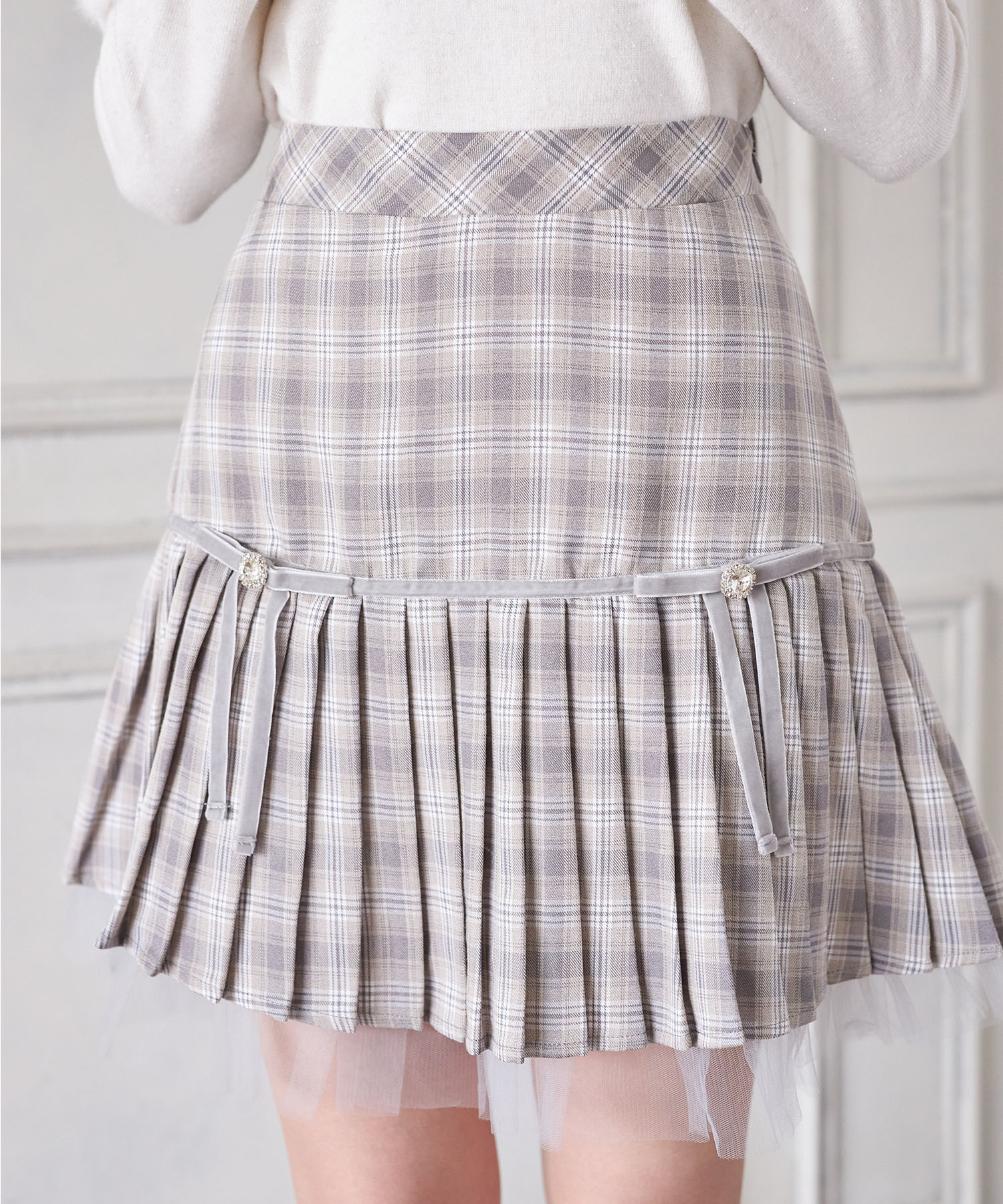 プリーツ加工で切り替えたシーズンライクなチェック柄スカート。 台形シルエット+ミニ丈で今っぽい洒落感をGET♪ ビジューを用いたベロアリボンの装飾が 高見えする上品な愛らしさのアクセントに。 裾から覗くチュールフリルがさらに可愛いポイント◎ シンプルなトップスと合わせるだけで着映える1着です。 インナーがパンツ仕様なのが嬉しいポイント! |