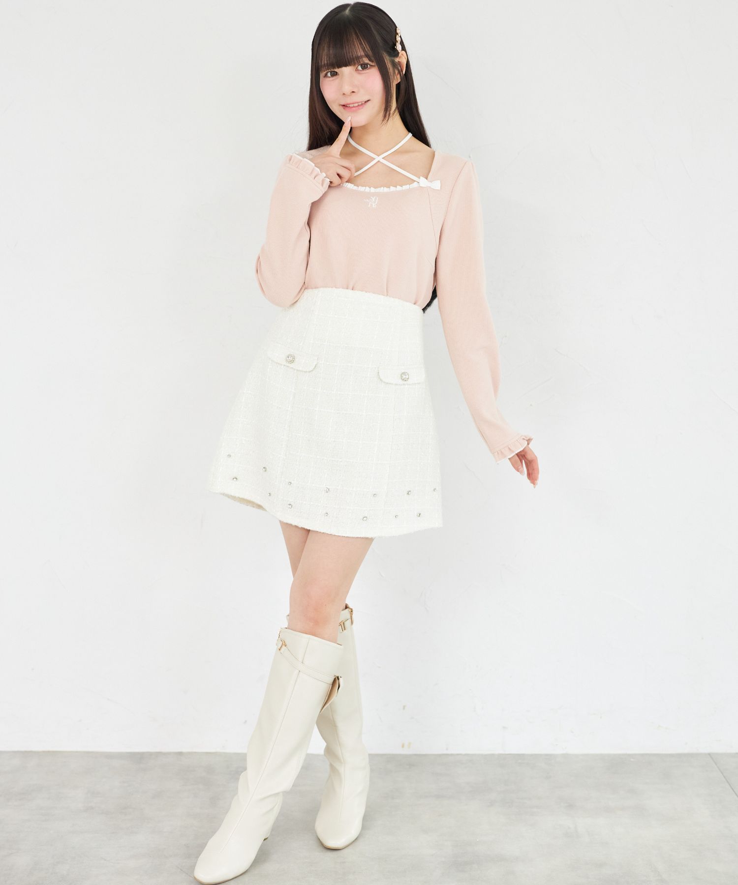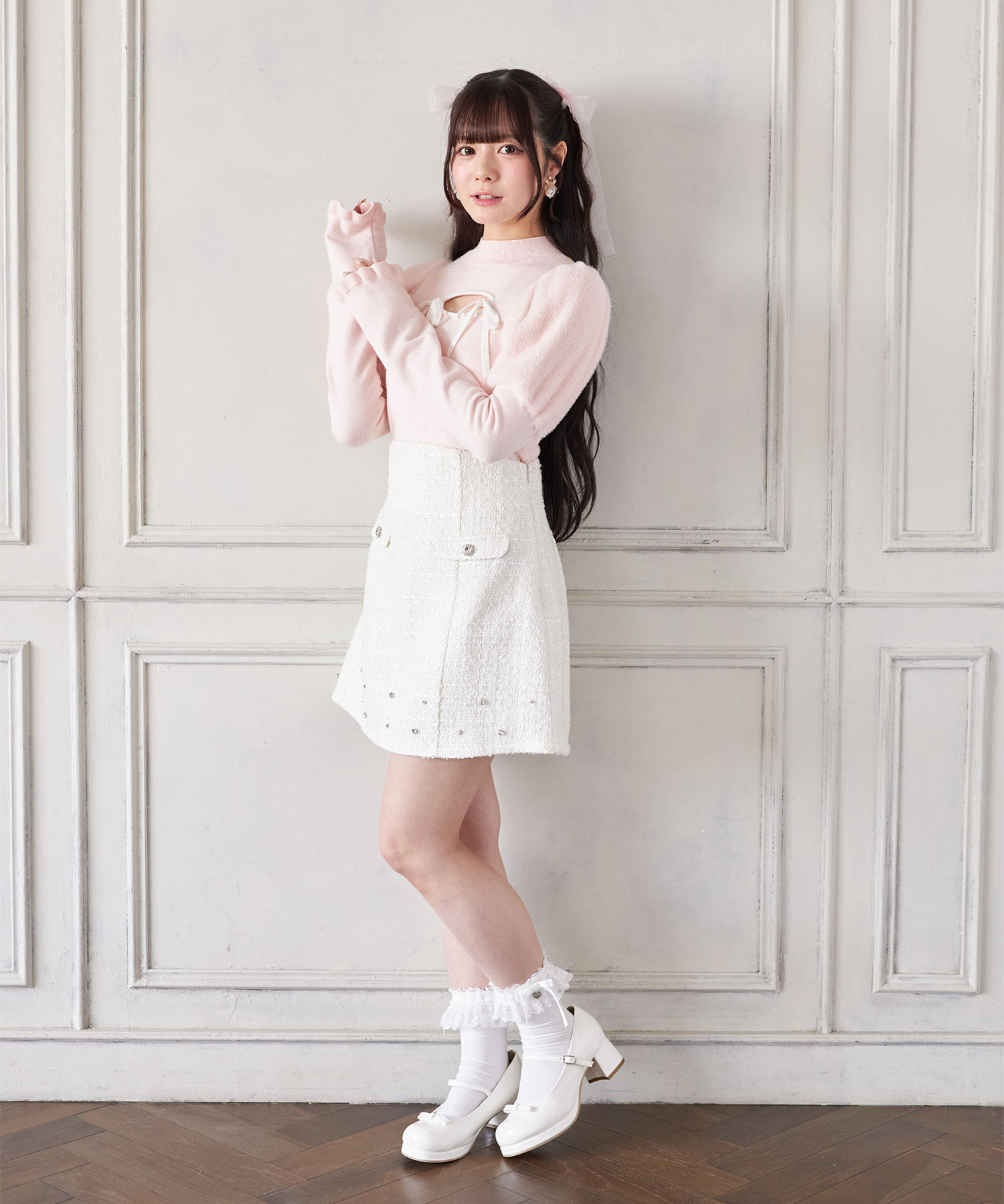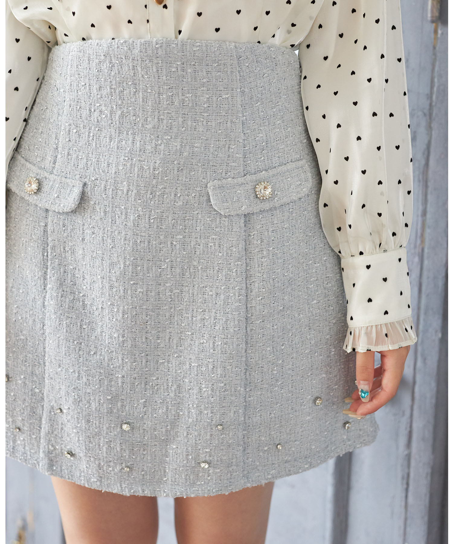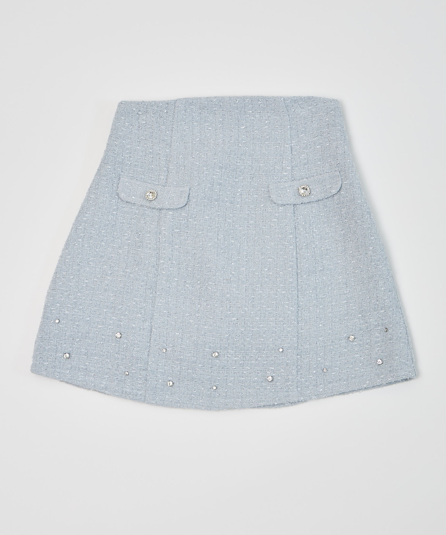 ほんのり煌めくラメ入りツイードスカート。 台形シルエット+ミニ丈で今っぽい洒落感をGET♪ フェイクポケットと裾部分にクリアビジューを施し、 高見えする上品な愛らしさを添えました◎ いつものコーデに取り入れるだけで シーズンライクなスタイルに決まります。 インナーがパンツ仕様なのが嬉しいポイント! |