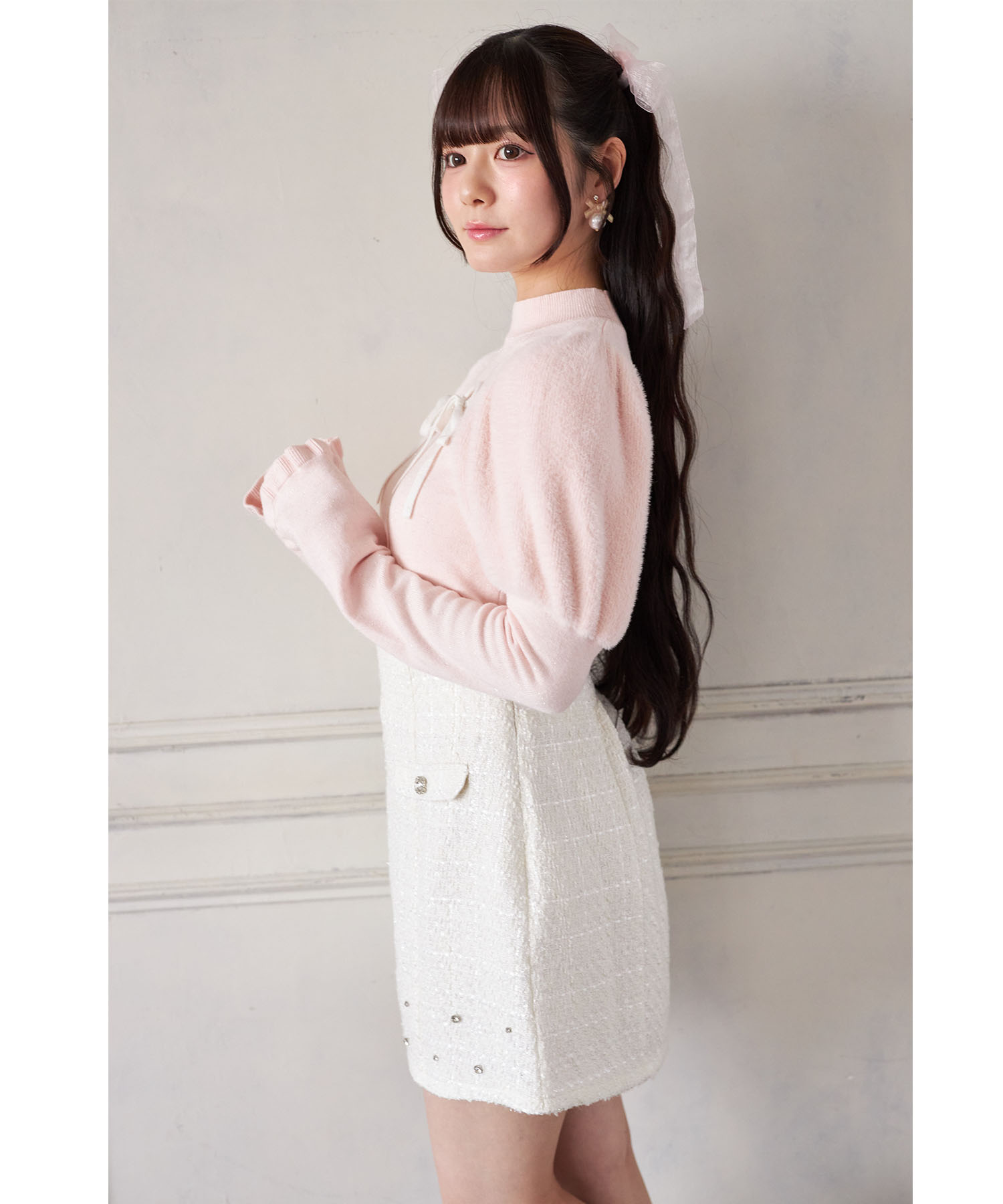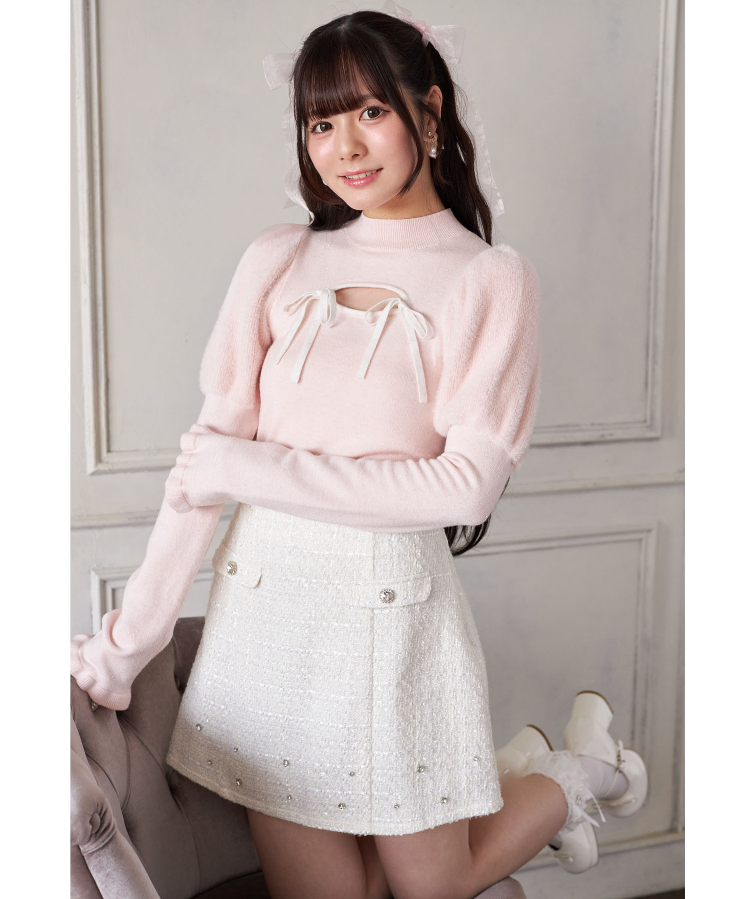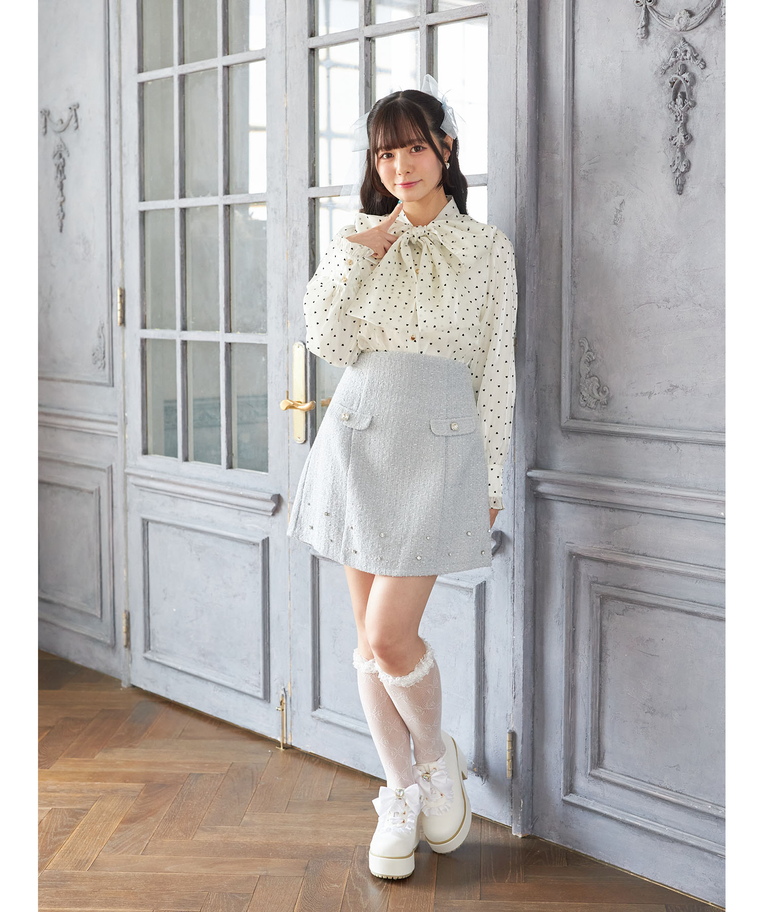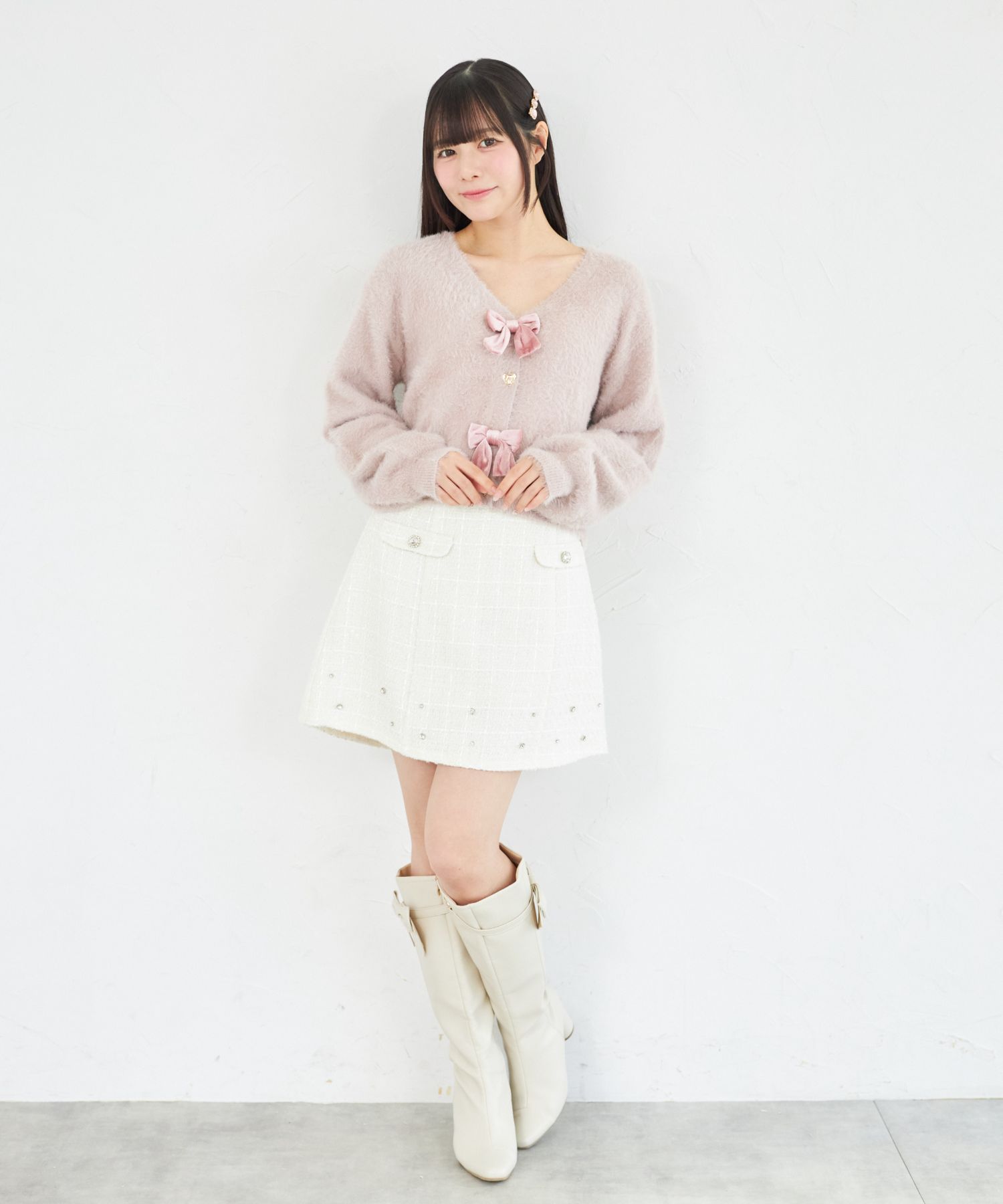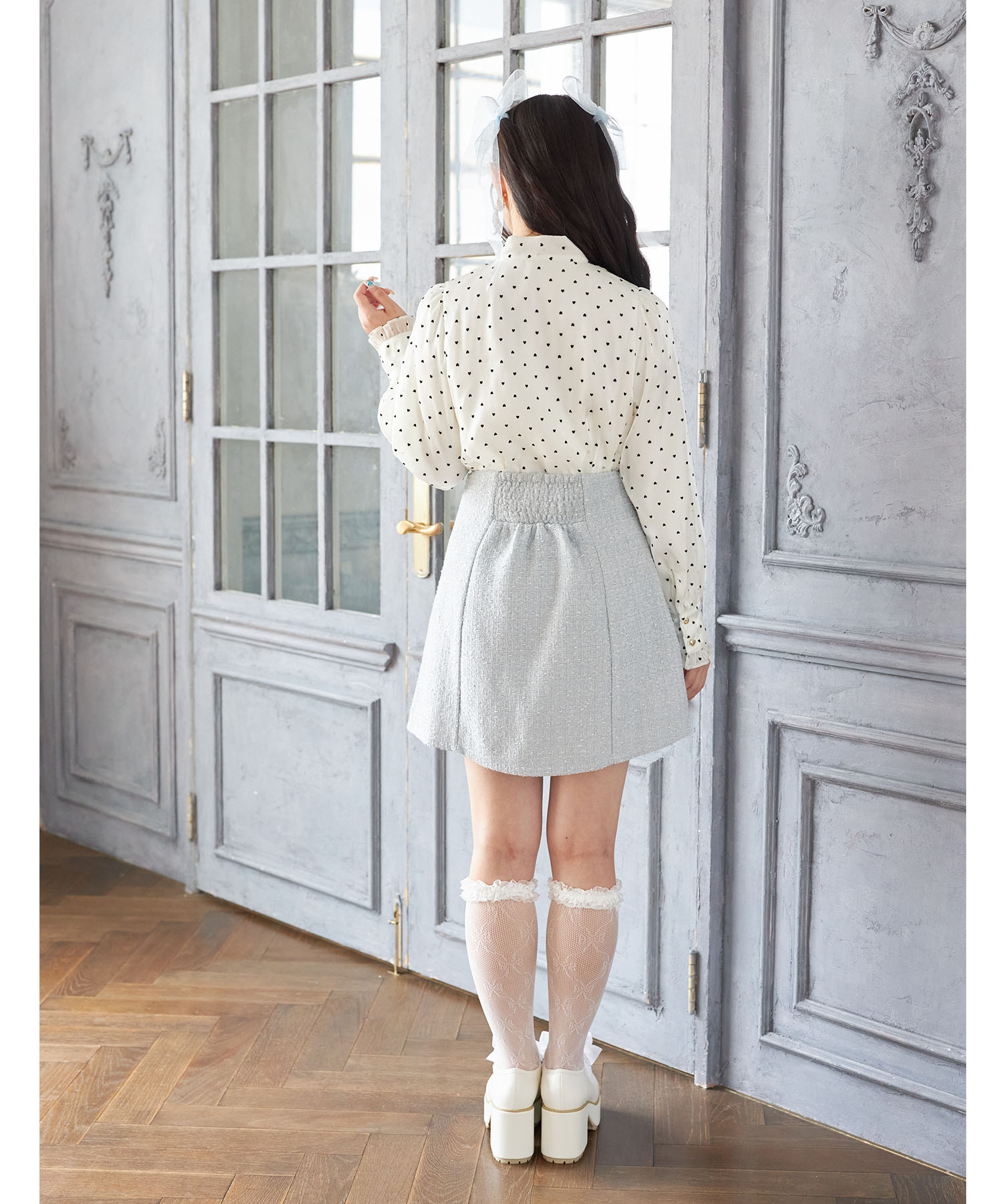 ほんのり煌めくラメ入りツイードスカート。 台形シルエット+ミニ丈で今っぽい洒落感をGET♪ フェイクポケットと裾部分にクリアビジューを施し、 高見えする上品な愛らしさを添えました◎ いつものコーデに取り入れるだけで シーズンライクなスタイルに決まります。 インナーがパンツ仕様なのが嬉しいポイント! |