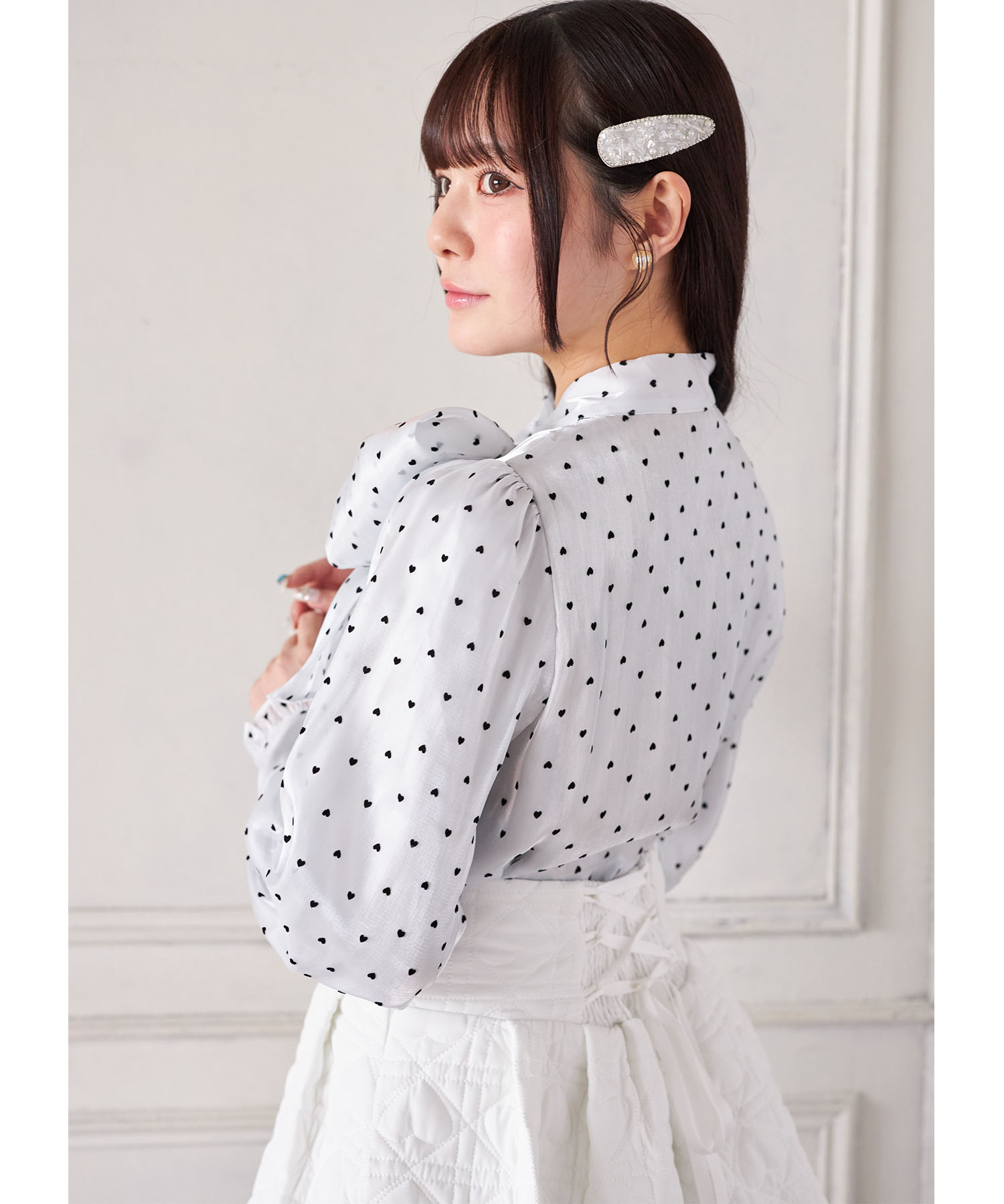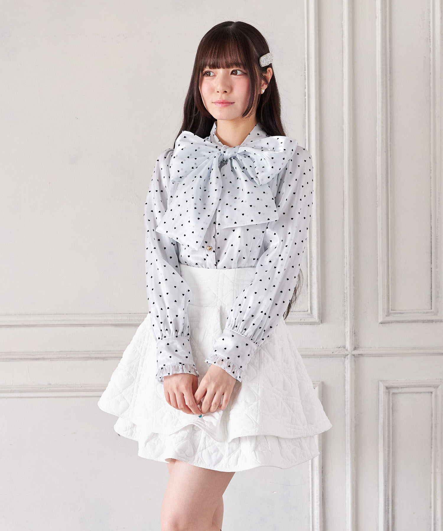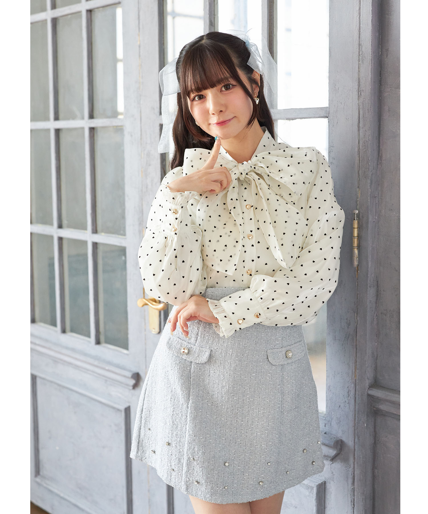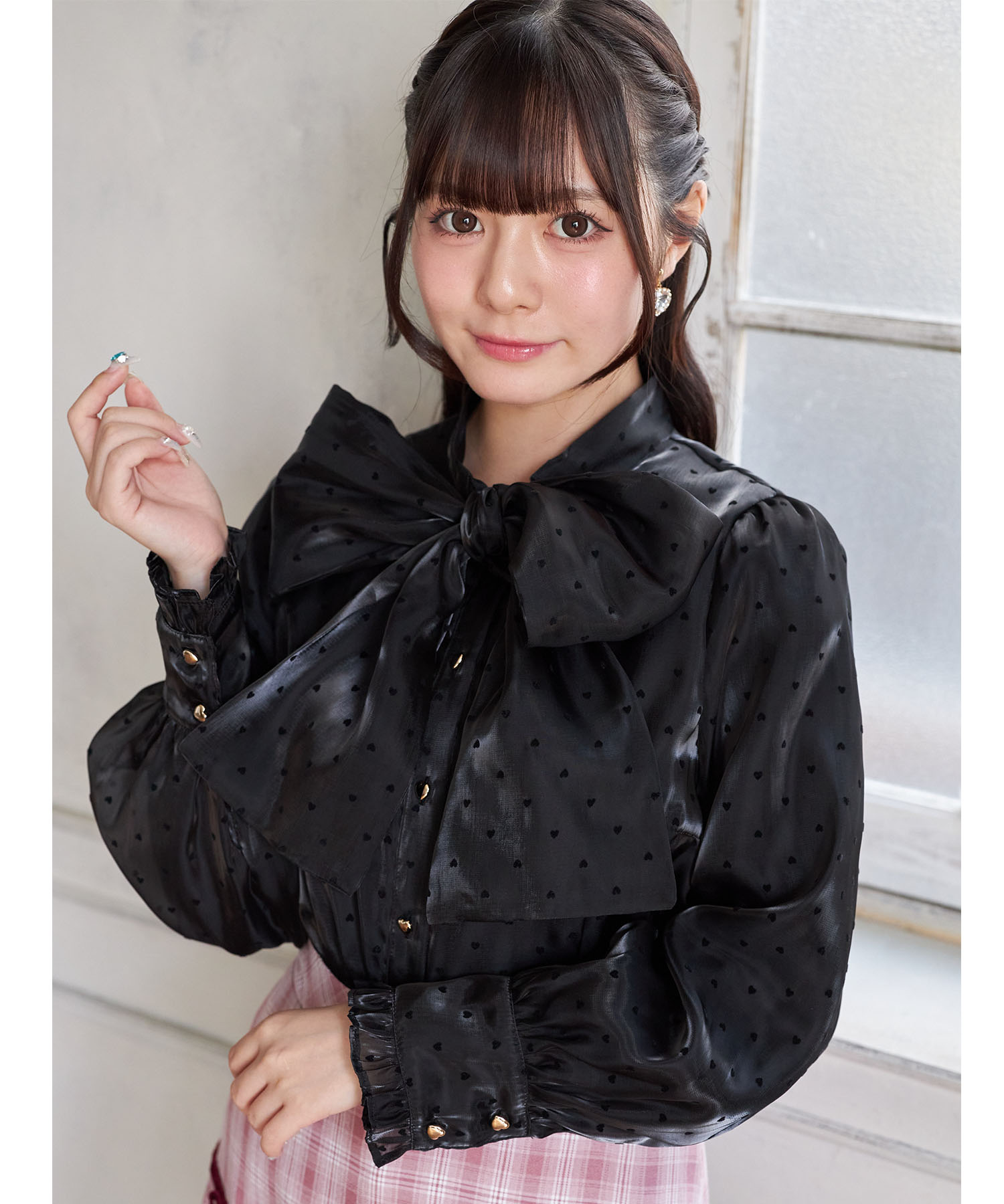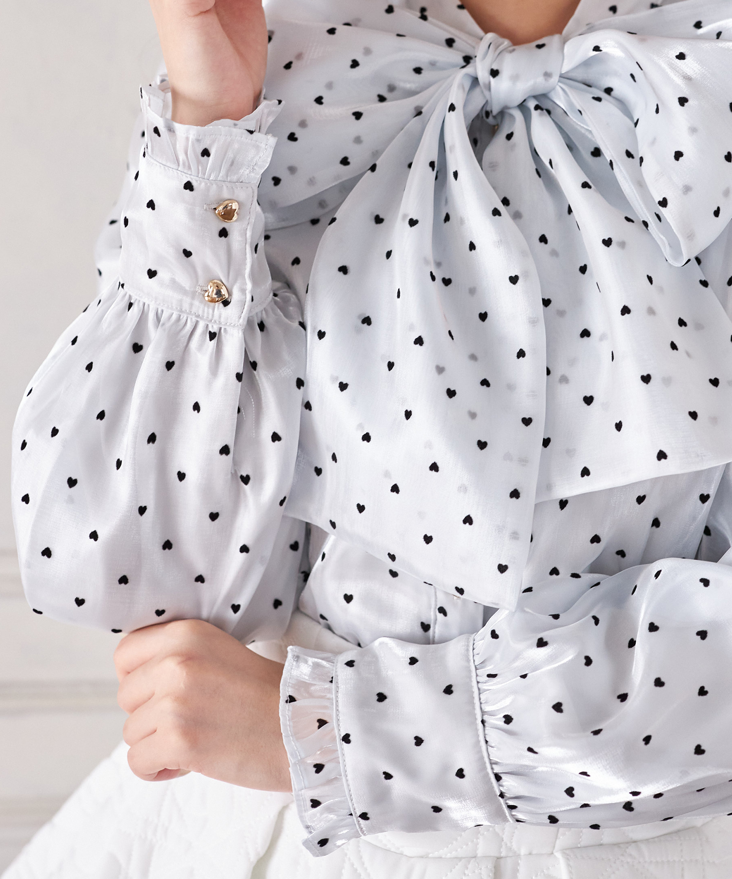 フロッキー素材のハート柄を散りばめた 愛らしさ満点の上品ブラウス。 前立てと袖口にはハート釦をあしらい、 さらにガーリーな甘さをプラスしました。 艶感があるテキスタイルに ボウタイリボンデザインだから きちんと感のある印象に導きます◎ シーズンライクな旬顔になれる1枚。 〈フロッキー加工お取り扱い上のご注意〉 この製品はフロッキー加工(生地表面に羽毛を接着させた加工)を施しています。 強く摩擦すると表面の羽毛の脱落や表面の羽毛が付着することがあります。 予めご了承くださいませ。 |