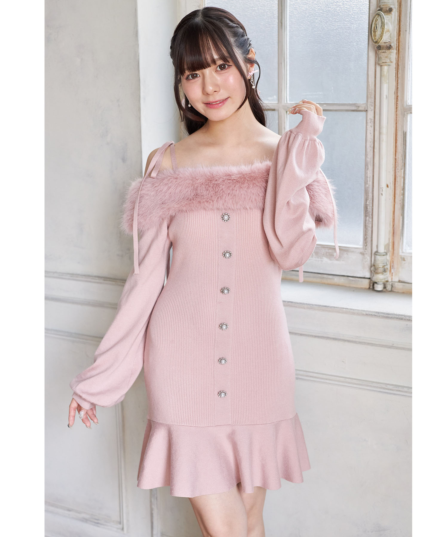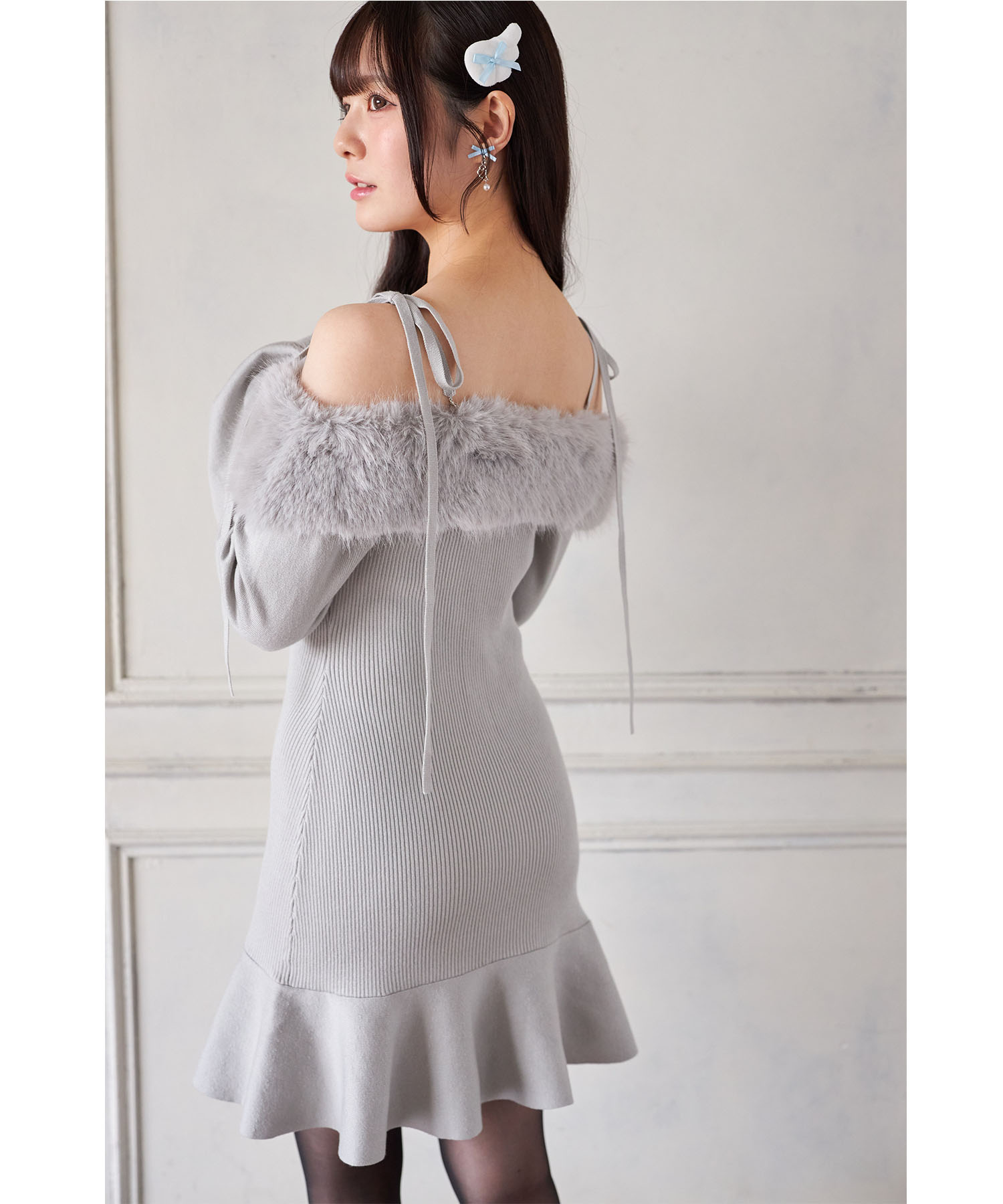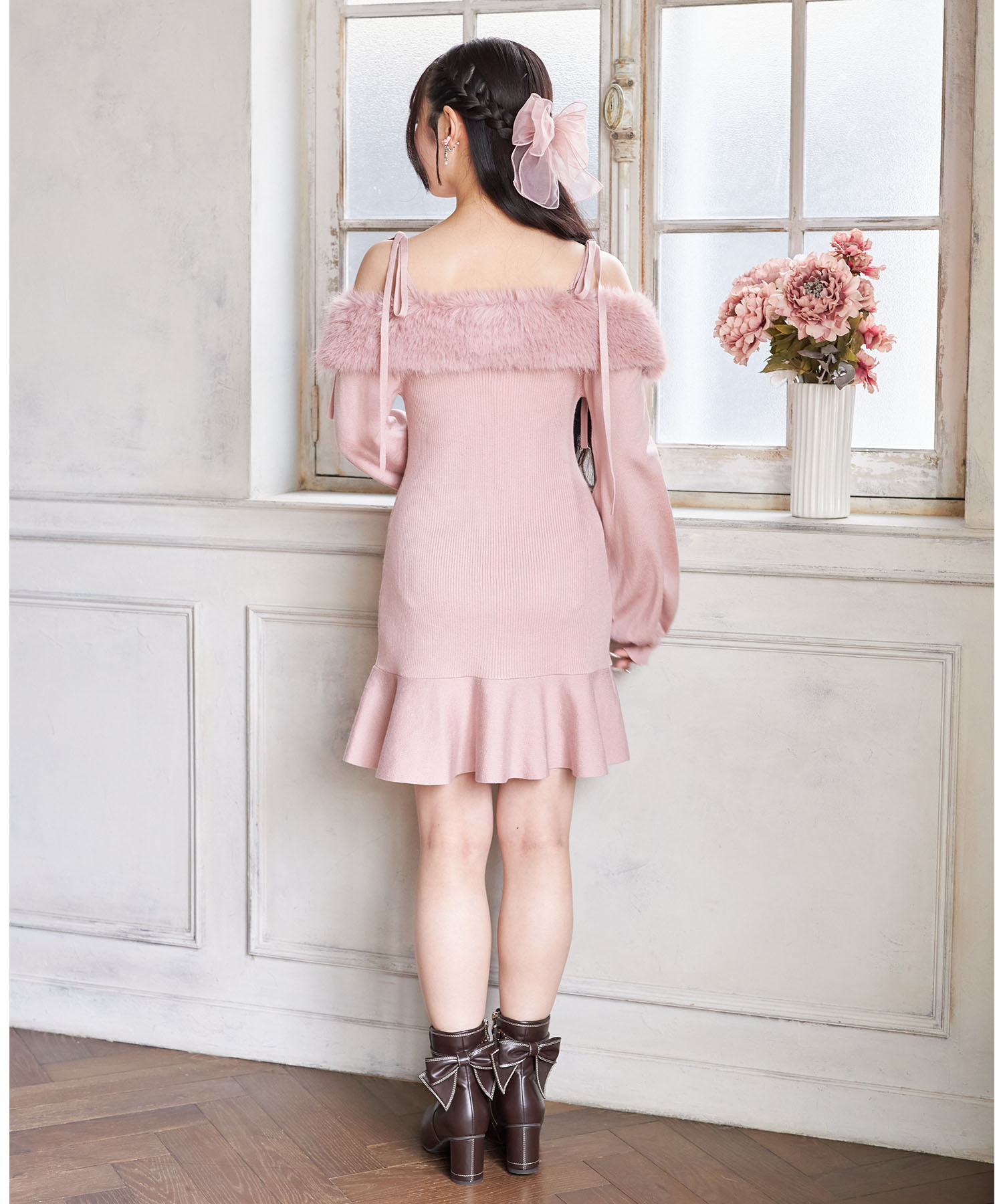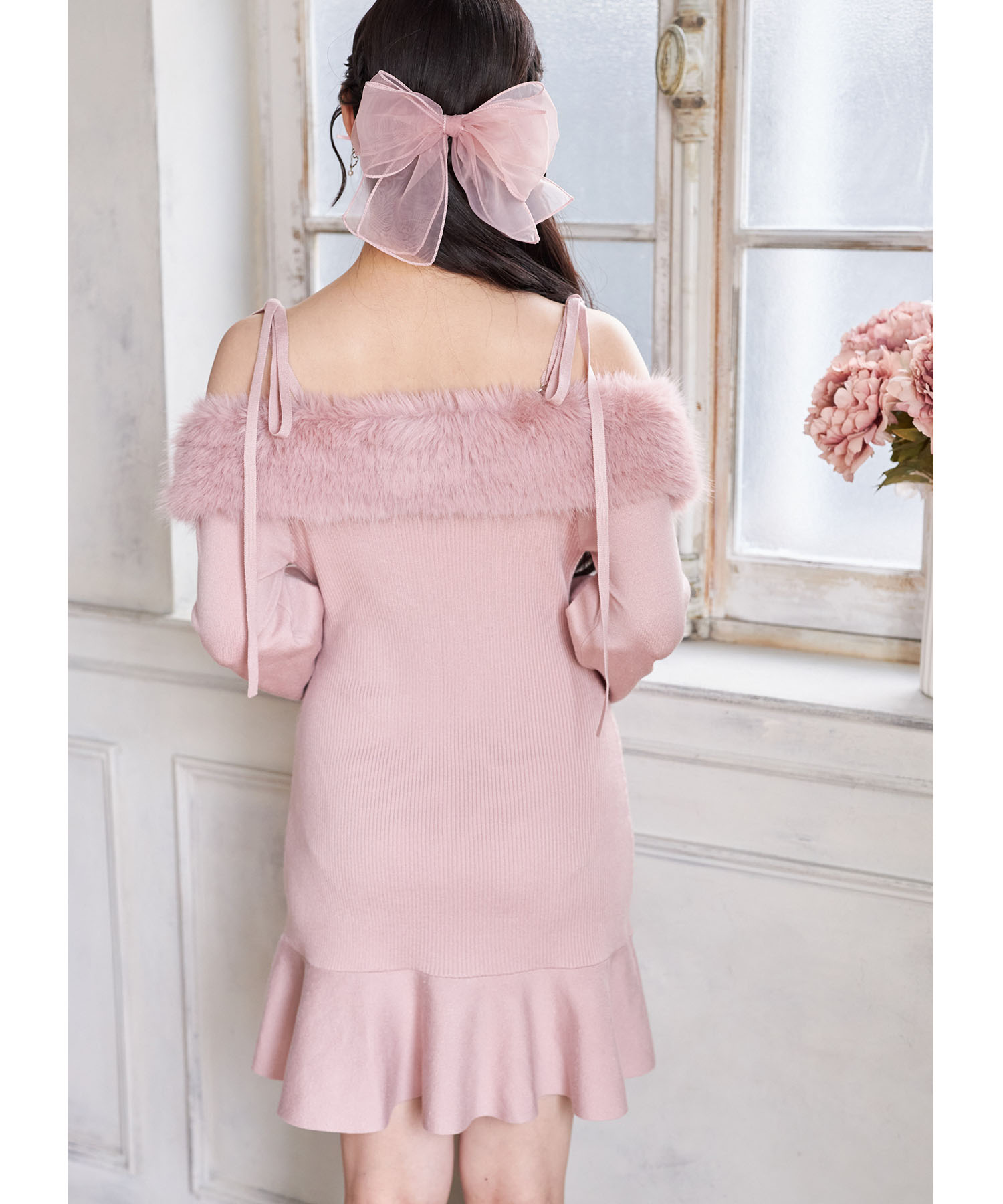 トレンド感ある可愛さが光るリブニットワンピース。 ヘルシーな肌見せができるオフショルデザインに ふわふわのファーを施し、シーズンライクに。 肩のリボンが愛らしいアクセントです♪ センターにはパールビジューの飾り釦をあしらい、 高見えするエレガントな洒落感をプラス。 裾がフレアになった切り替えのミニ丈デザインで 老け見えせずにブーツとも相性抜群! これ1枚で瞬時に華やげる旬のアイテムです。 |