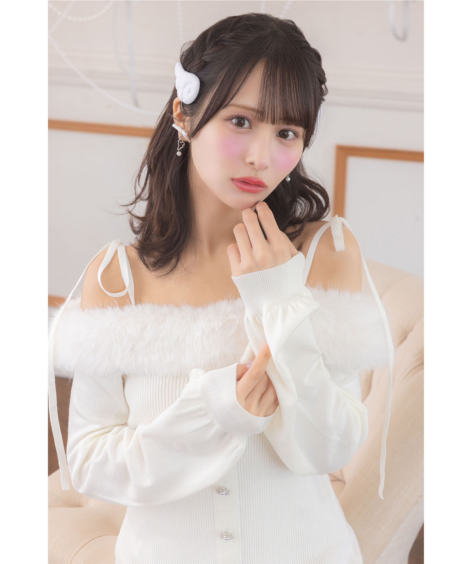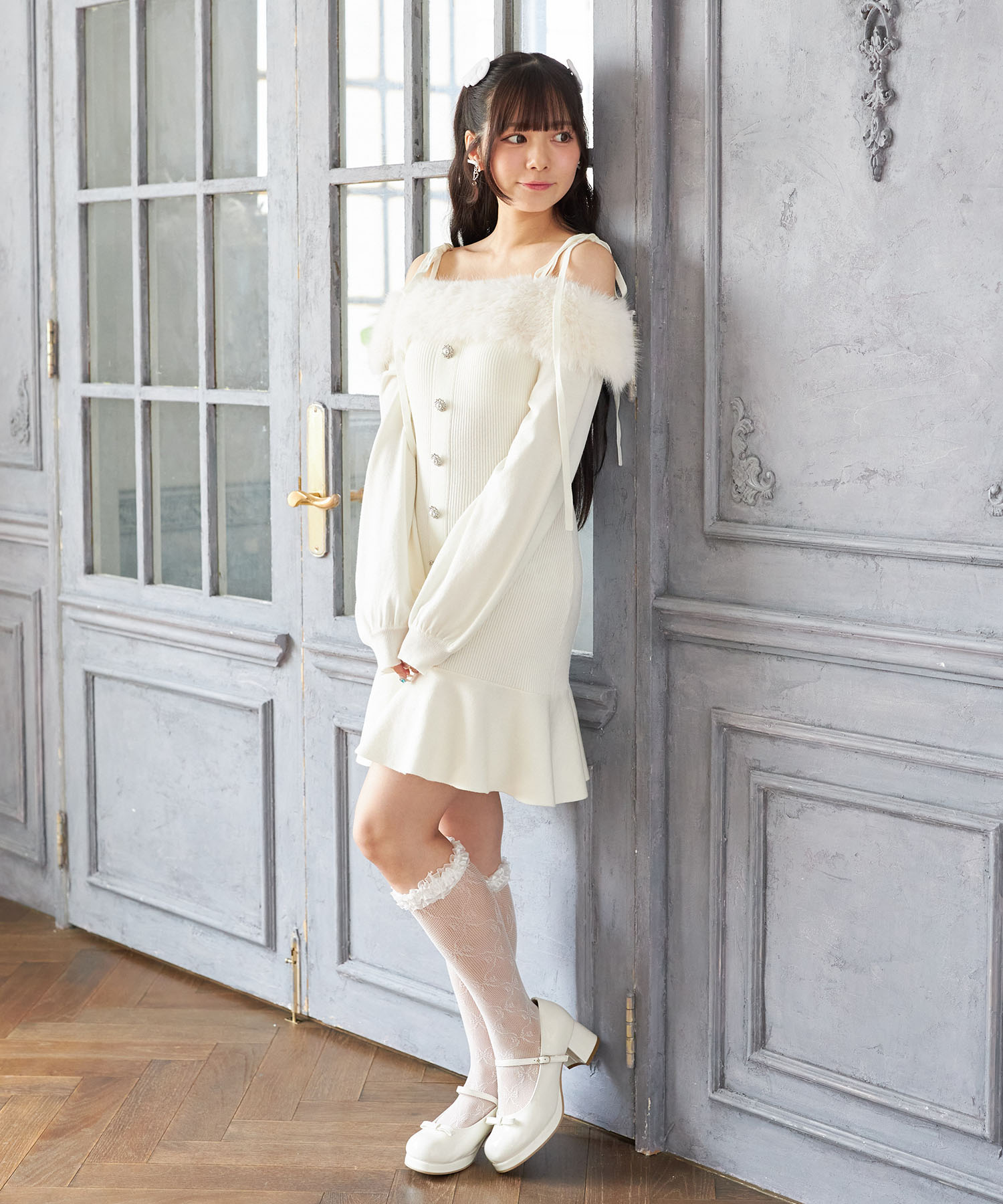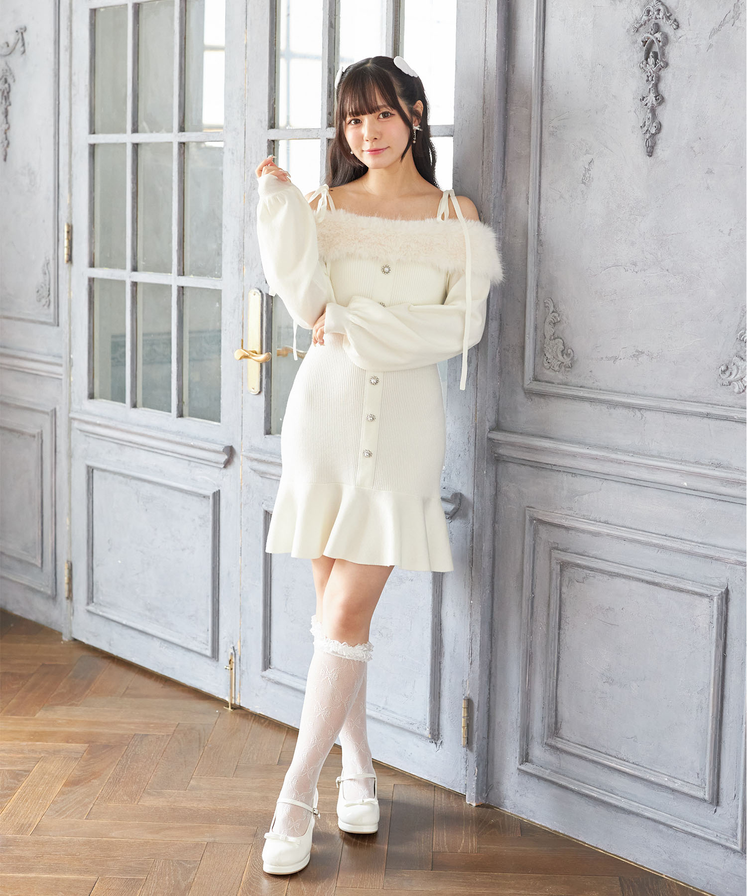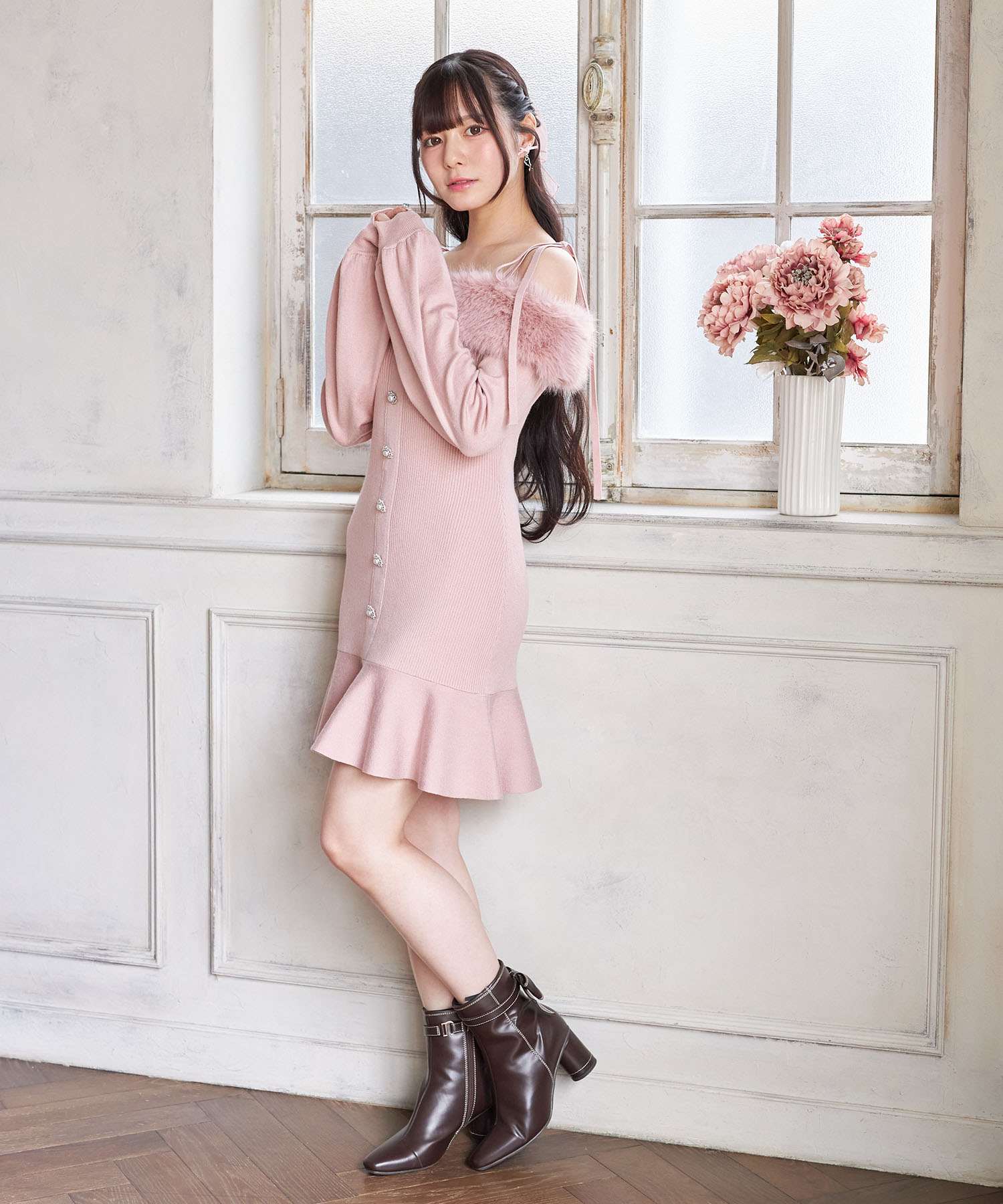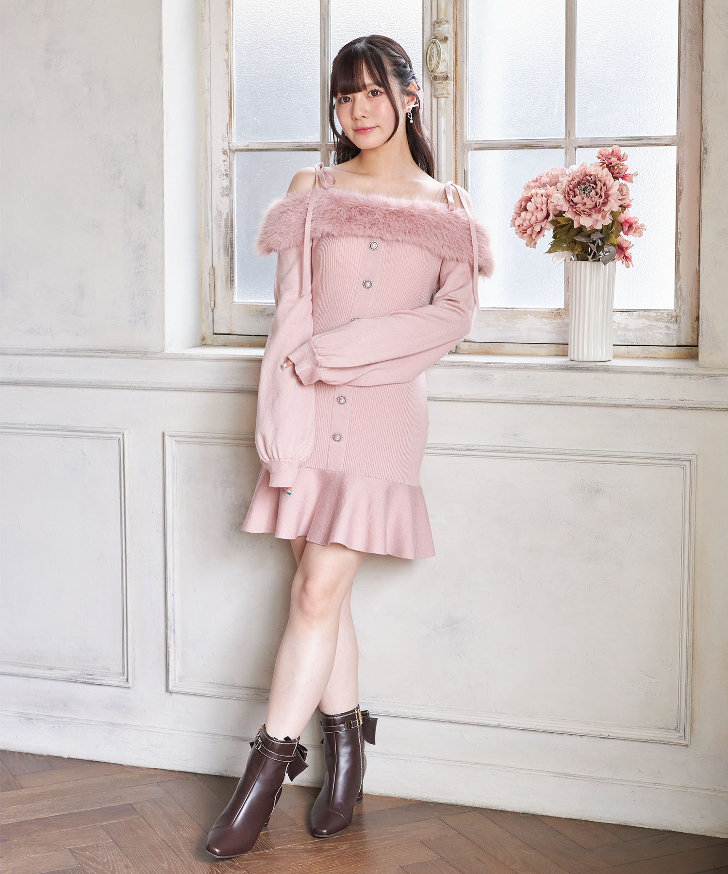 トレンド感ある可愛さが光るリブニットワンピース。 ヘルシーな肌見せができるオフショルデザインに ふわふわのファーを施し、シーズンライクに。 肩のリボンが愛らしいアクセントです♪ センターにはパールビジューの飾り釦をあしらい、 高見えするエレガントな洒落感をプラス。 裾がフレアになった切り替えのミニ丈デザインで 老け見えせずにブーツとも相性抜群! これ1枚で瞬時に華やげる旬のアイテムです。 |