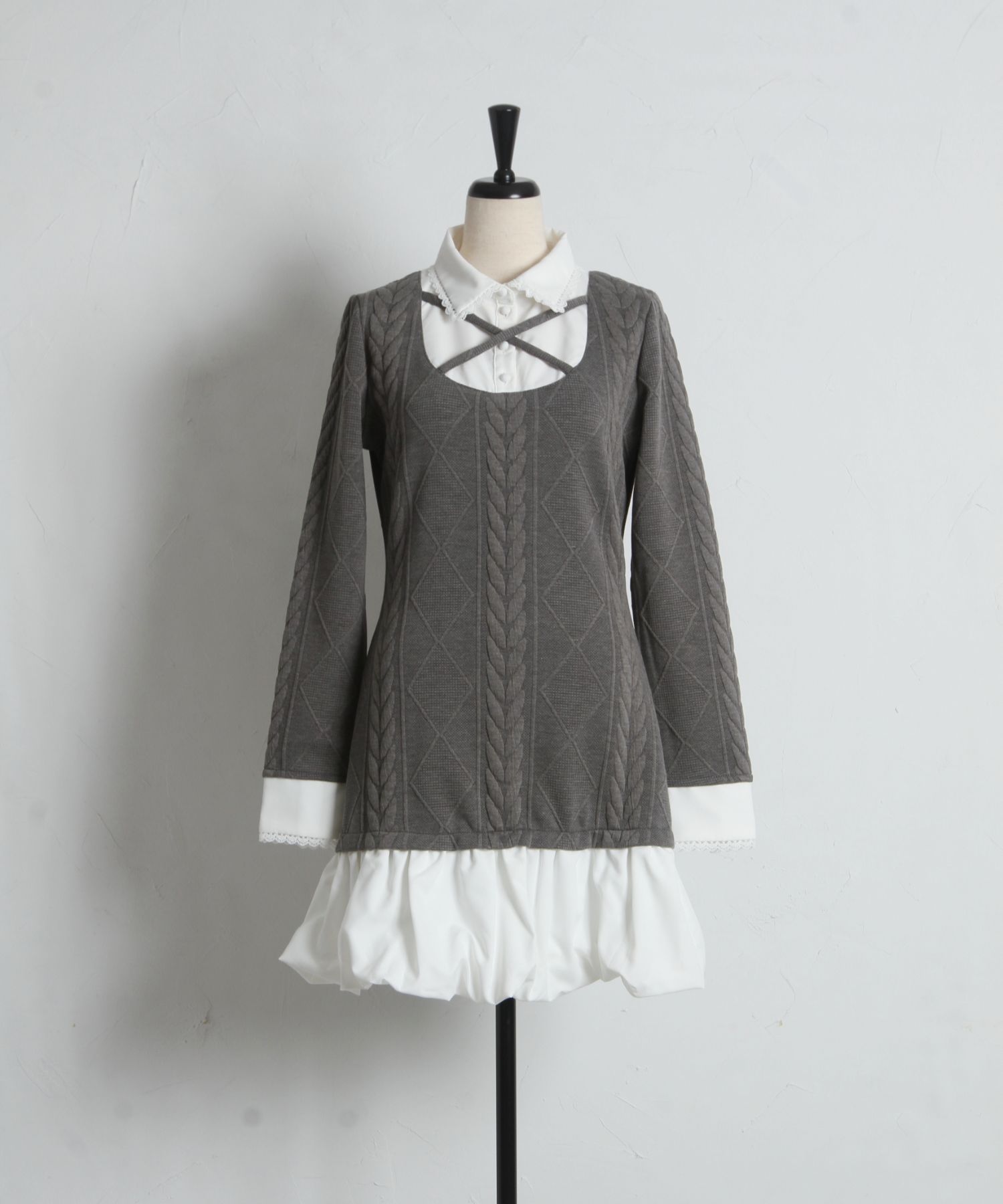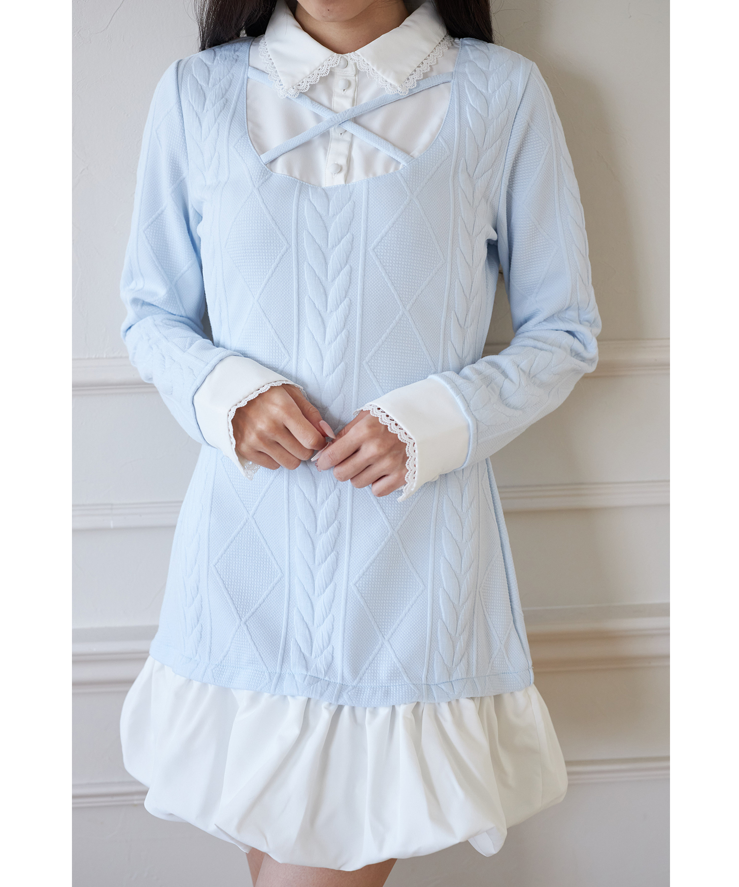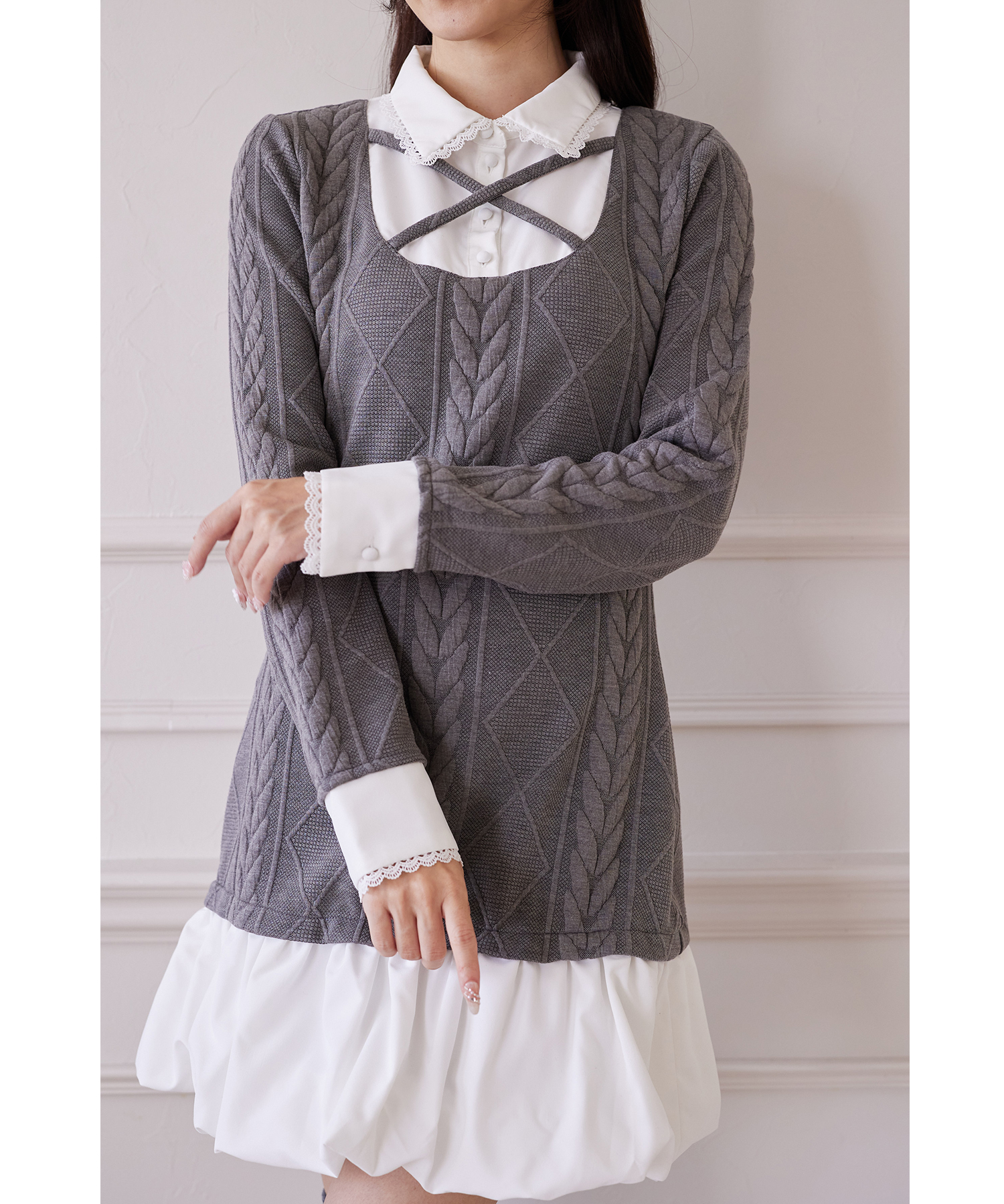 レース装飾シャツドッキングバルーンワンピース