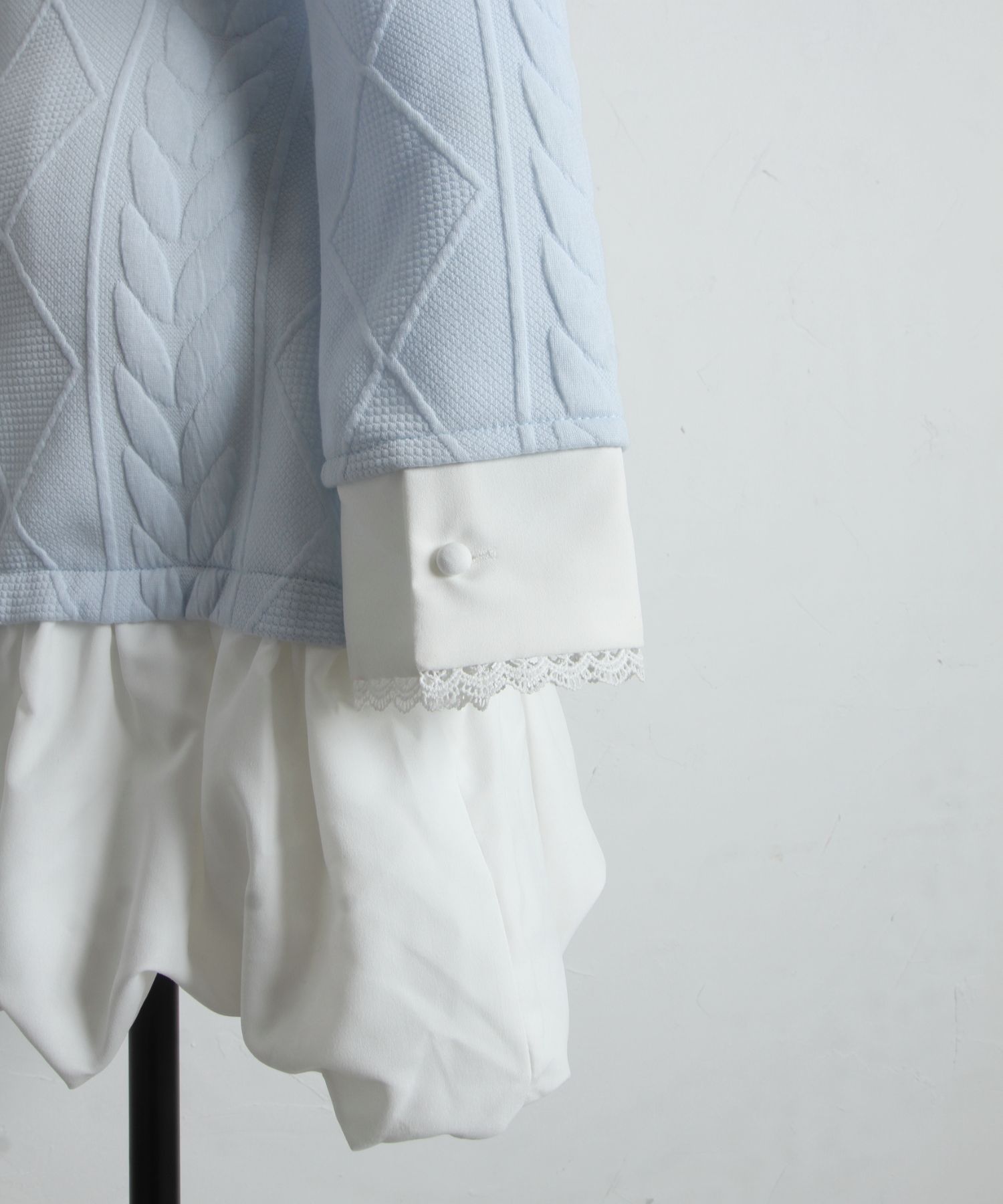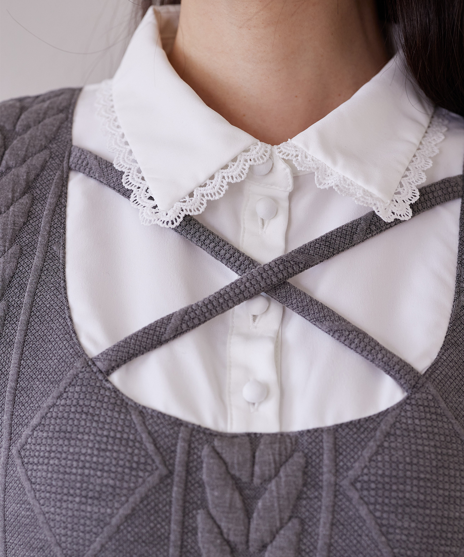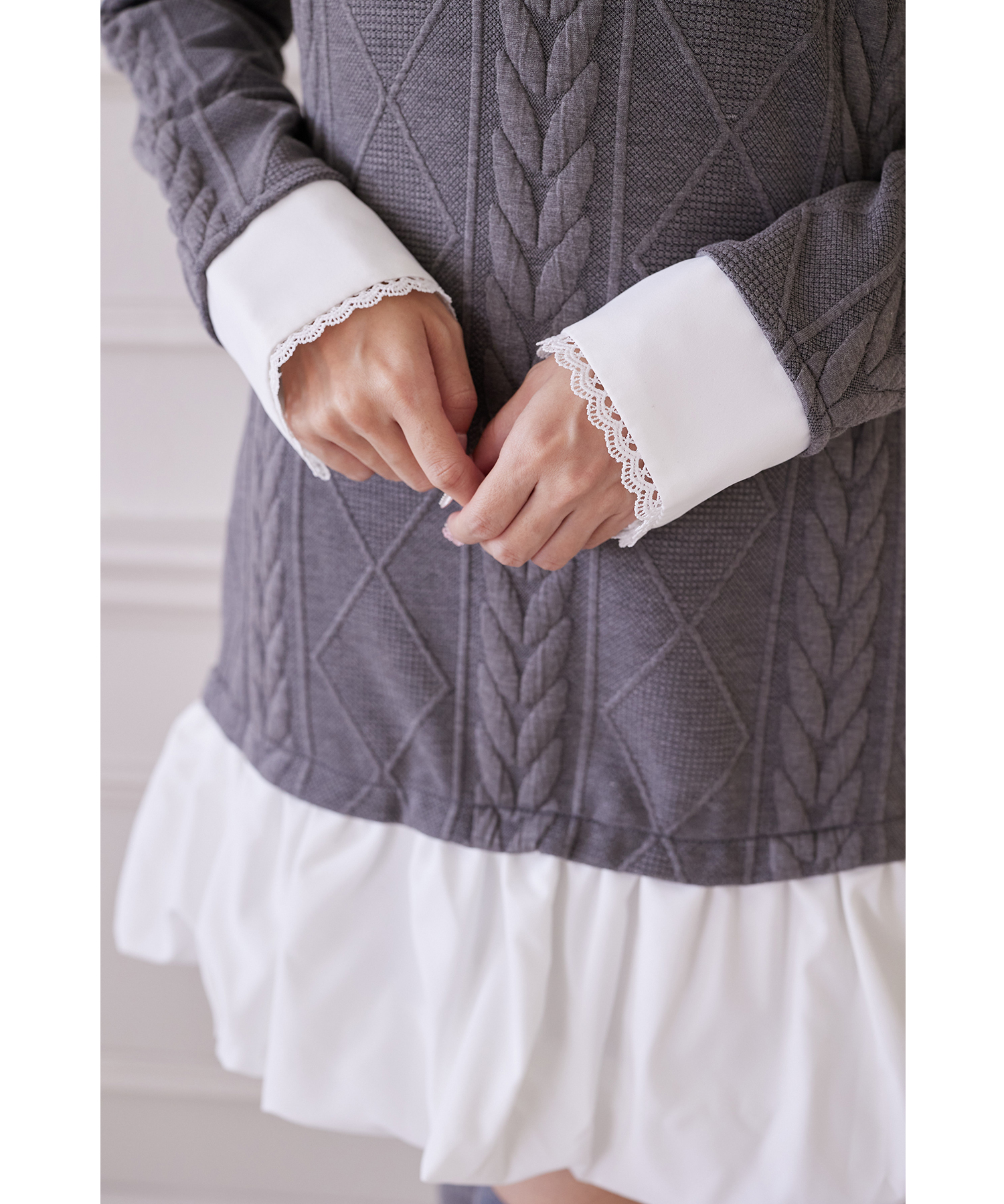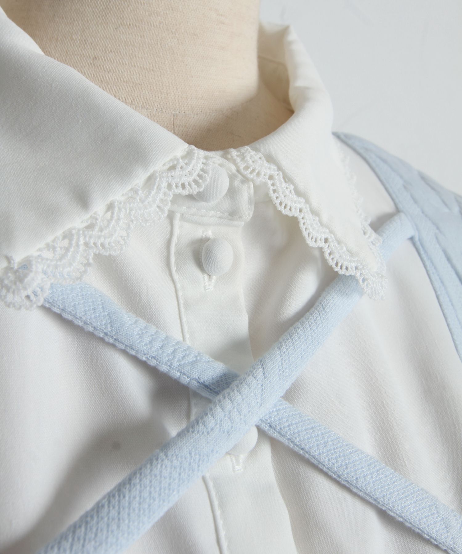 襟と袖口はスカラップカットのラインレースを装飾し、