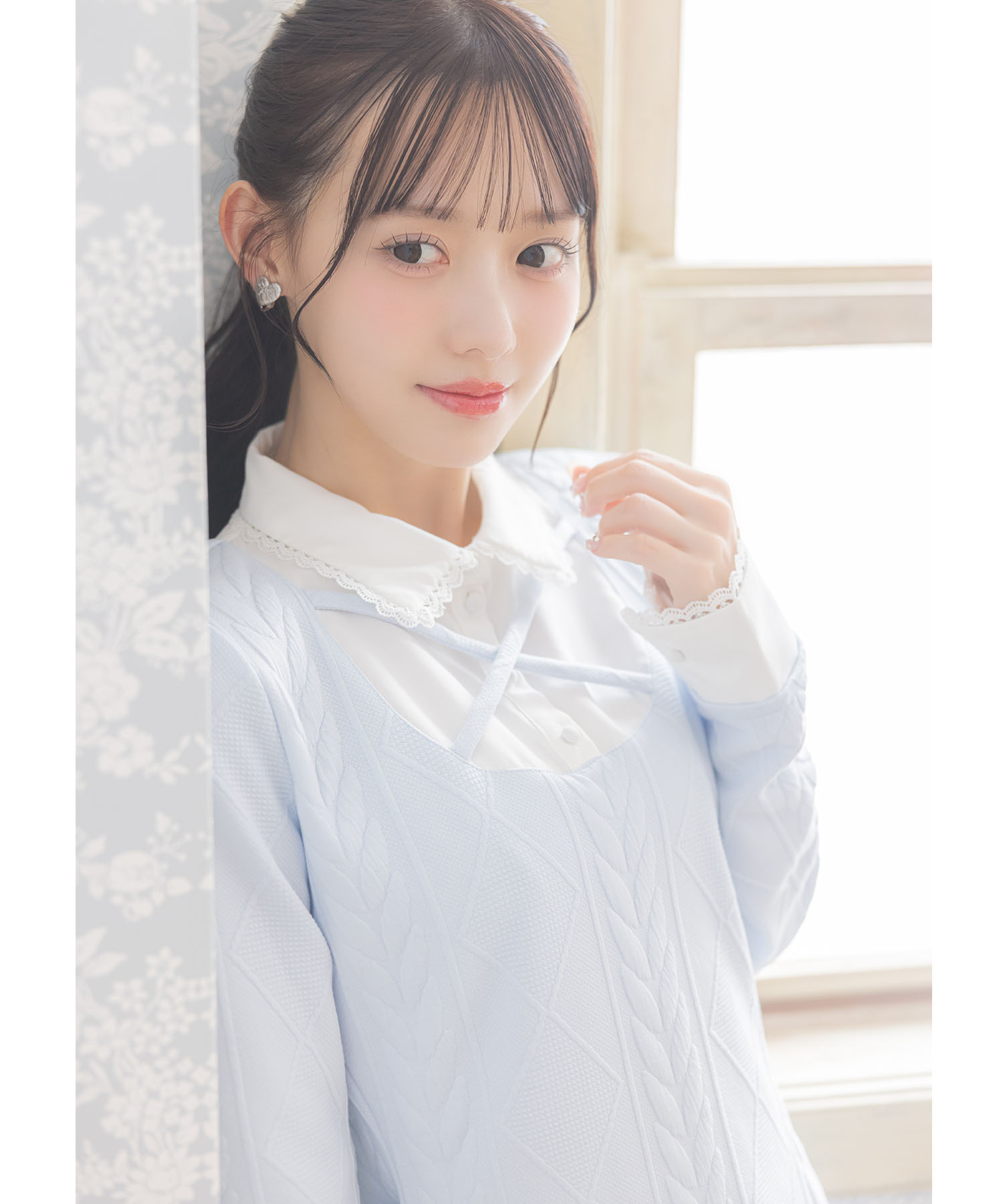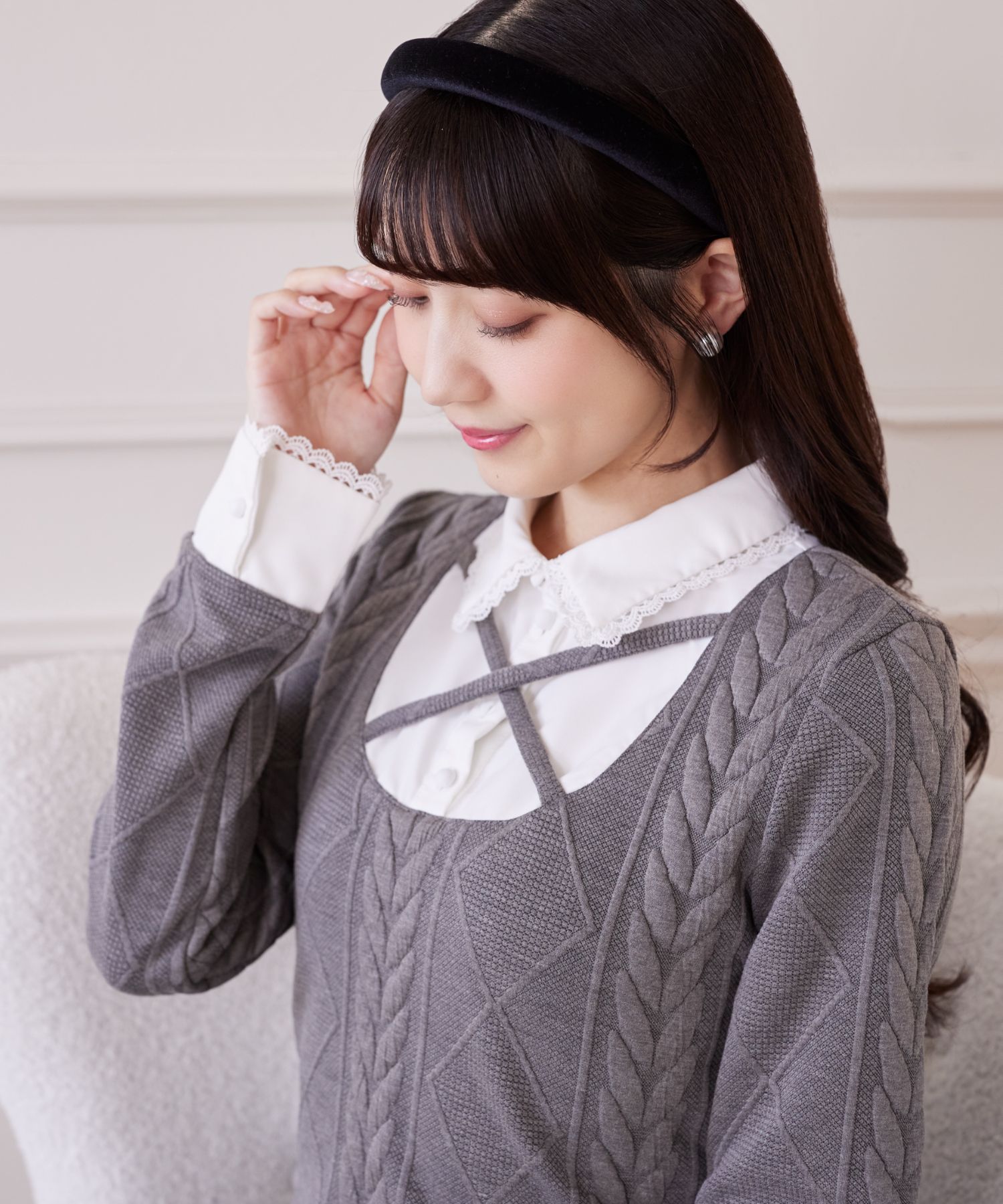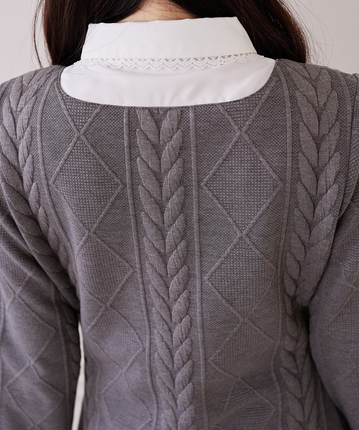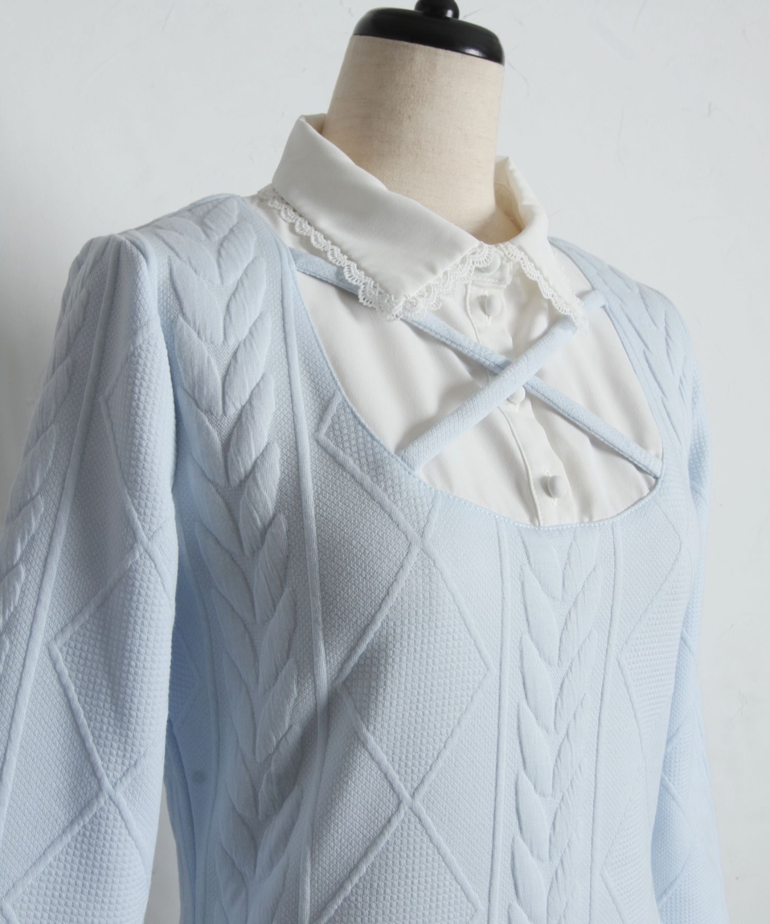 襟と袖口はスカラップカットのラインレースを装飾し、