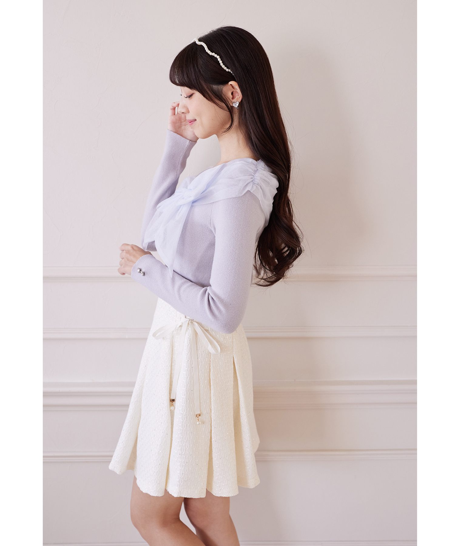 袖口ビジュー付きラメシアーリボン切り替えニットプルオーバー