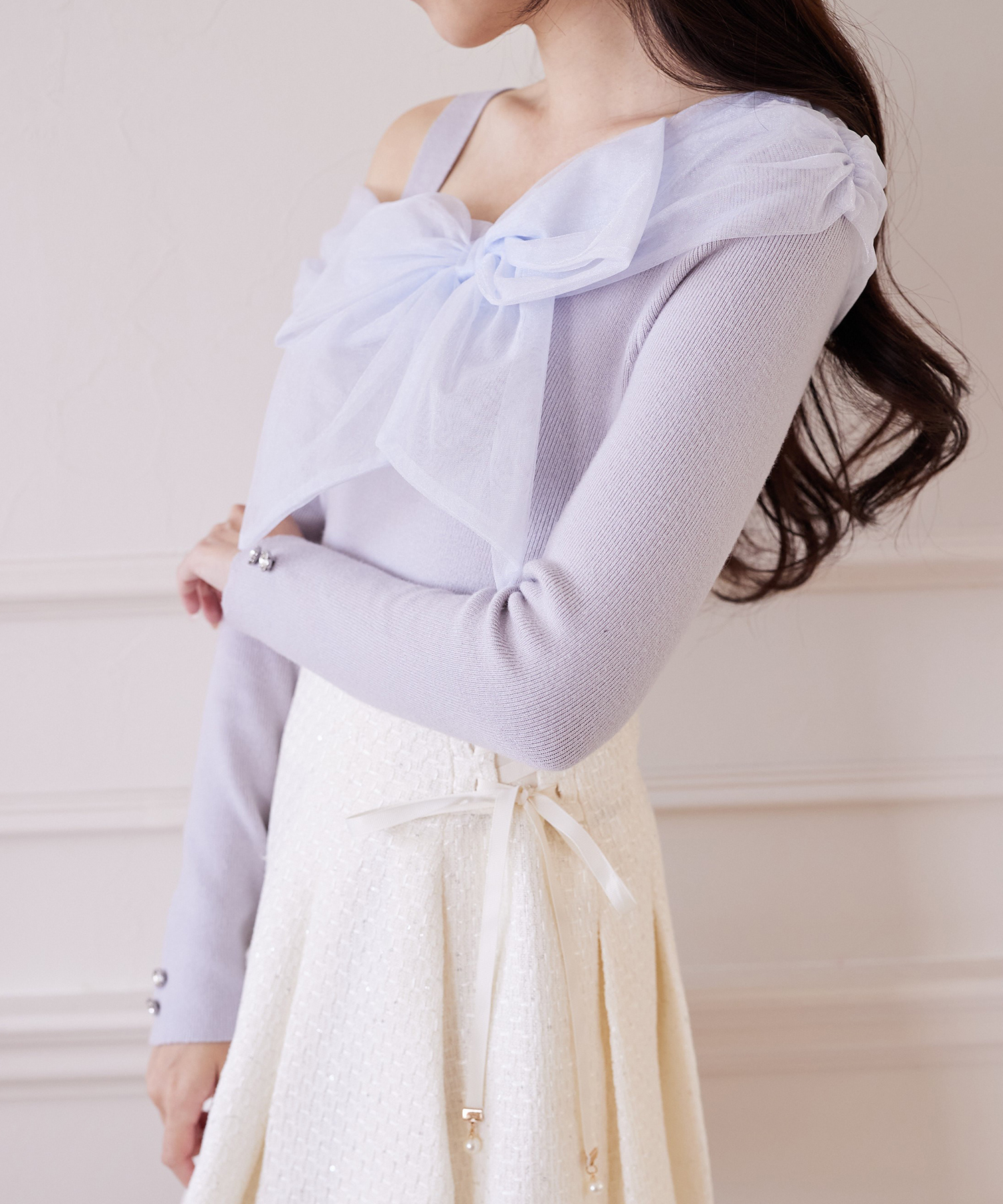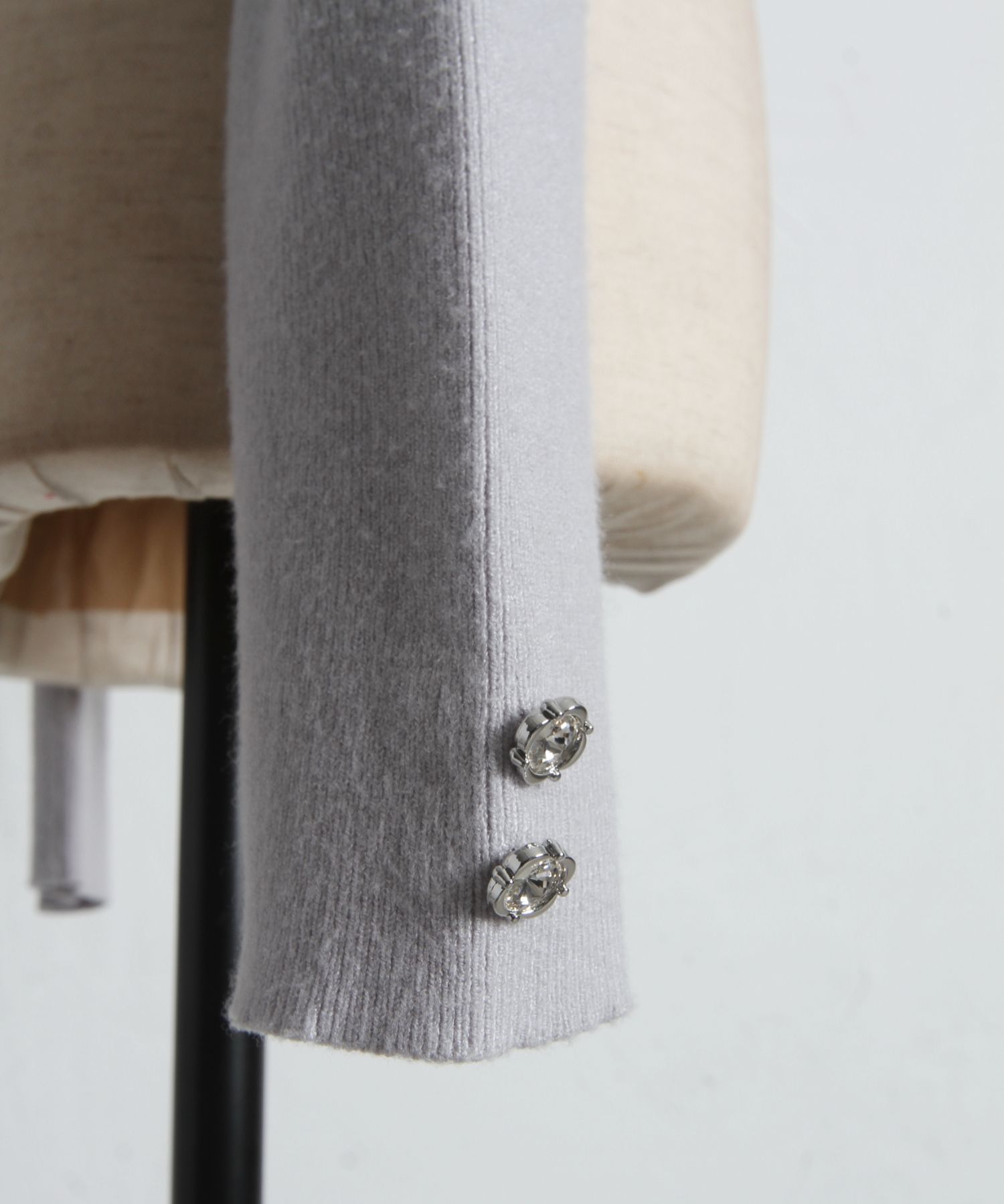袖口にはクリアビジューの飾り釦を施し、