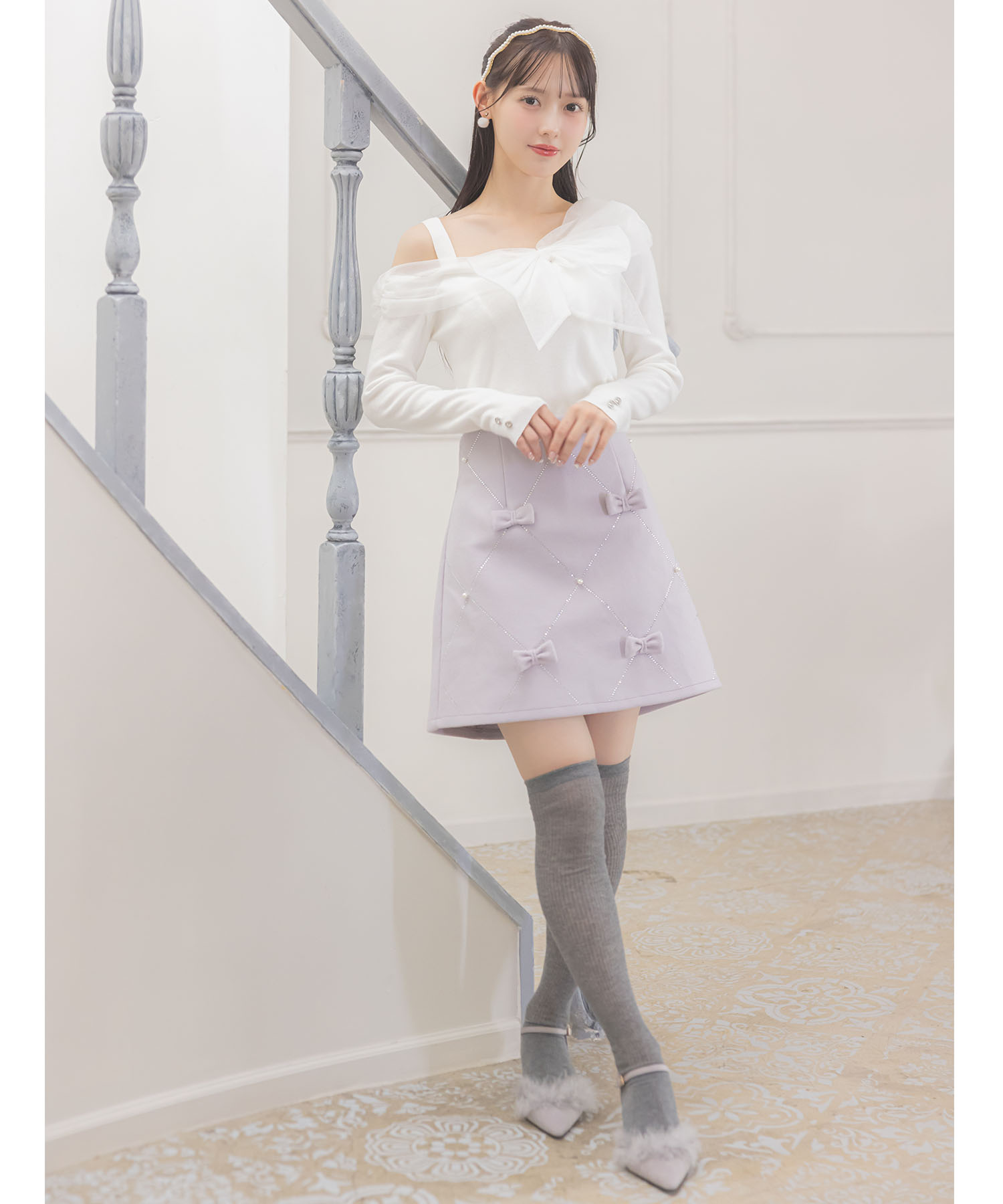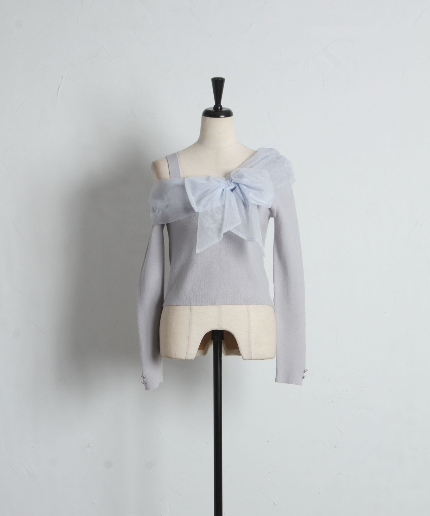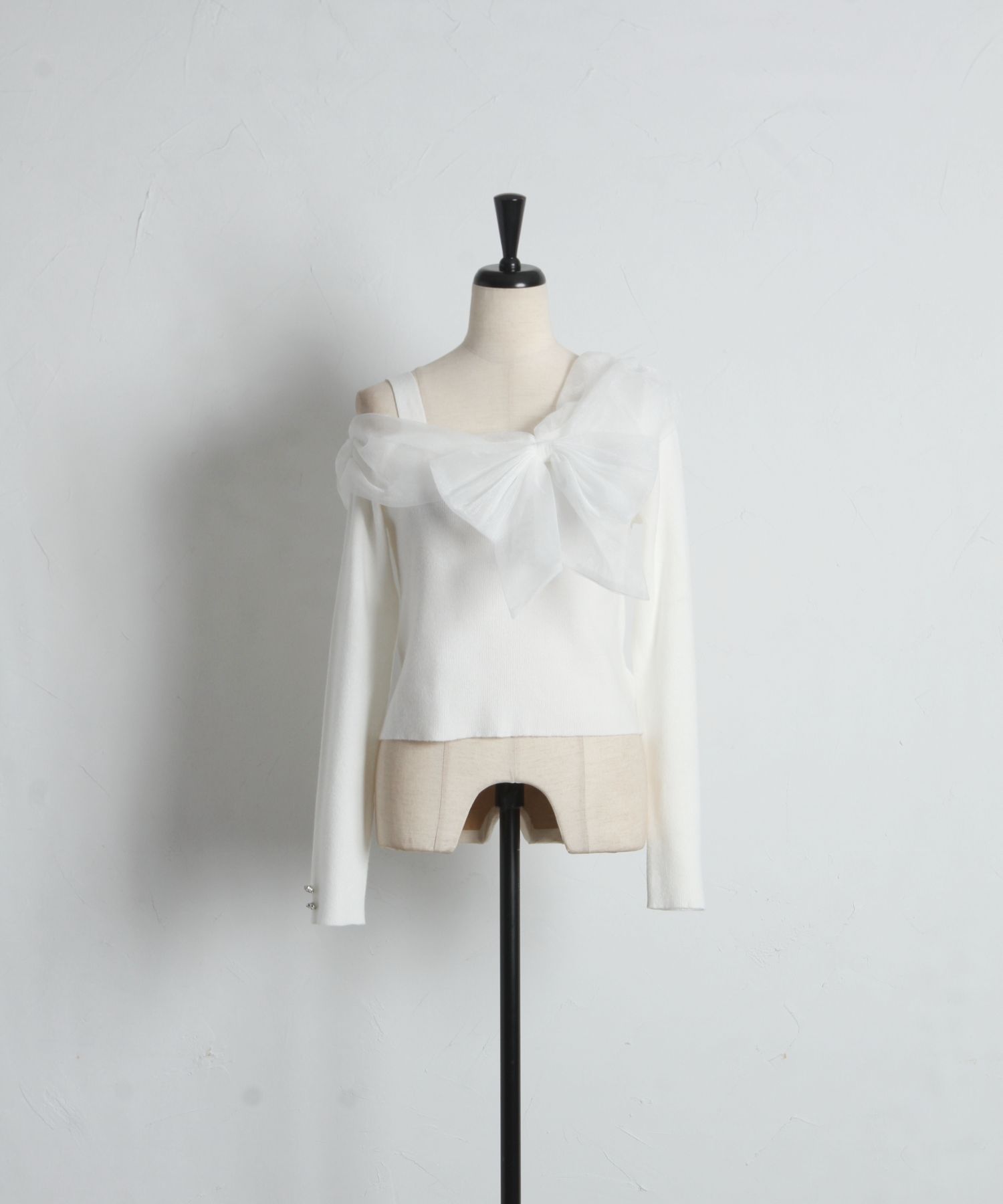色っぽさが薫る切り替えニットプルオーバー。 ほんのり上品に煌めくラメ入りのシアー生地で 大きなリボンをあしらいました。 オフショルデザインでデコルテ美人に♪ 袖口にはクリアビジューの飾り釦を施し、 手元の仕草までエレガントに仕上げました◎ シンプルなボトムスと合わせるだけで着映えます。 |