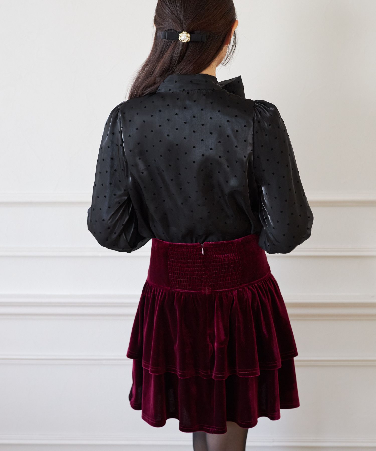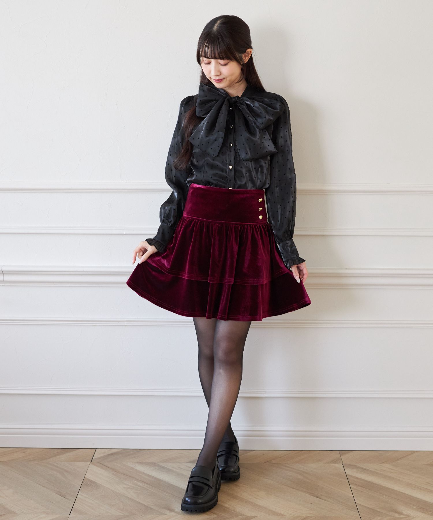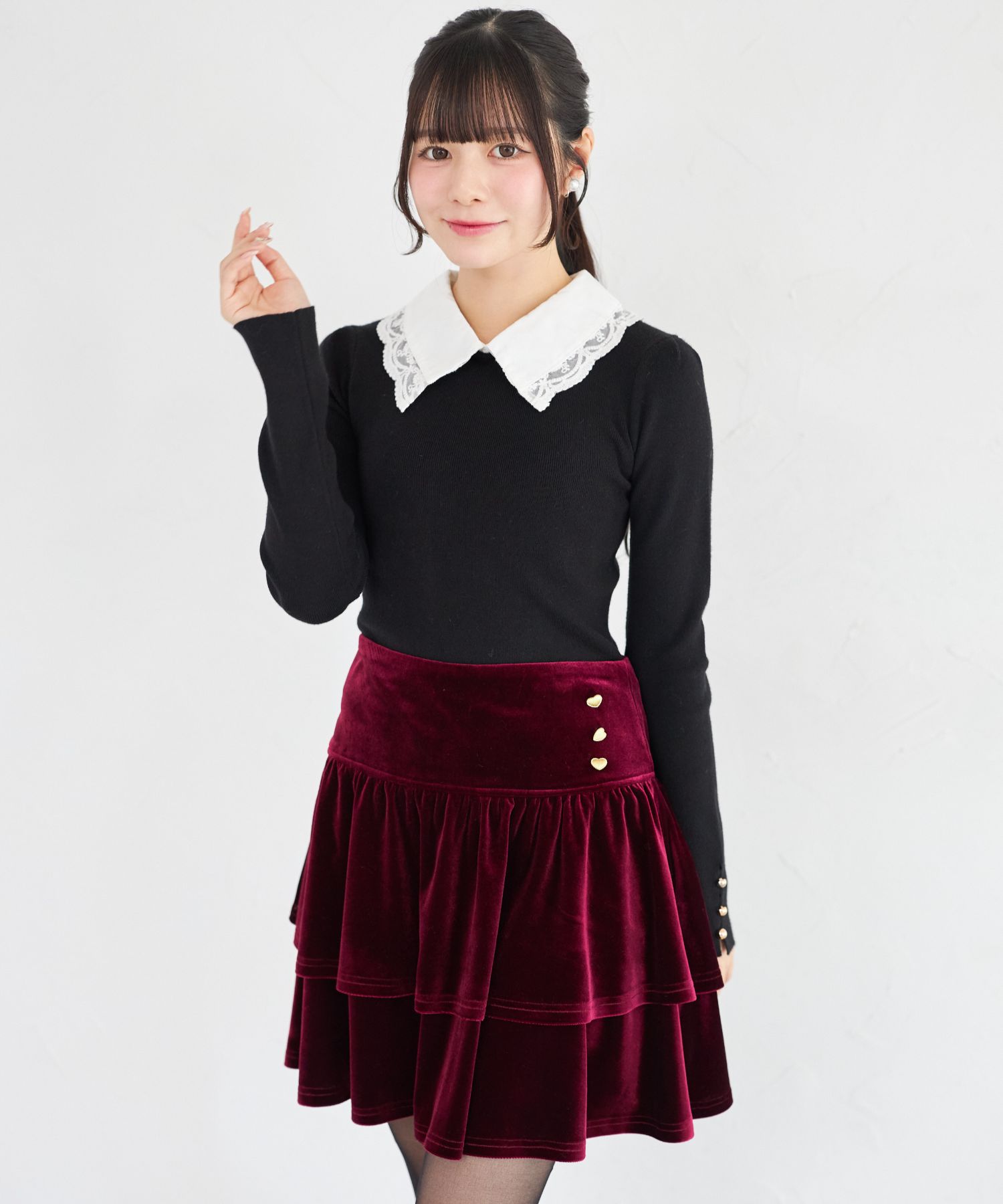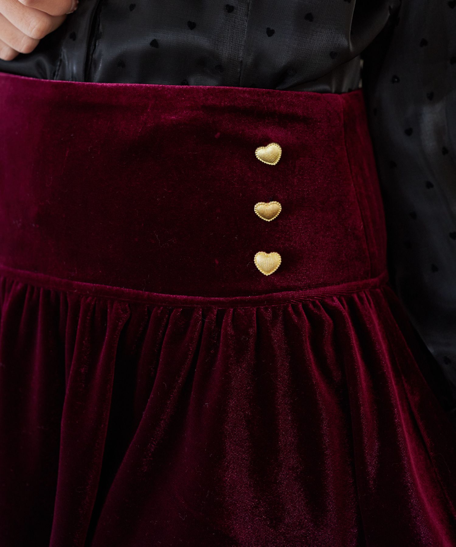 シーズンライクに着映えるベロア生地のスカート。 取り外し可能な2WAY仕様のサスペンダーには リボンを施し、ガーリーな甘さを添えました♪ 細見えを叶えるウエスト切り替えのサイドに ボルドーにはゴールドのハート飾り釦、 ブラックにはシルバーのハート飾り釦をあしらい、 愛らしいアクセントをプラスしました。 インナーがパンツ仕様なのも嬉しいポイント。 ティアードデザインのミニ丈でブーツとも相性抜群! いつものトップスに合わせるだけで旬顔に◎ |