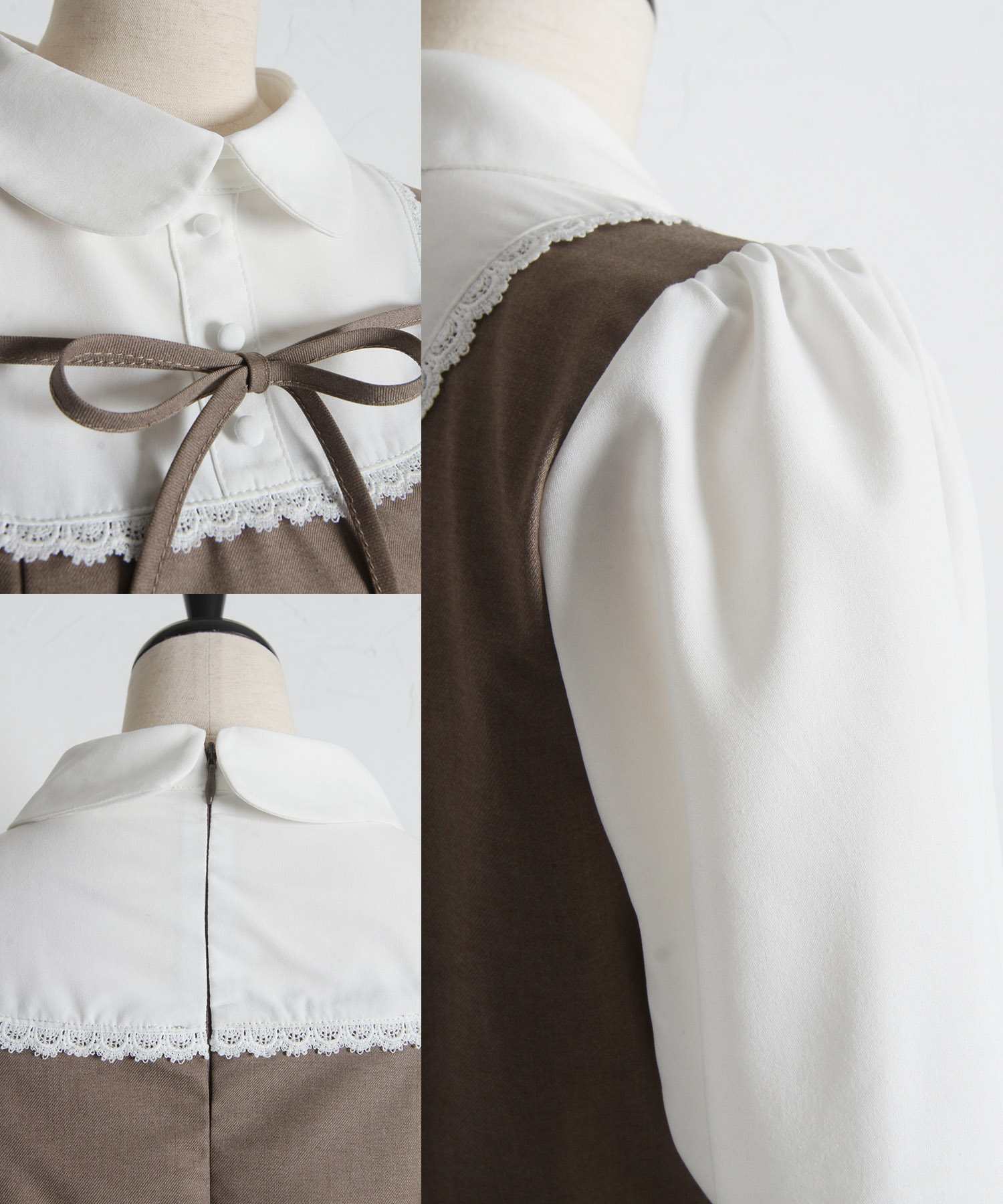リボン付きラインレース装飾シャツ切り替えワンピース