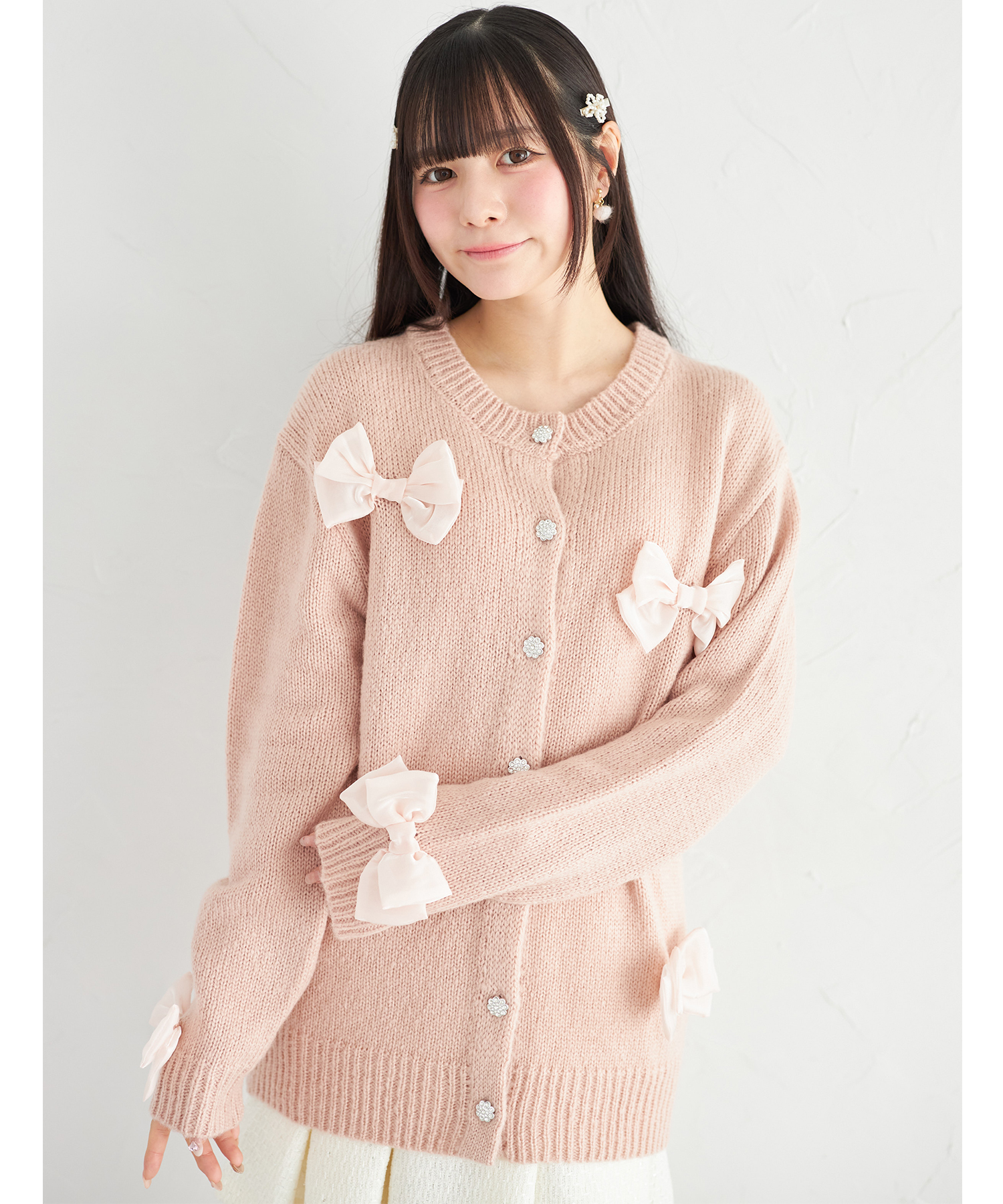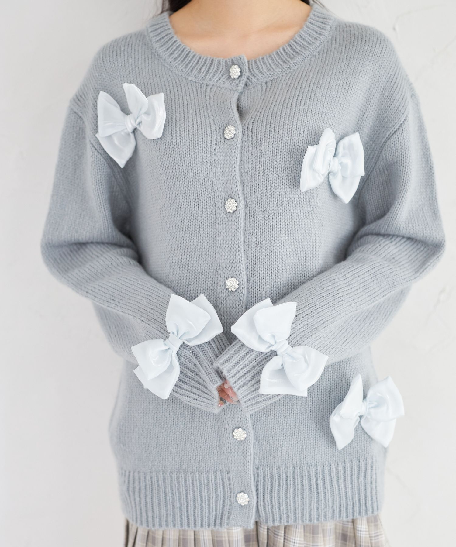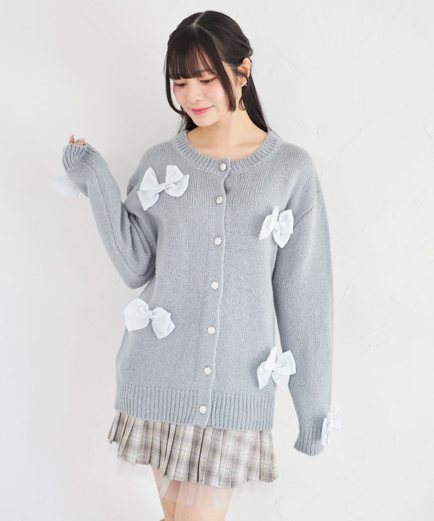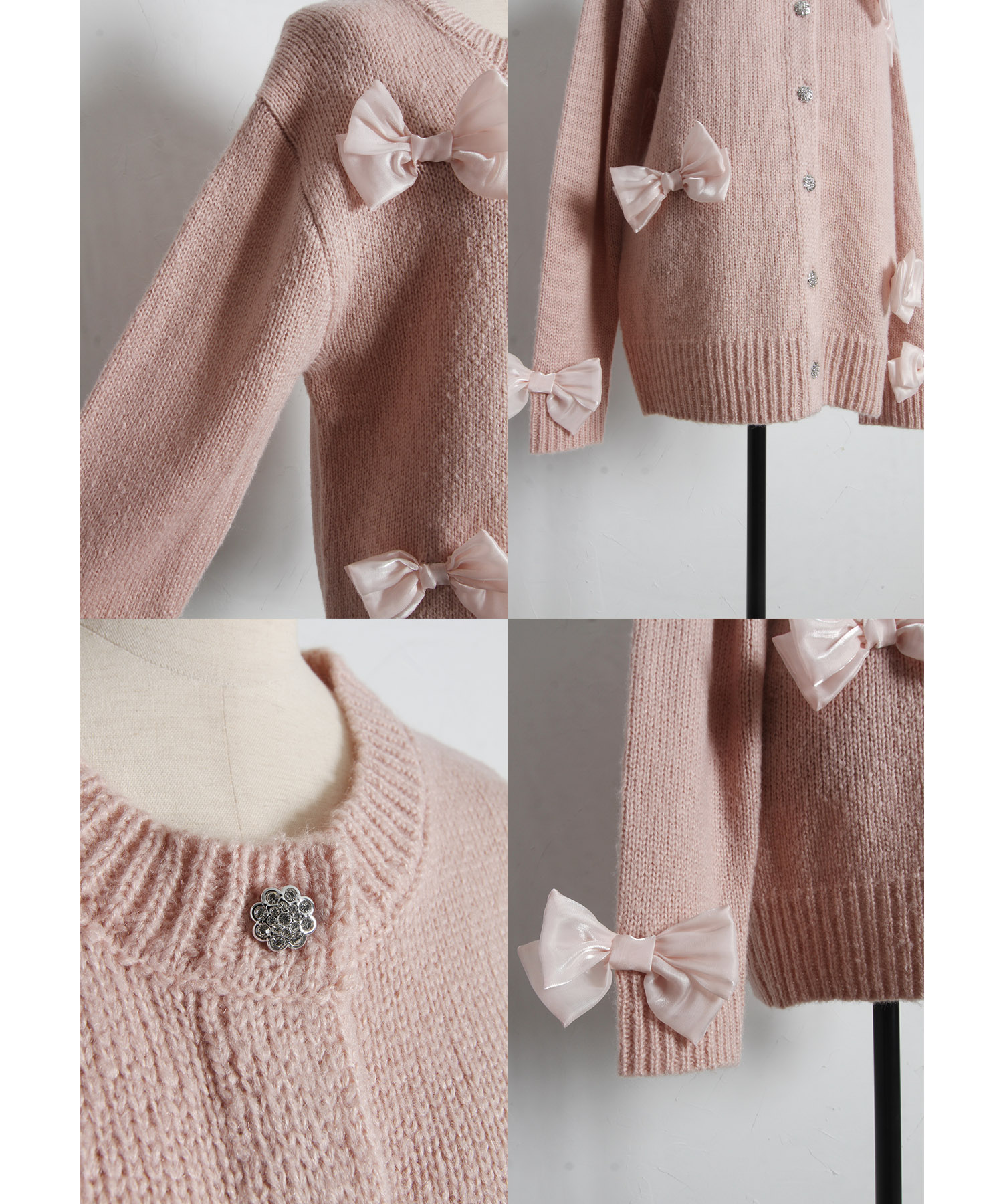 シフォンリボン付きビジュー釦ロングニットカーディガン