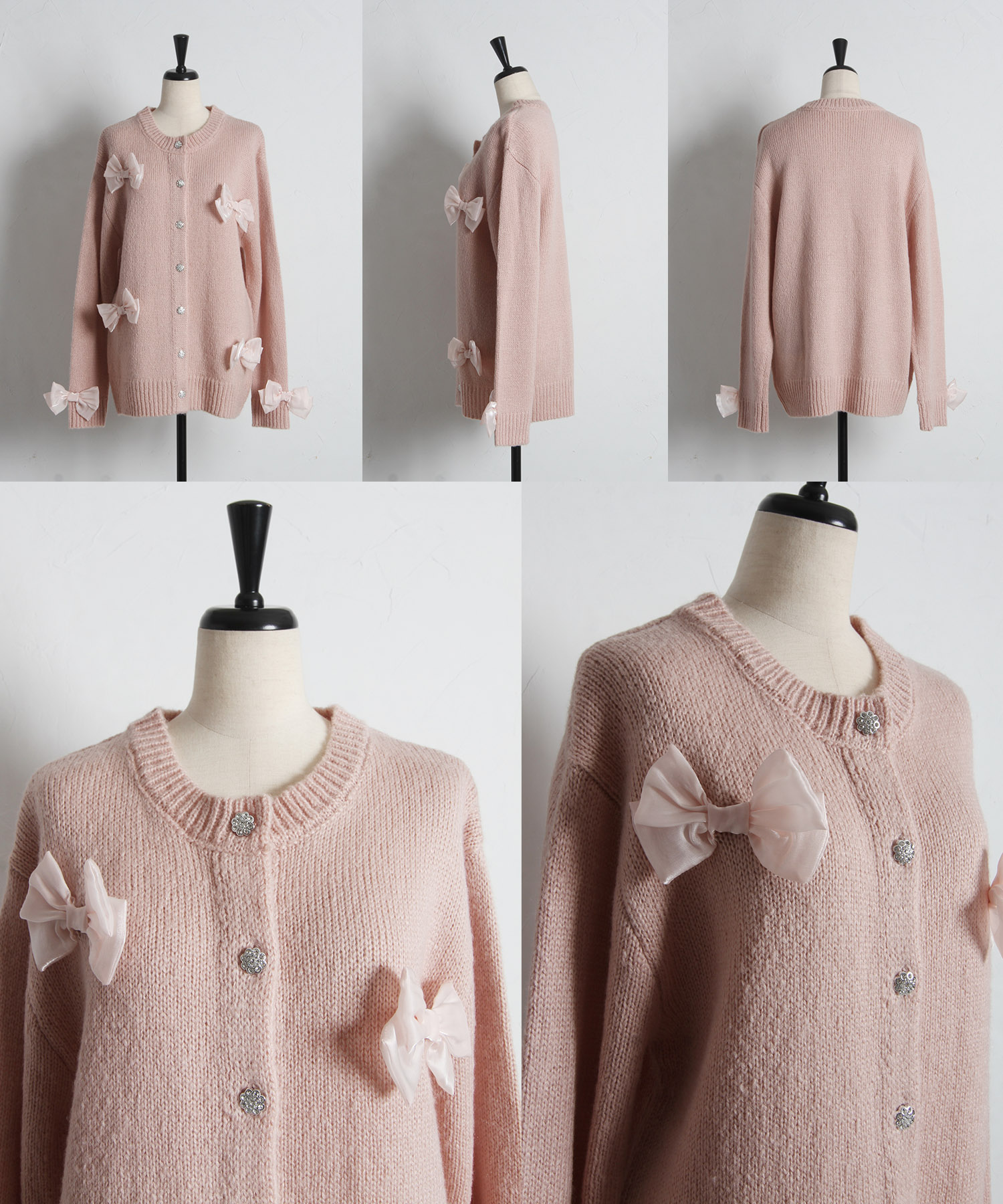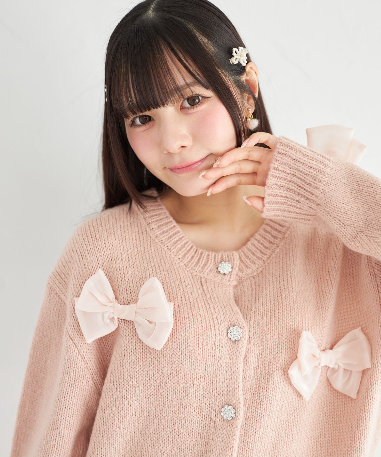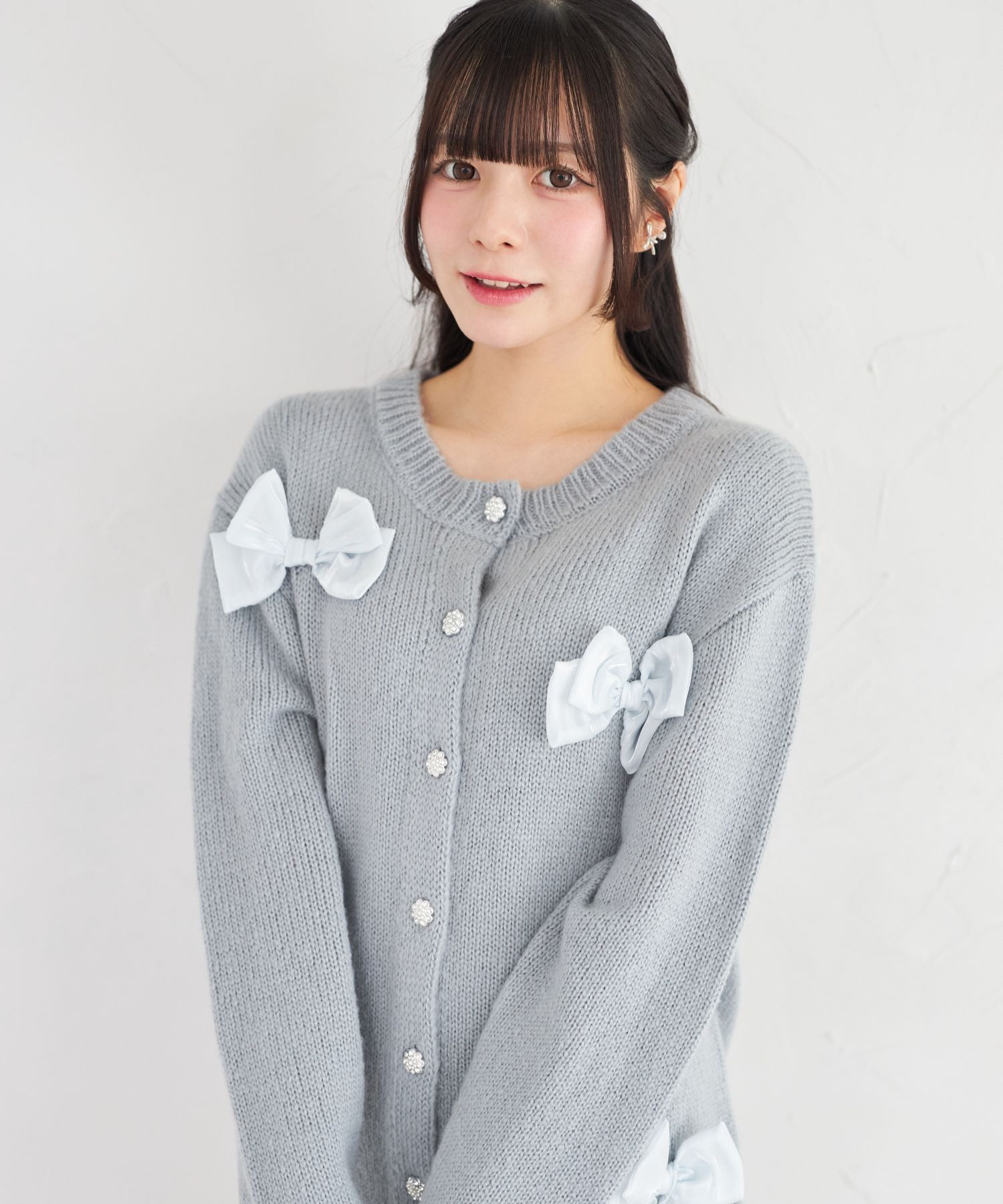 シフォンリボン付きビジュー釦ロングニットカーディガン