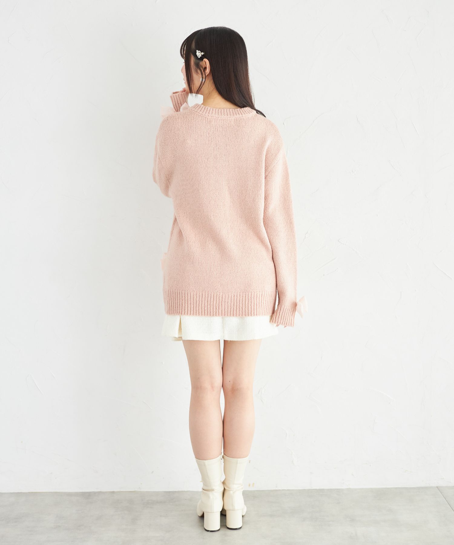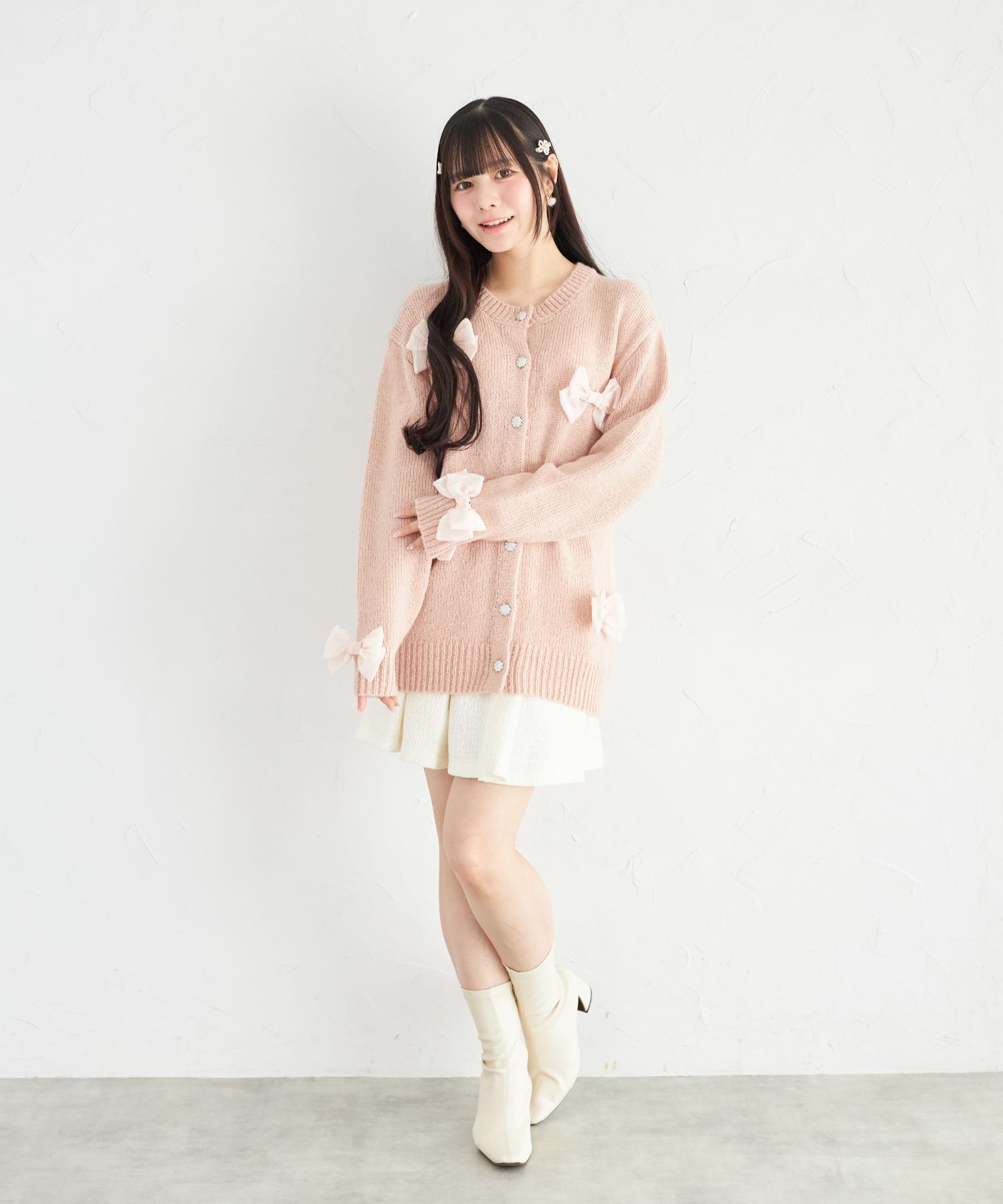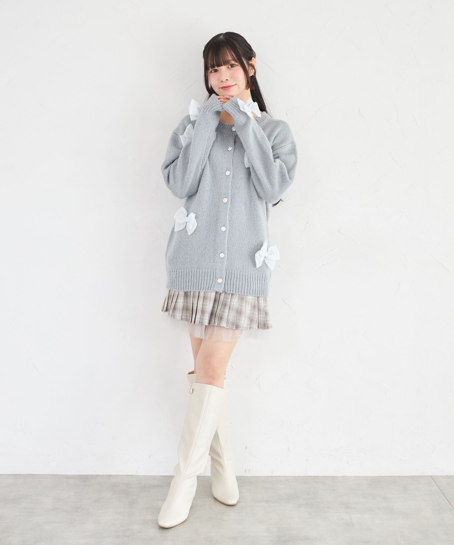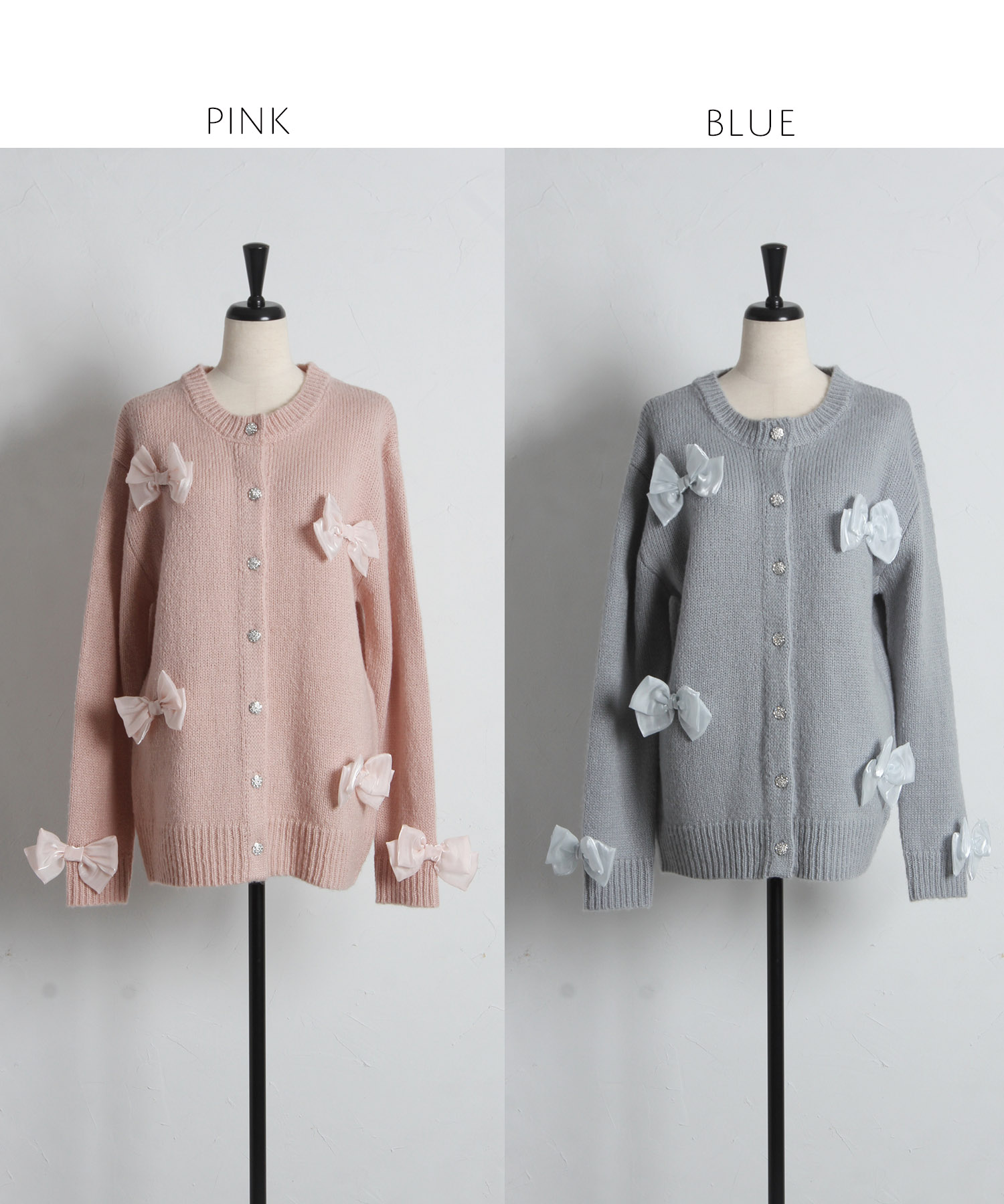 シフォンリボン付きビジュー釦ロングニットカーディガン