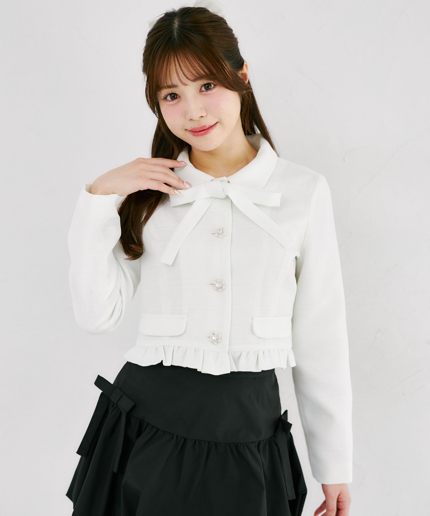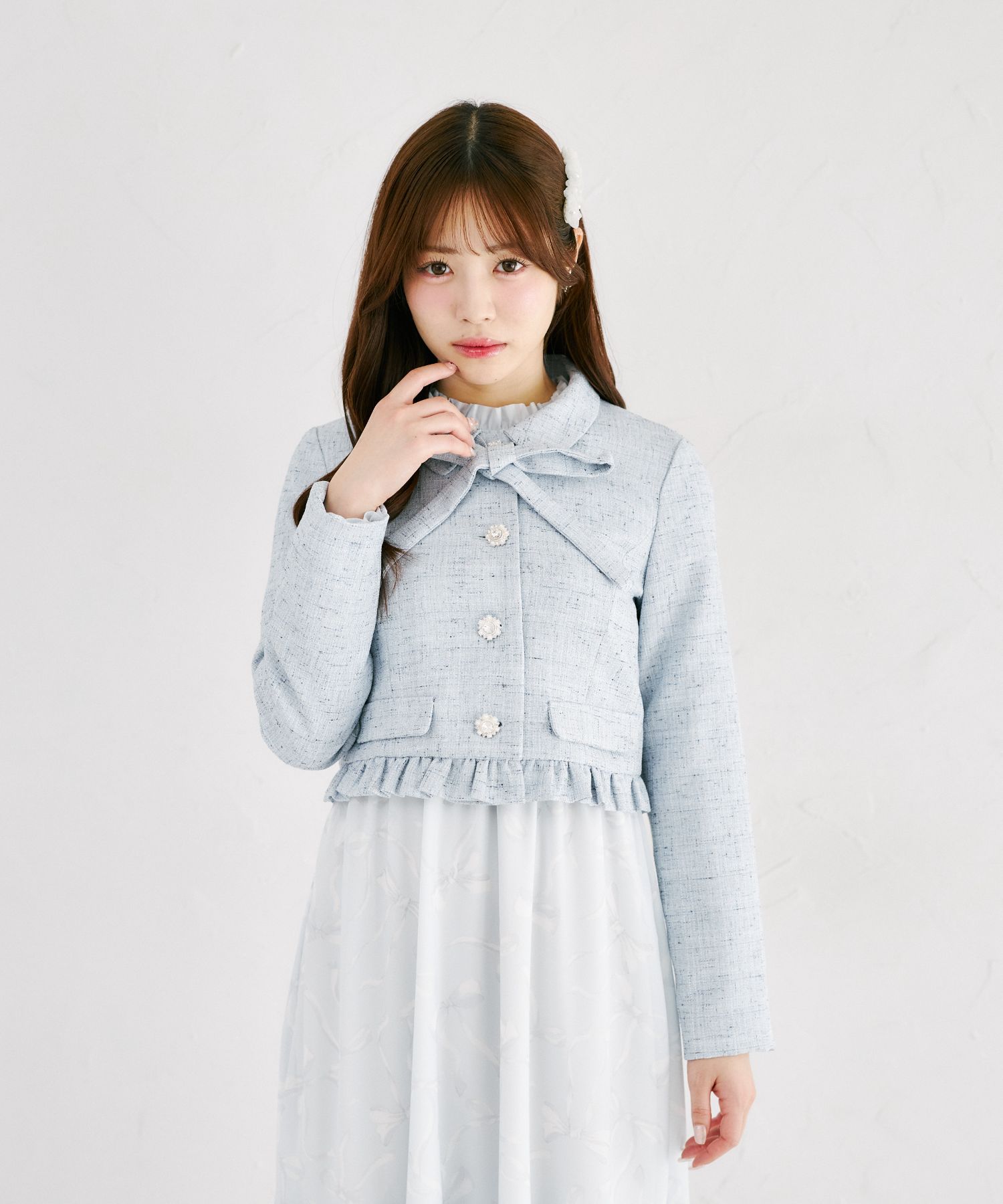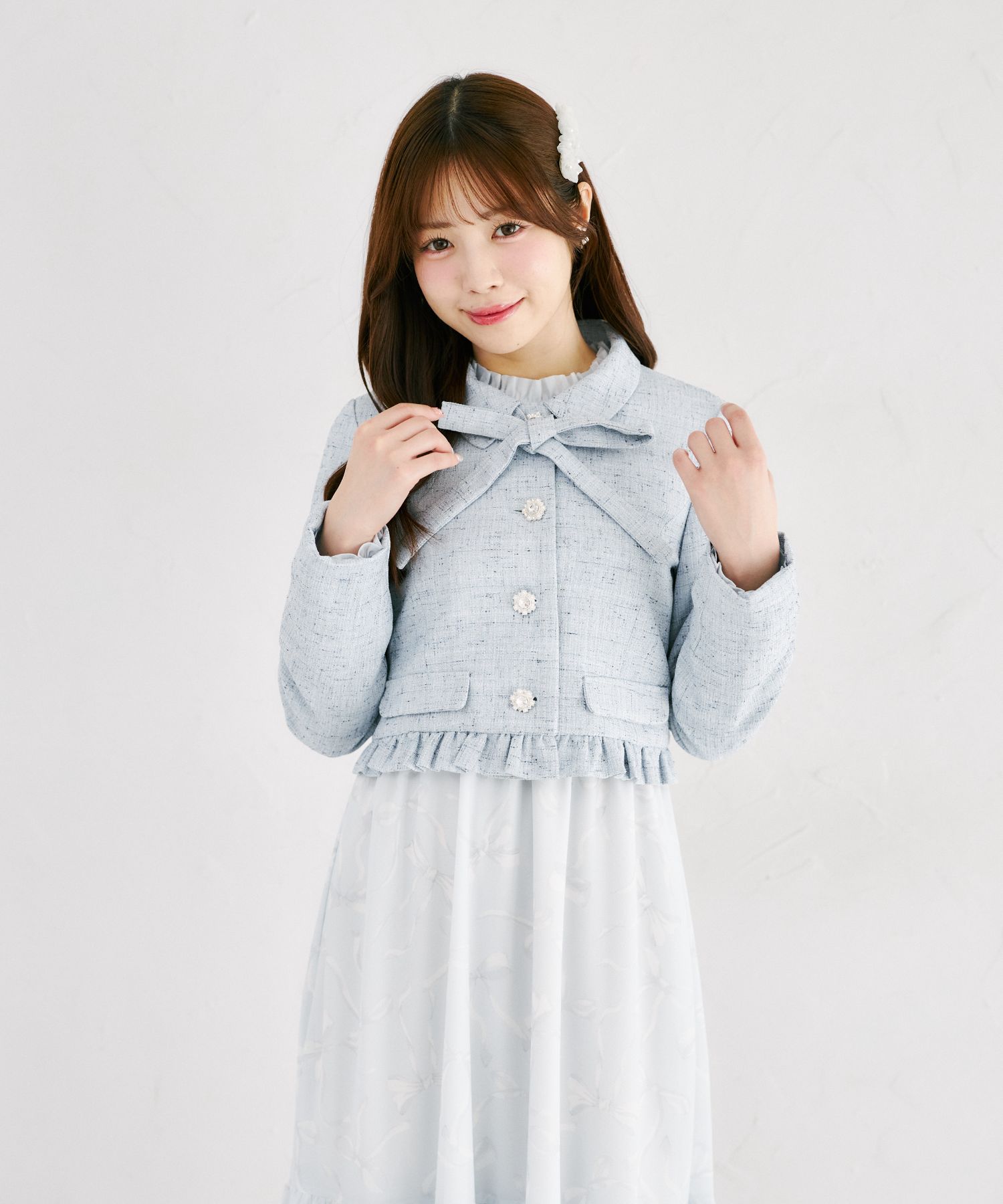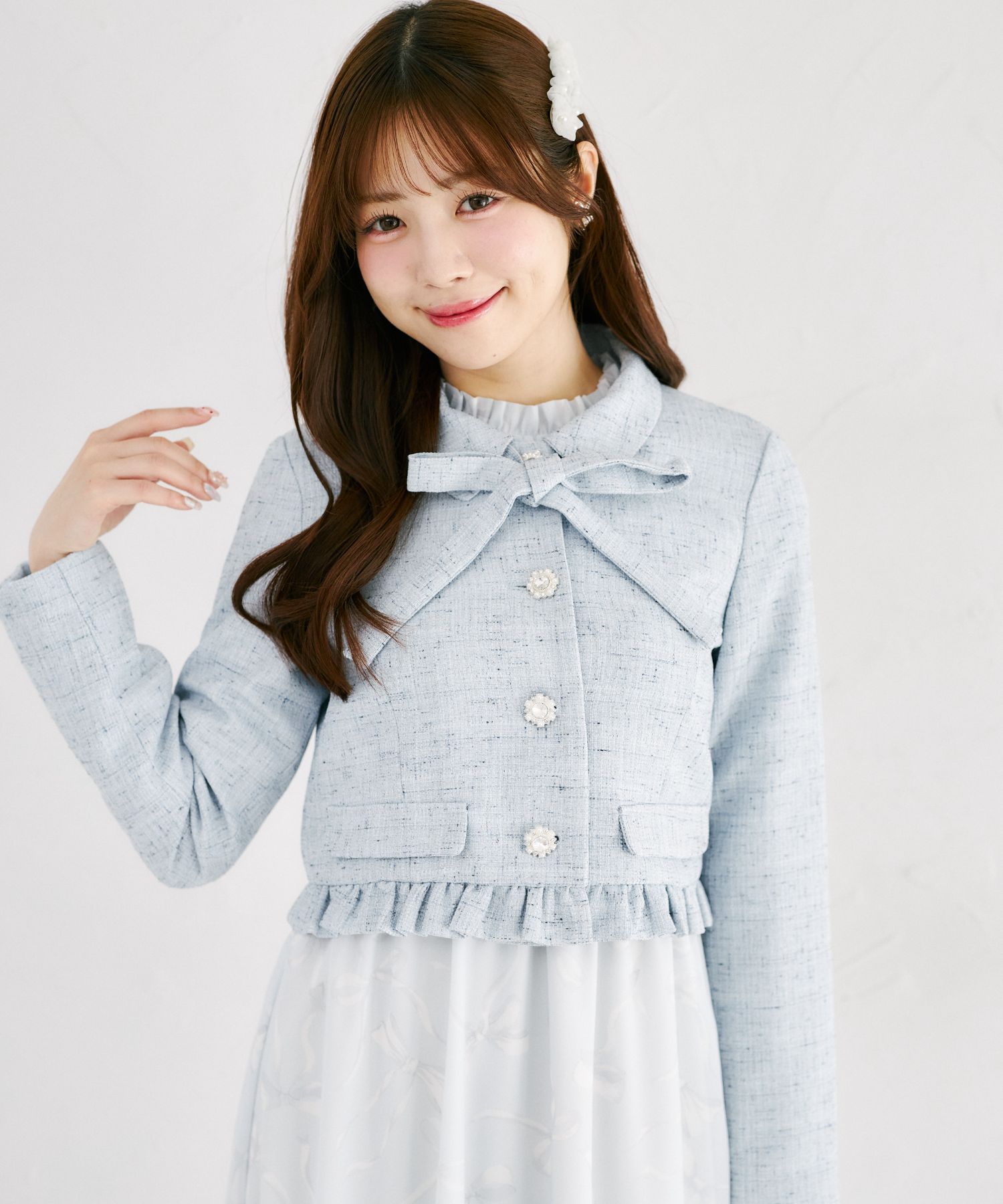 クラシカルな気品と愛らしさを纏うジャケット。 爽やかなカラーの高級感のあるツイード生地で エレガントな上品感を演出♪ 首元のリボンは取り外し可能な2WAY仕様だから シーンや気分に合わせてデザインを変えられます◎ 前立てにはパール×ビジュー釦を採用し、 目を惹く華やかな洒落感を添えました。 裾の控えめなフリルが甘さを引き立てるアクセントに。 「きちんと感」と「可愛い」を両立したディティールで お呼ばれシーンでも活躍する万能な1着です。 |