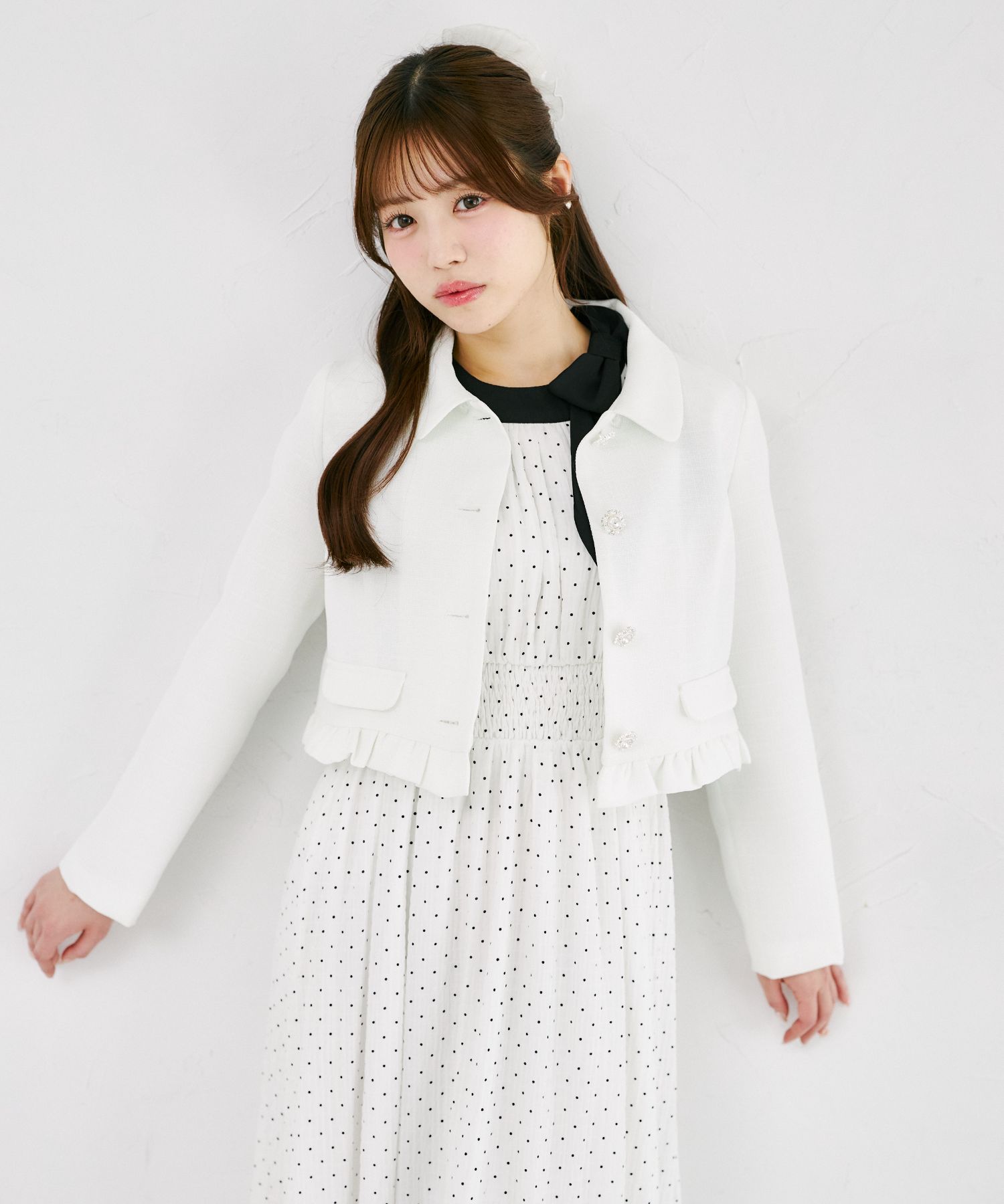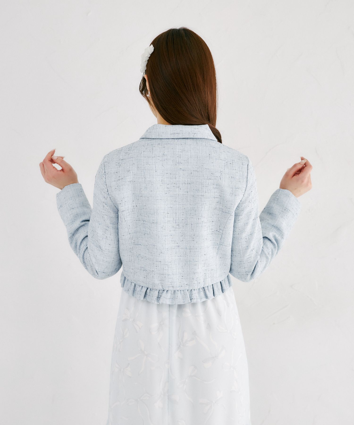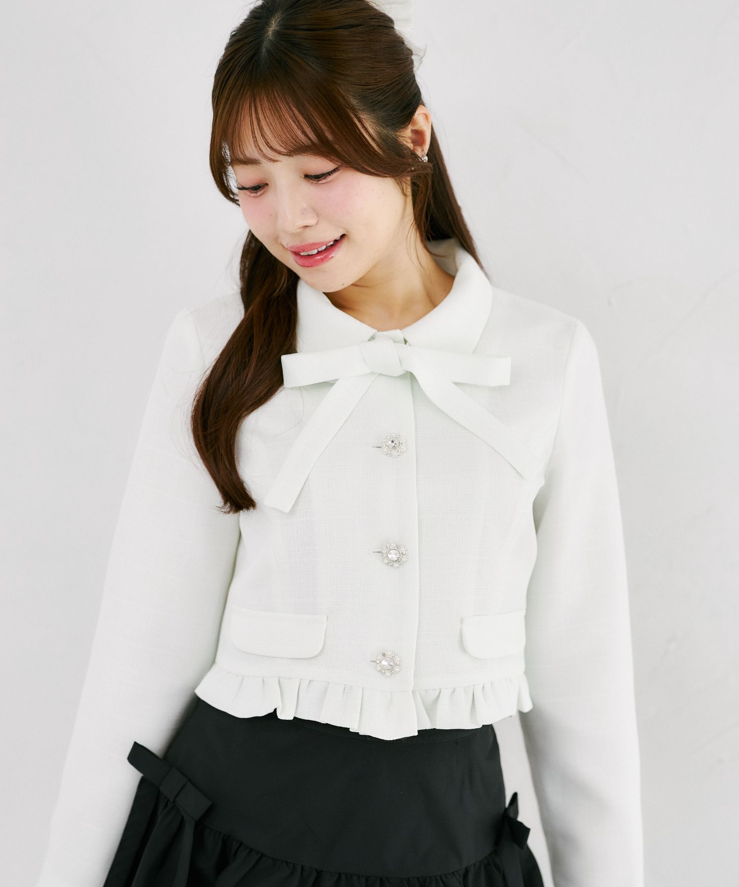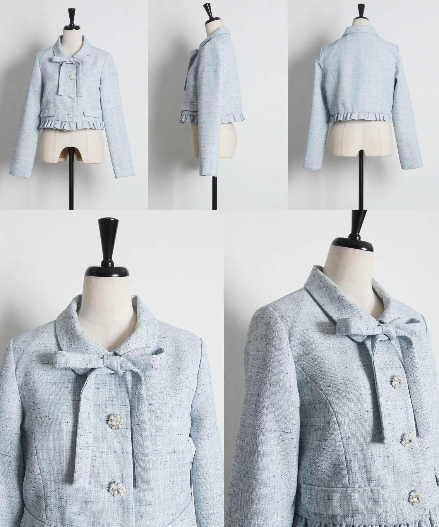 クラシカルな気品と愛らしさを纏うジャケット。 爽やかなカラーの高級感のあるツイード生地で エレガントな上品感を演出♪ 首元のリボンは取り外し可能な2WAY仕様だから シーンや気分に合わせてデザインを変えられます◎ 前立てにはパール×ビジュー釦を採用し、 目を惹く華やかな洒落感を添えました。 裾の控えめなフリルが甘さを引き立てるアクセントに。 「きちんと感」と「可愛い」を両立したディティールで お呼ばれシーンでも活躍する万能な1着です。 |