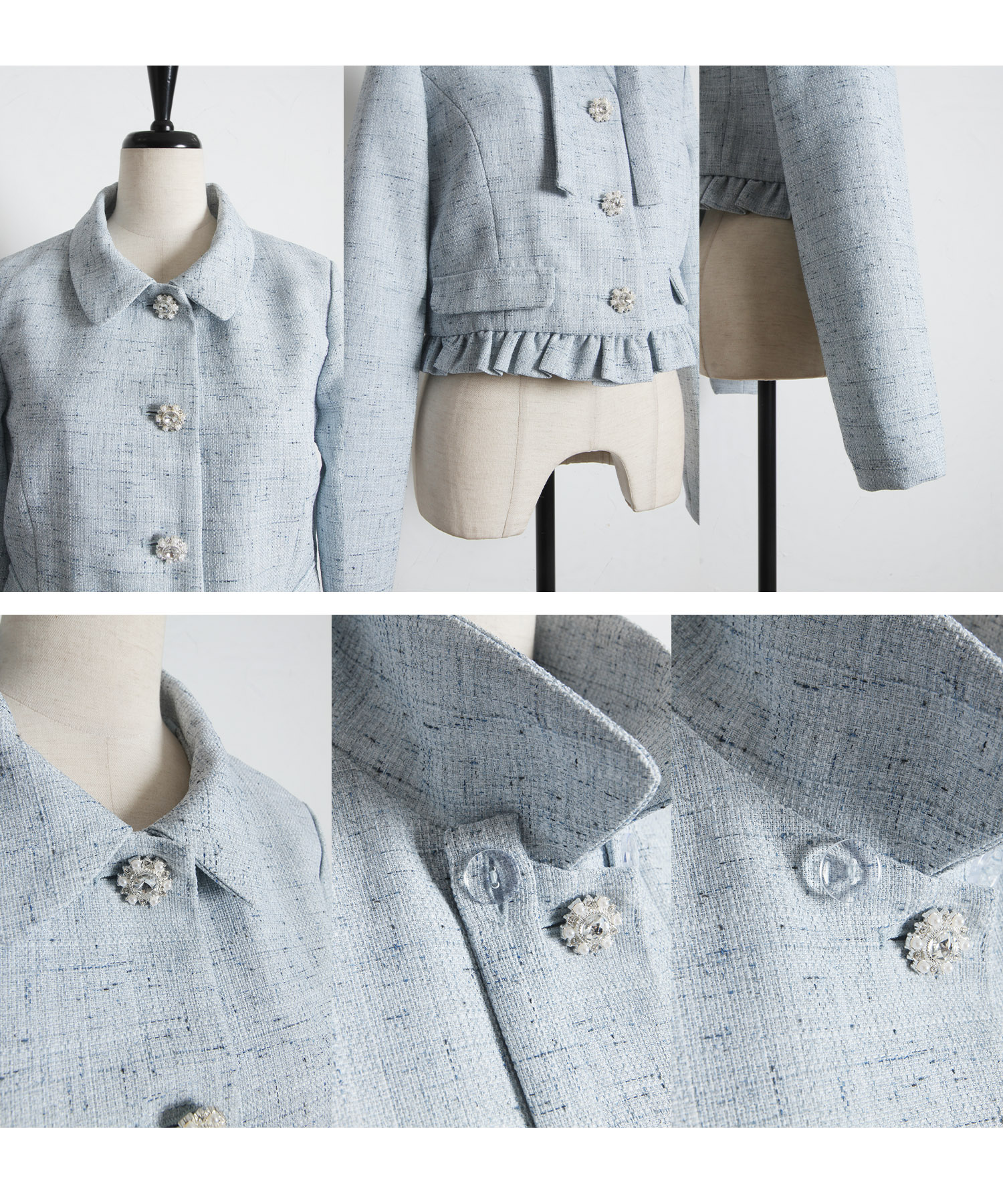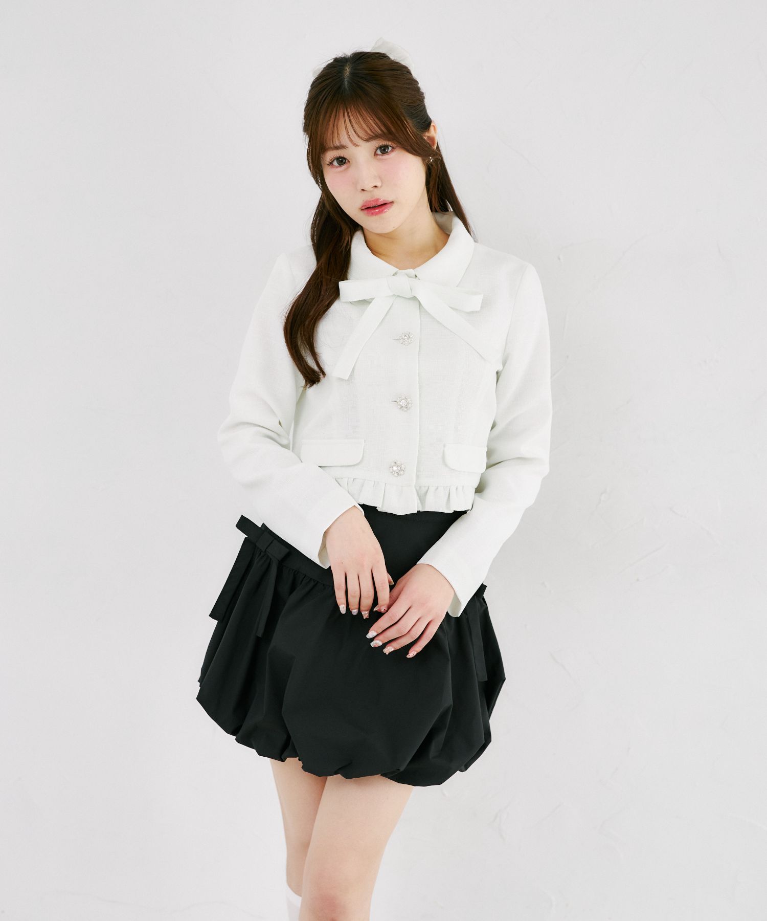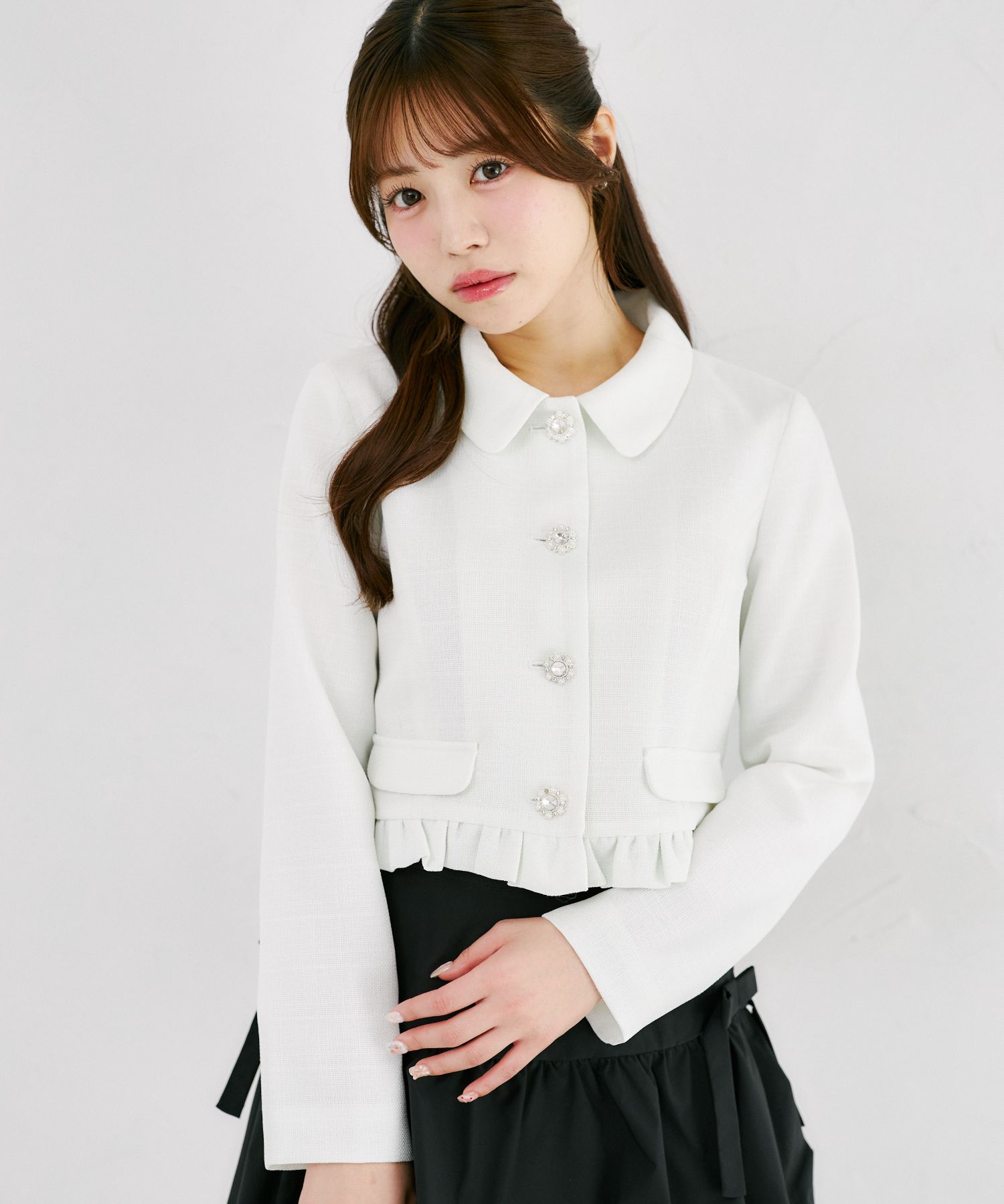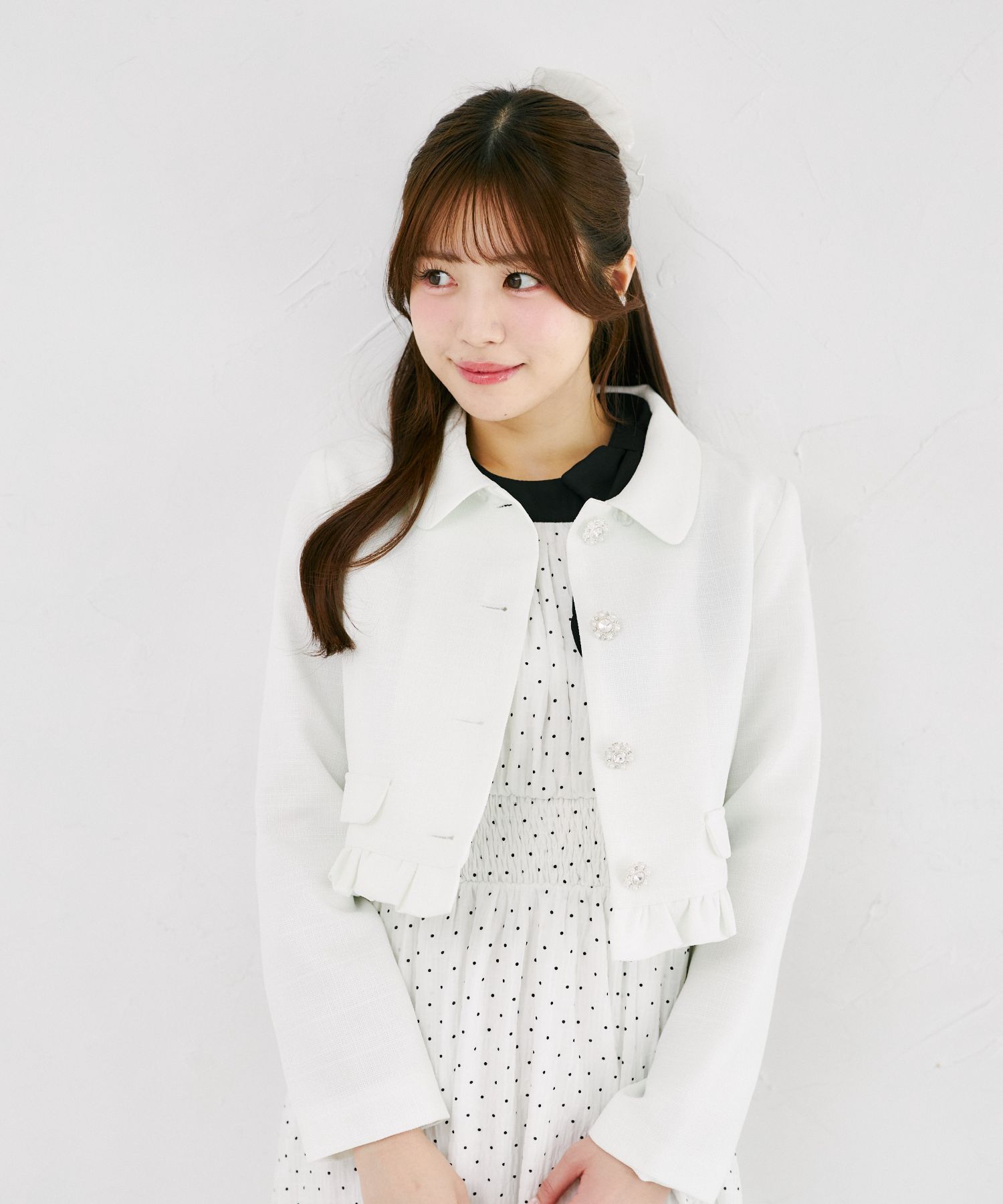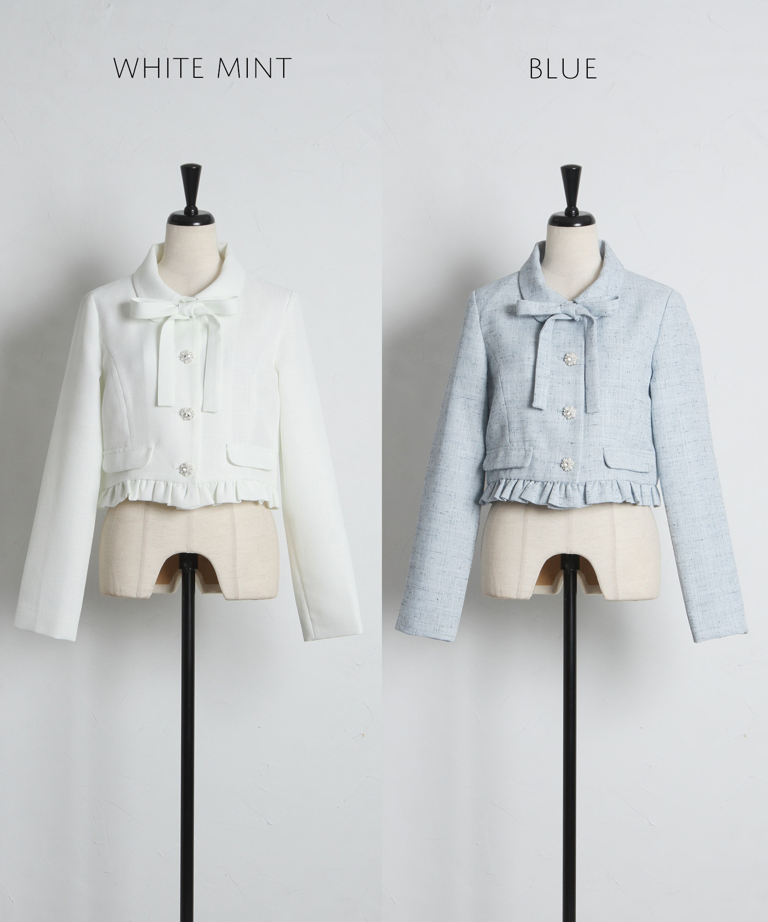 クラシカルな気品と愛らしさを纏うジャケット。 爽やかなカラーの高級感のあるツイード生地で エレガントな上品感を演出♪ 首元のリボンは取り外し可能な2WAY仕様だから シーンや気分に合わせてデザインを変えられます◎ 前立てにはパール×ビジュー釦を採用し、 目を惹く華やかな洒落感を添えました。 裾の控えめなフリルが甘さを引き立てるアクセントに。 「きちんと感」と「可愛い」を両立したディティールで お呼ばれシーンでも活躍する万能な1着です。 |
