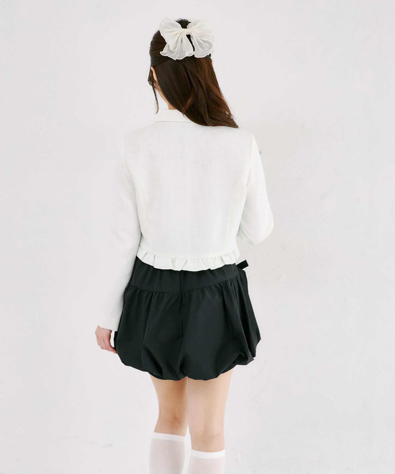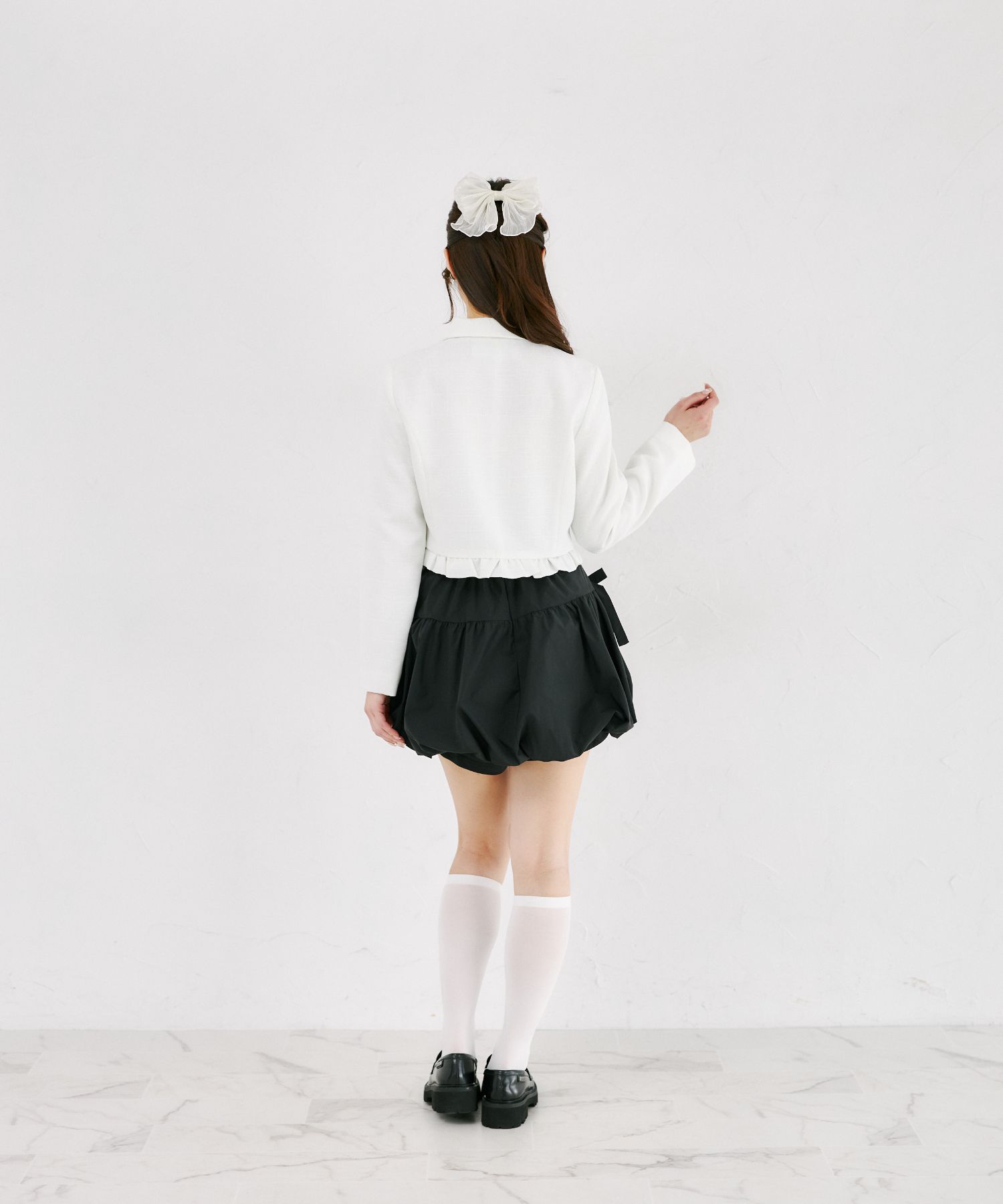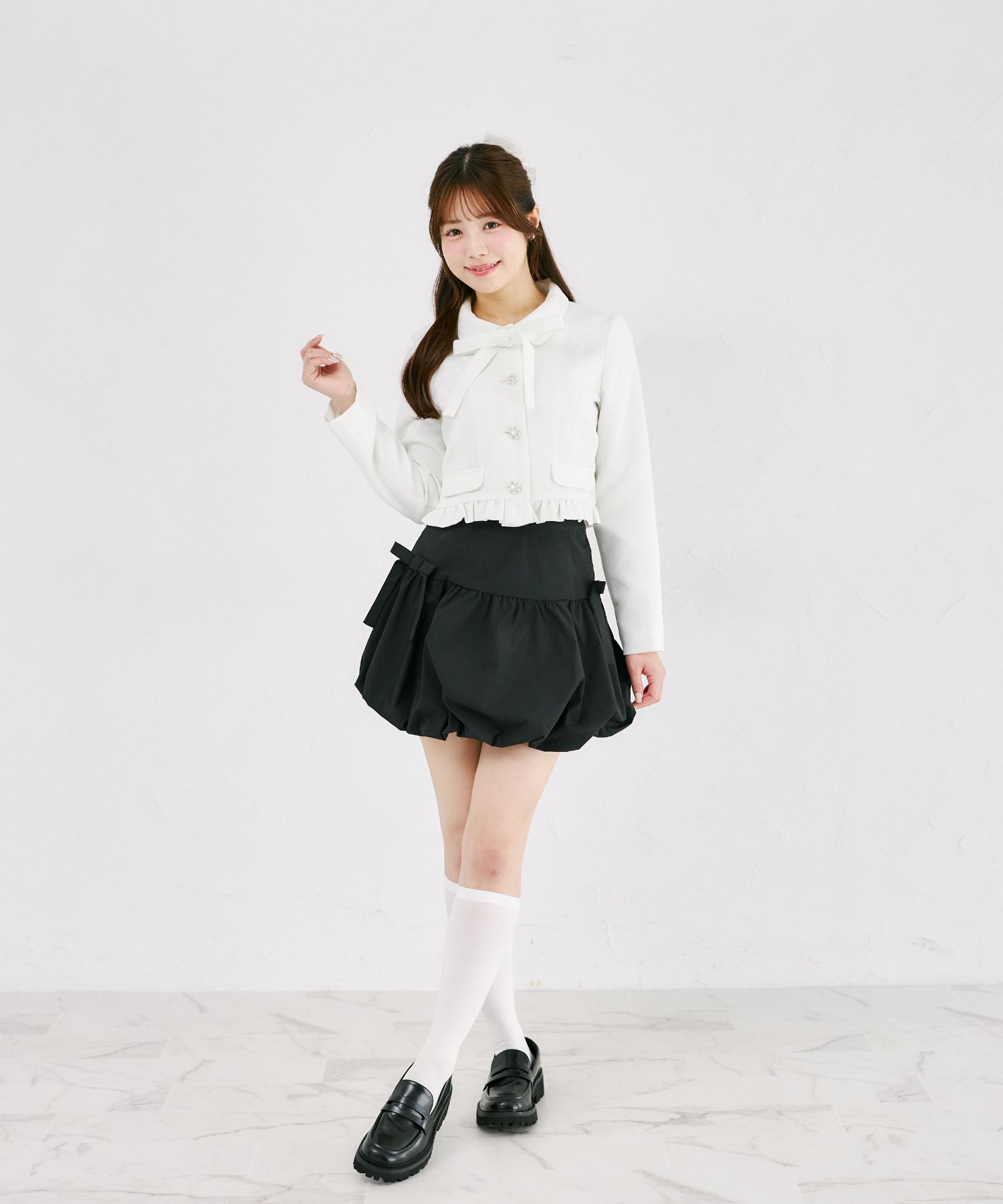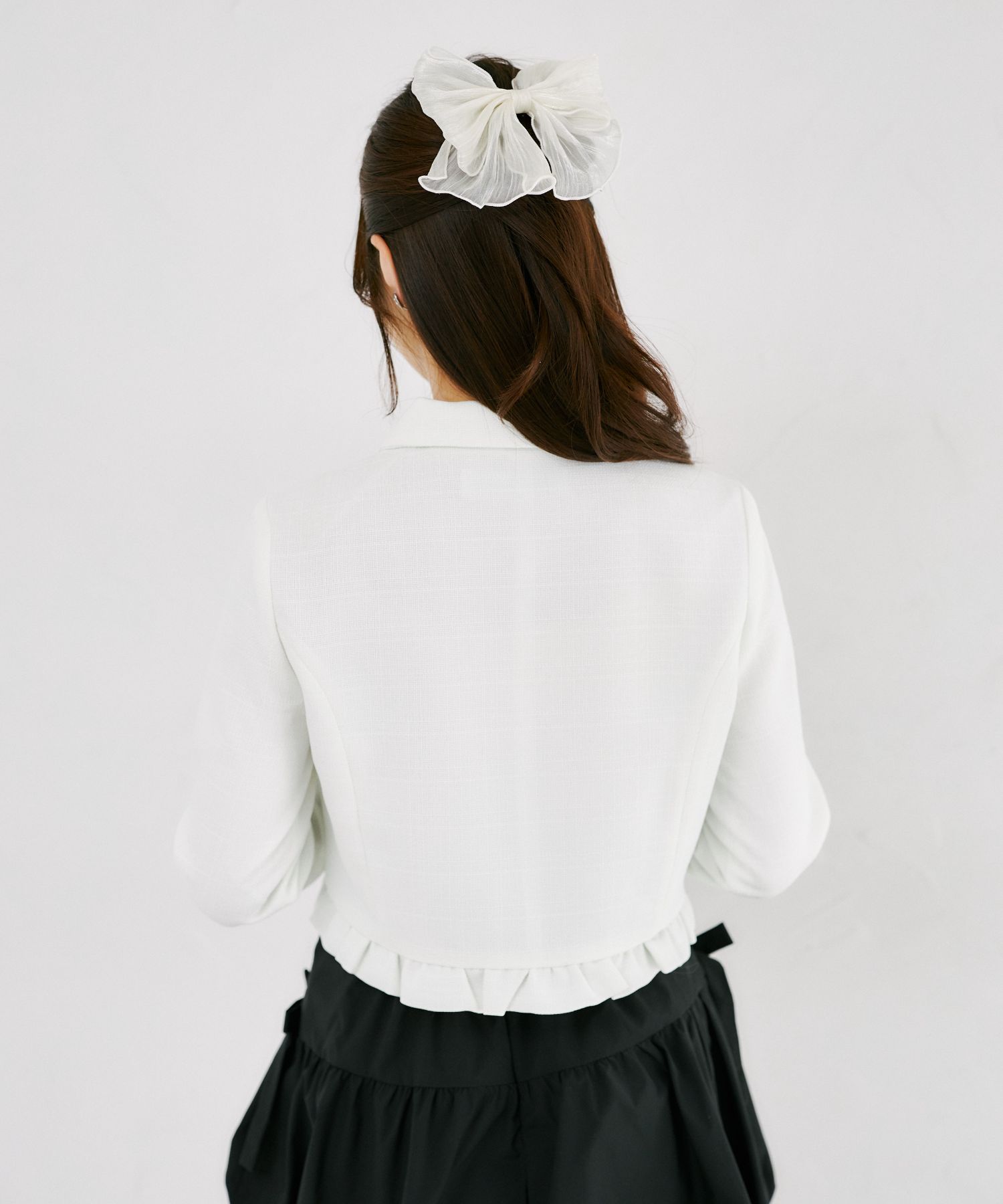クラシカルな気品と愛らしさを纏うジャケット。 爽やかなカラーの高級感のあるツイード生地で エレガントな上品感を演出♪ 首元のリボンは取り外し可能な2WAY仕様だから シーンや気分に合わせてデザインを変えられます◎ 前立てにはパール×ビジュー釦を採用し、 目を惹く華やかな洒落感を添えました。 裾の控えめなフリルが甘さを引き立てるアクセントに。 「きちんと感」と「可愛い」を両立したディティールで お呼ばれシーンでも活躍する万能な1着です。 |