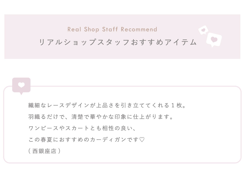清楚でありながら華やかな印象のカーディガン。 ネックラインから前立てにかけて 繊細なレースを贅沢にあしらい、高級感をプラス。 スパンコール入りのリブニット生地で さりげなく上品な煌めきを放ちます♪ 前立てにはエレガントなパール釦を採用しました。 日々の装いに透明感をもたらしてくれる1着。 |
