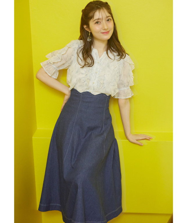 ステッチ入りウエストスカラップデニムフレアスカート ¥5,830