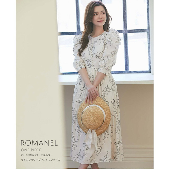 | パール付きパワーショルダー ラインフラワープリントワンピース¥7,150 |