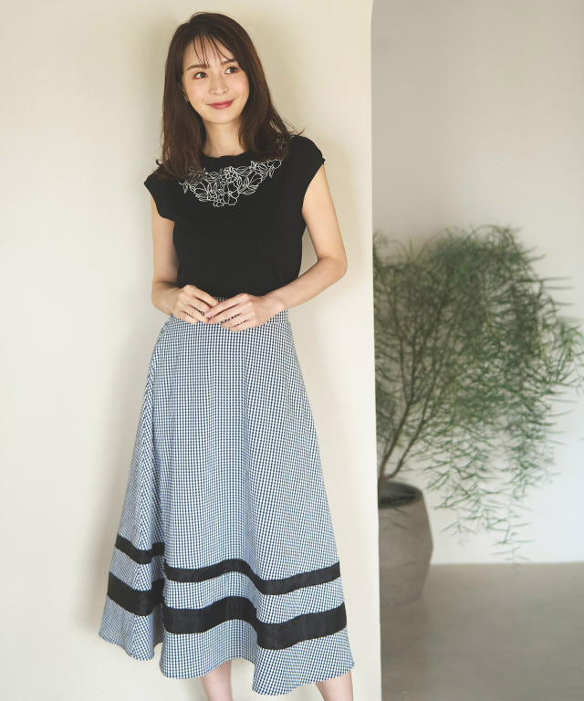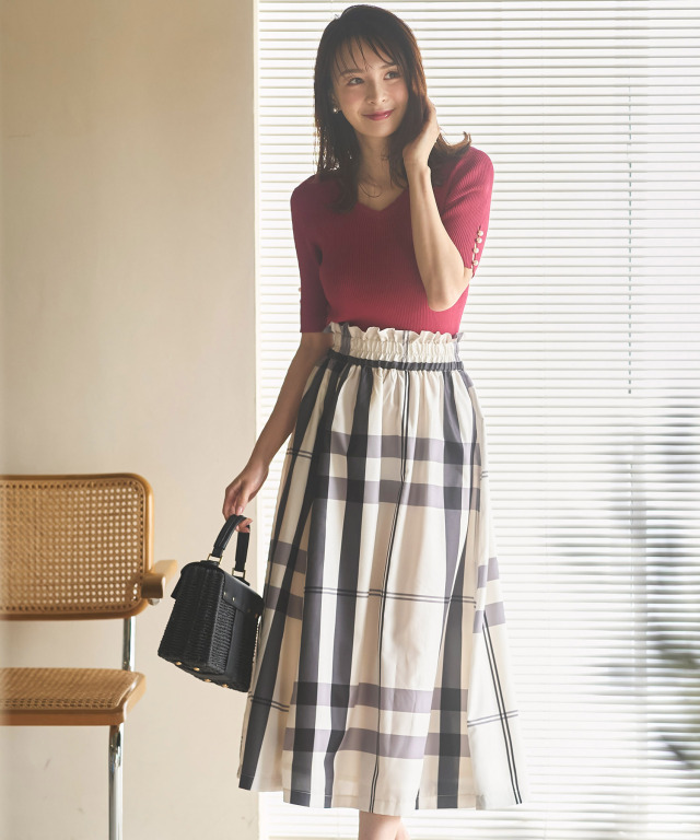 後ろリボン付きシアー切り替えチェック柄フレアスカート