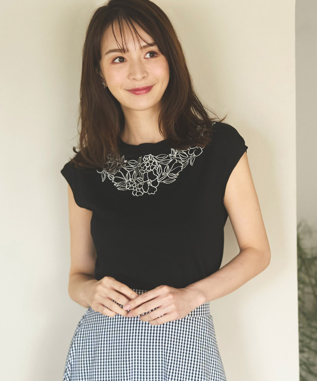 ビジュー付きフラワー刺繍シャリ感ニットプルオーバー