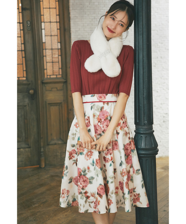 ウエスト配色ライン入りフラワープリント