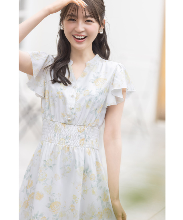 フロント飾り釦付きウエストシャーリングフラワープリントワンピース ¥5,390
