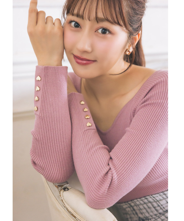 袖口ハート飾り釦付きハートネックリブニットプルオーバー