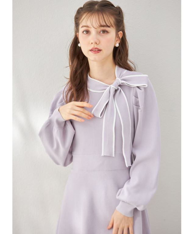配色ライン入りサイドボウタイリボン付きニットワンピース