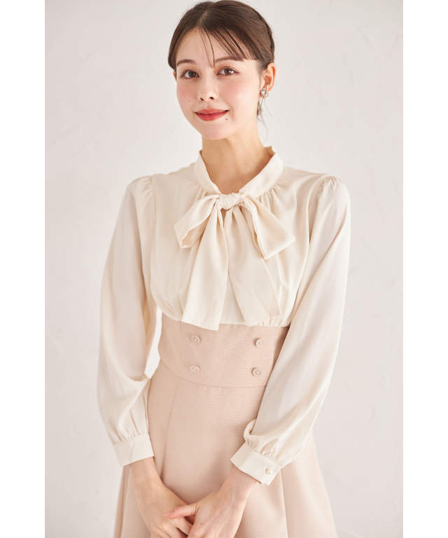 ボウタイリボン付きヨークフリルフラワープリントシャーリングプリーツワンピース