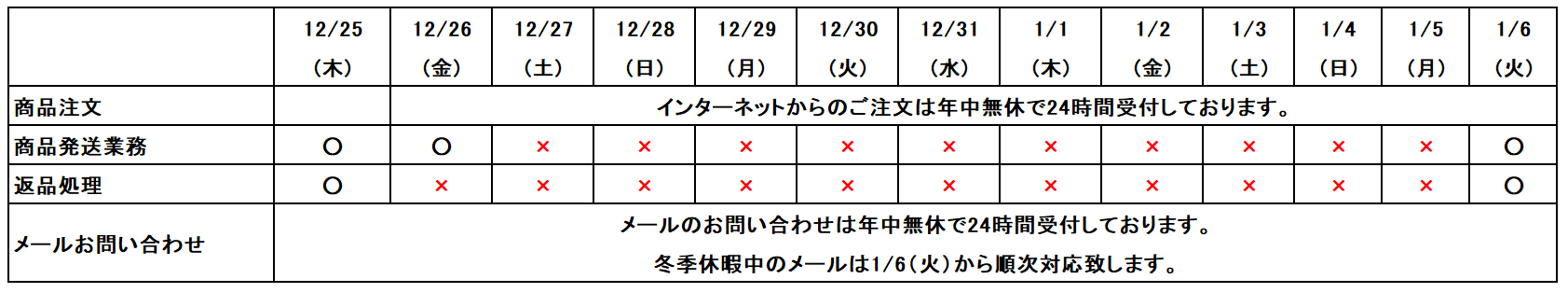 2025年12月26日(金)12時以降のメール・問い合わせフォームでのお問い合わせは、