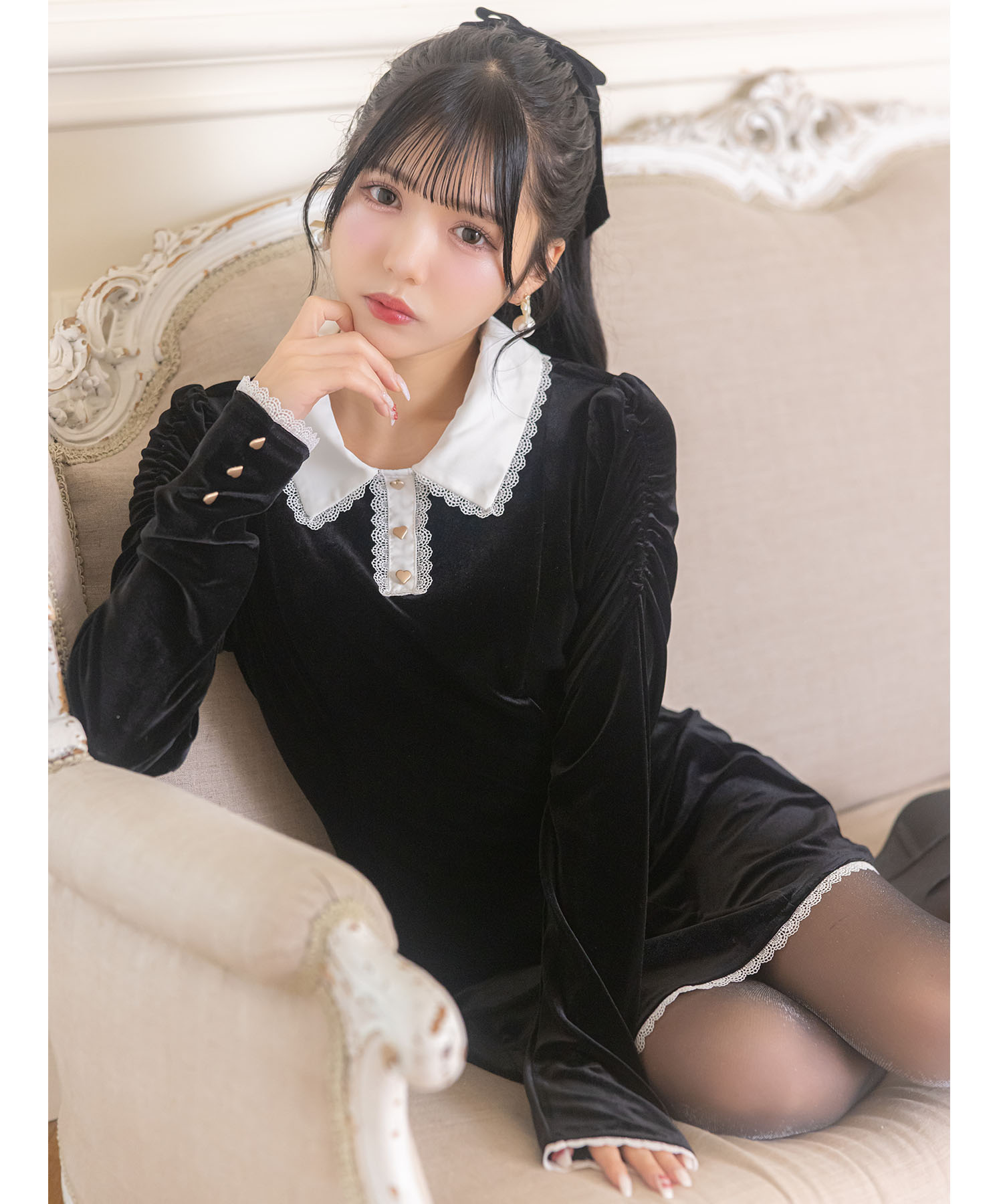 リボン付きハート飾り釦レース装飾ベロアワンピース