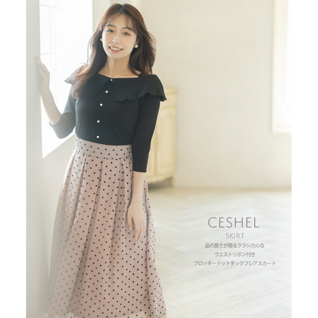 ウエストリボン付き フロッキードットタックフレアスカート¥4,290 |
