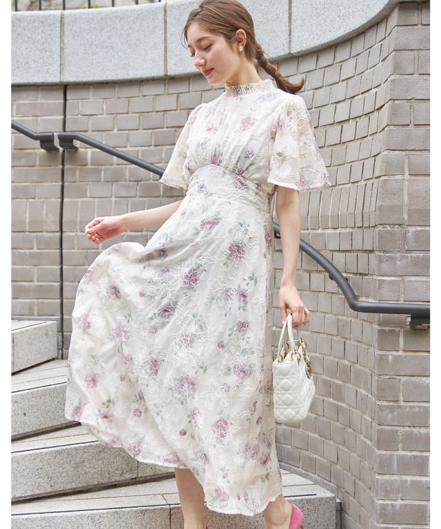 フラワー刺繍×ドットフレアスリーブシャーリングネックワンピース
