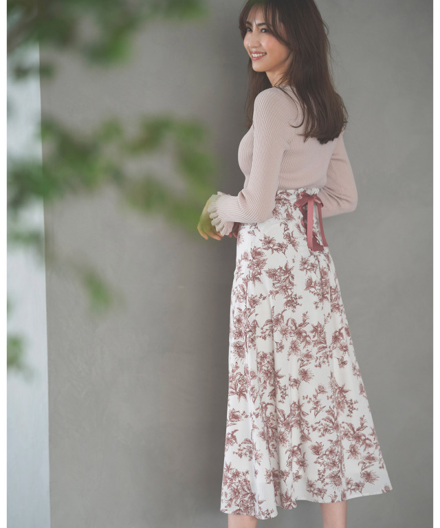 フリル&リボン付きウエストシャーリングフラワープリントワンピース