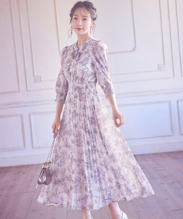 リボン付きシャーリングフラワープリントプリーツワンピース