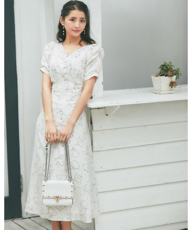 ウエストシャーリングボウタイリボンシアーフラワープリントワンピース