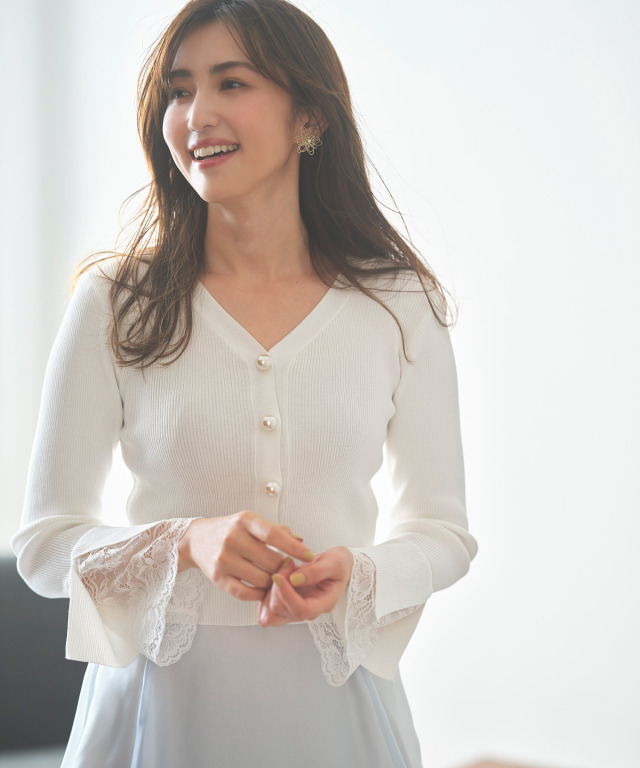 袖口レース切り替えパール釦リブニットカーディガン
