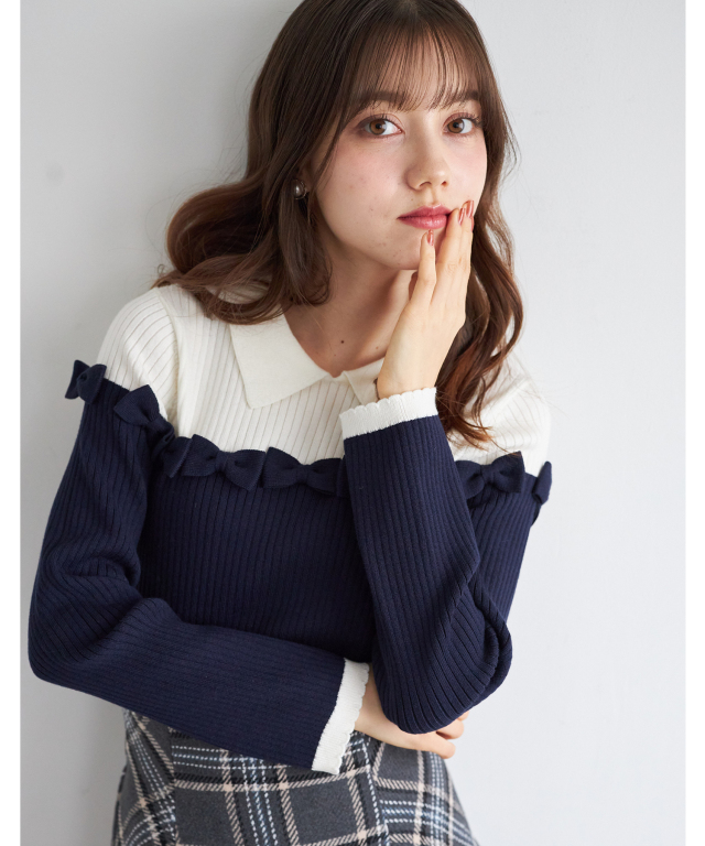襟&リボン付きバイカラーリブニットプルオーバー