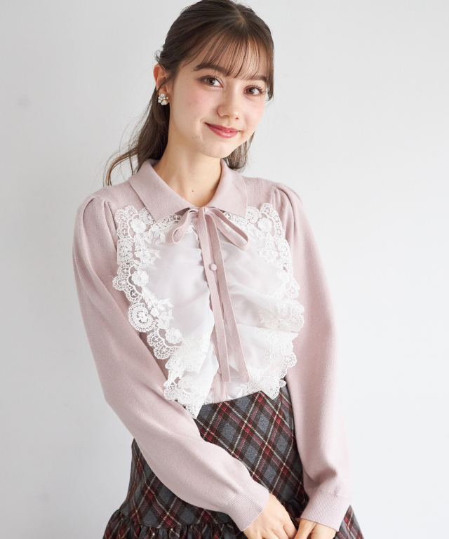 襟&リボン付きレースフリル装飾ニットプルオーバー